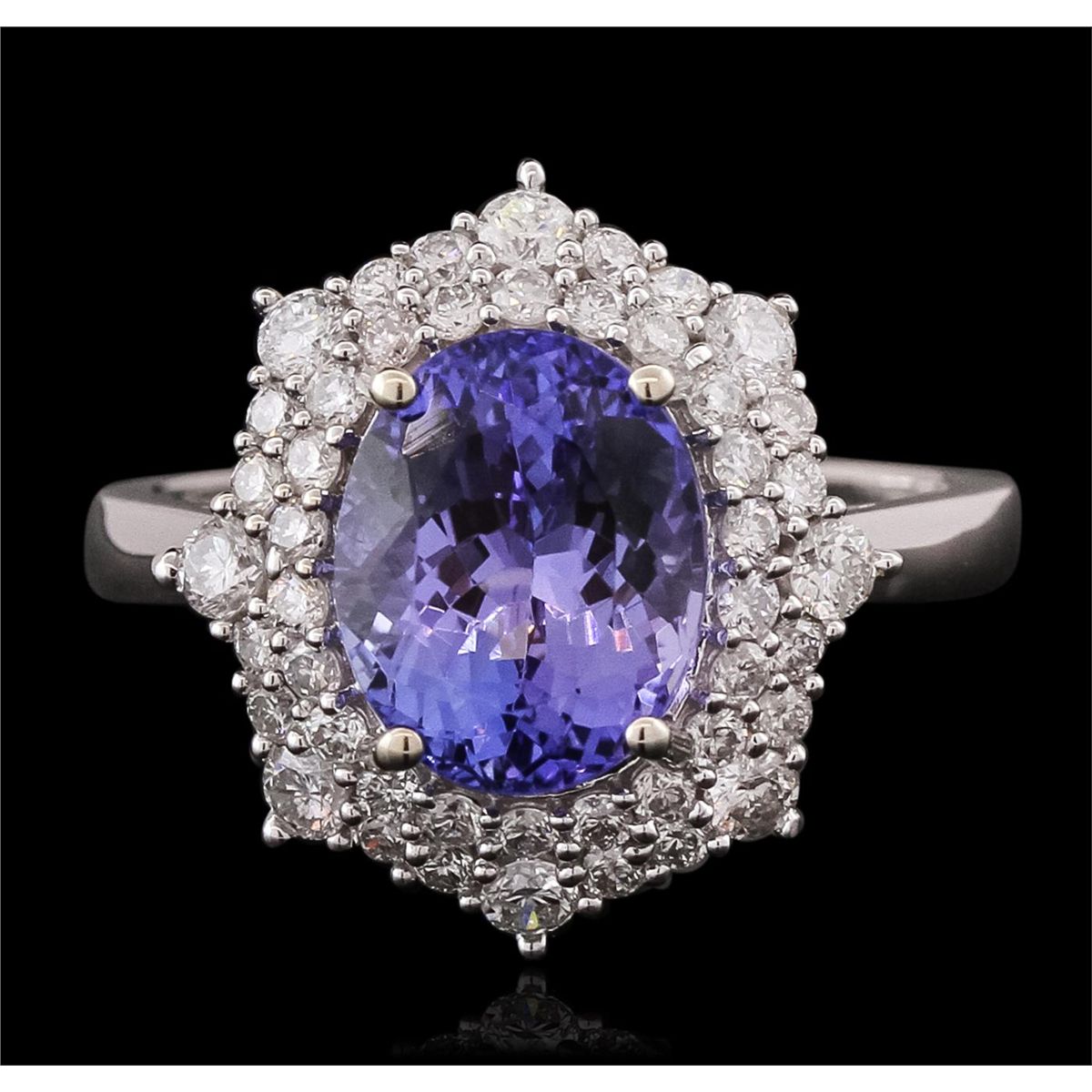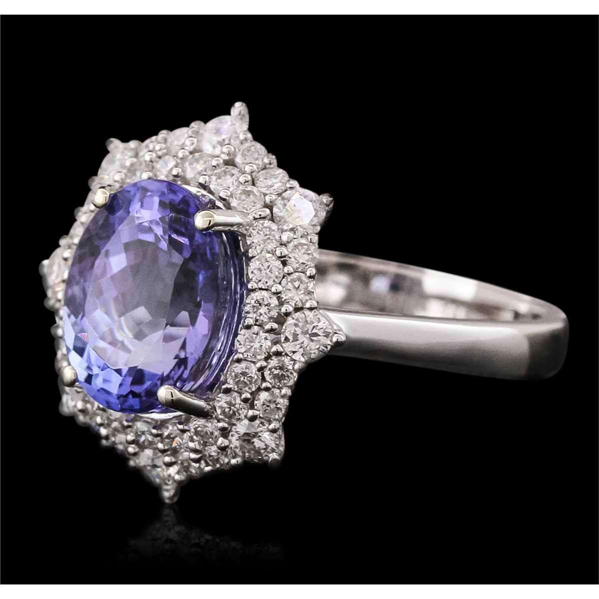 One electronically tested 14KT white gold ladies combination cast & assembled tanzanite and diamond ring with a flat shank with a bright polish finish. Identified with markings of "14K". Condition is new. Containing: One prong set oval modified brilliant cut natural tanzanite, measuring 9.85 x 7.94 x 6.58mm, approximate weight of 3.49ct., clarity is eye clean, type I, medium light, very slightly grayish, violet color, (GIA V 4/3), cut is good. Forty-Five prong set round brilliant cut diamonds, measuring 2.00 - 1.30 x 0.99mm (depth est.) approximate total weight of 45 Stones = 0.50ct. Clarity: SI-1 to I-1. Color: I - J, Cut is Good. Colored gemstones are presumed to have been subjected to commonly used enhancement processes. All diamonds and colored gemstones are graded in the mounting, unless otherwise stated. Total Weight of Colored Stones 3.49ct. Total Weight of Diamonds 0.50ct. Total Weight of Ring 3.60 grams. GGL Appraised at $7,385.00.