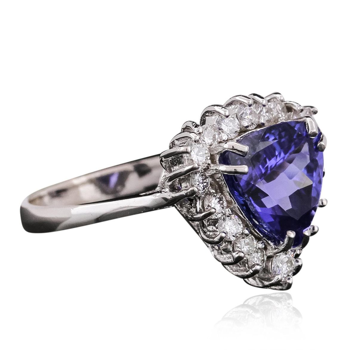 One electronically tested 14KT White Gold ladies cast tanzanite and diamond ring with a bright polish finish. The featured tanzanite is set within a diamond bezel, completed by a two and one-half millimeter wide band. Identified with markings of "K14". Condition is new, good workmanship. Containing: One prong set triangle mixed cut natural tanzanite, measuring 9.40 x 9.30 x 6.25mm, 6% bulge factor, approximate weight of 3.49ct., clarity is eye clean, type I, dark, very slightly grayish, violetish blue color, (GIA vB 7/3), cut is good. Transmitting light with no distortion, transparent. Graded in the setting. Tanzanite is a very rare gemstone that is only found in the country of Tanzania. Originally discovered in 1967. Tiffany & Company, named the stone Tanzanite. It is found in the Usumburu Mountains that border the Umba Valley of northern Tanzania. Tanzanite occurs in gray, brown, violet, blue, reddish-purple, & green. The gem is interesting because of its exceptional pleochroism. Rotated in different directions a tanzanite will exhibit multiple changes of color. Tanzanite has a low tolerance to ultrasonic cleaning, and should not be cleaned using this method. Eighteen prong set round brilliant cut diamonds, measuring 2.20 - 2.00 x 1.26mm (depth est.) approximate total weight of 18 Stones = 0.71ct. Graded in the setting. Clarity: SI-1 to I-1. Color: H - J. Total Weight of Colored Stones 3.49ct. Total Weight of Diamonds 0.71ct. Total Weight of Ring 4.38 grams. AIG Appraised at $11,455.00.