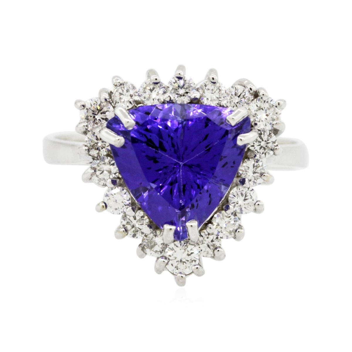 One electronically tested 14KT White Gold ladies cast tanzanite and diamond ring with a bright polish finish. The featured tanzanite is set within a diamond bezel, completed by a two and one-half millimeter wide band. Identified with markings of "K14". Condition is new, good workmanship. Containing: One prong set triangle mixed cut natural tanzanite, measuring 9.40 x 9.30 x 6.25mm, 6% bulge factor, approximate weight of 3.49ct., clarity is eye clean, type I, dark, very slightly grayish, violetish blue color, (GIA vB 7/3), cut is good. Transmitting light with no distortion, transparent. Graded in the setting. Tanzanite is a very rare gemstone that is only found in the country of Tanzania. Originally discovered in 1967. Tiffany & Company, named the stone Tanzanite. It is found in the Usumburu Mountains that border the Umba Valley of northern Tanzania. Tanzanite occurs in gray, brown, violet, blue, reddish-purple, & green. The gem is interesting because of its exceptional pleochroism. Rotated in different directions a tanzanite will exhibit multiple changes of color. Tanzanite has a low tolerance to ultrasonic cleaning, and should not be cleaned using this method. Eighteen prong set round brilliant cut diamonds, measuring 2.20 - 2.00 x 1.26mm (depth est.) approximate total weight of 18 Stones = 0.71ct. Graded in the setting. Clarity: SI-1 to I-1. Color: H - J. Total Weight of Colored Stones 3.49ct. Total Weight of Diamonds 0.71ct. Total Weight of Ring 4.38 grams. AIG Appraised at $11,455.00.