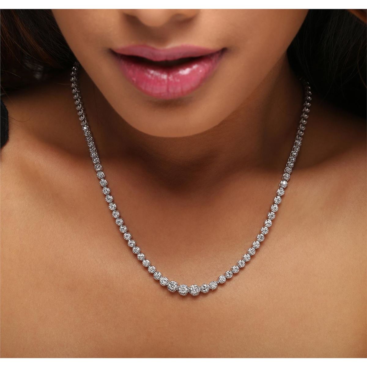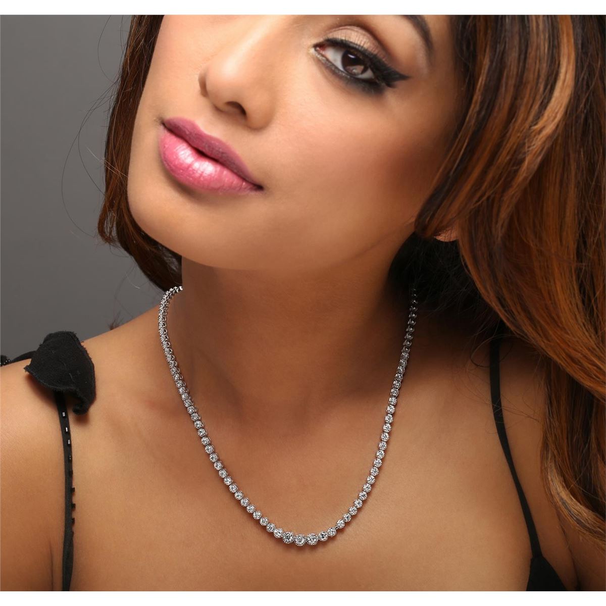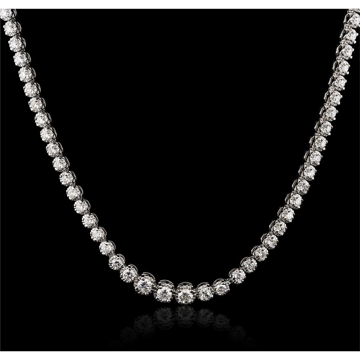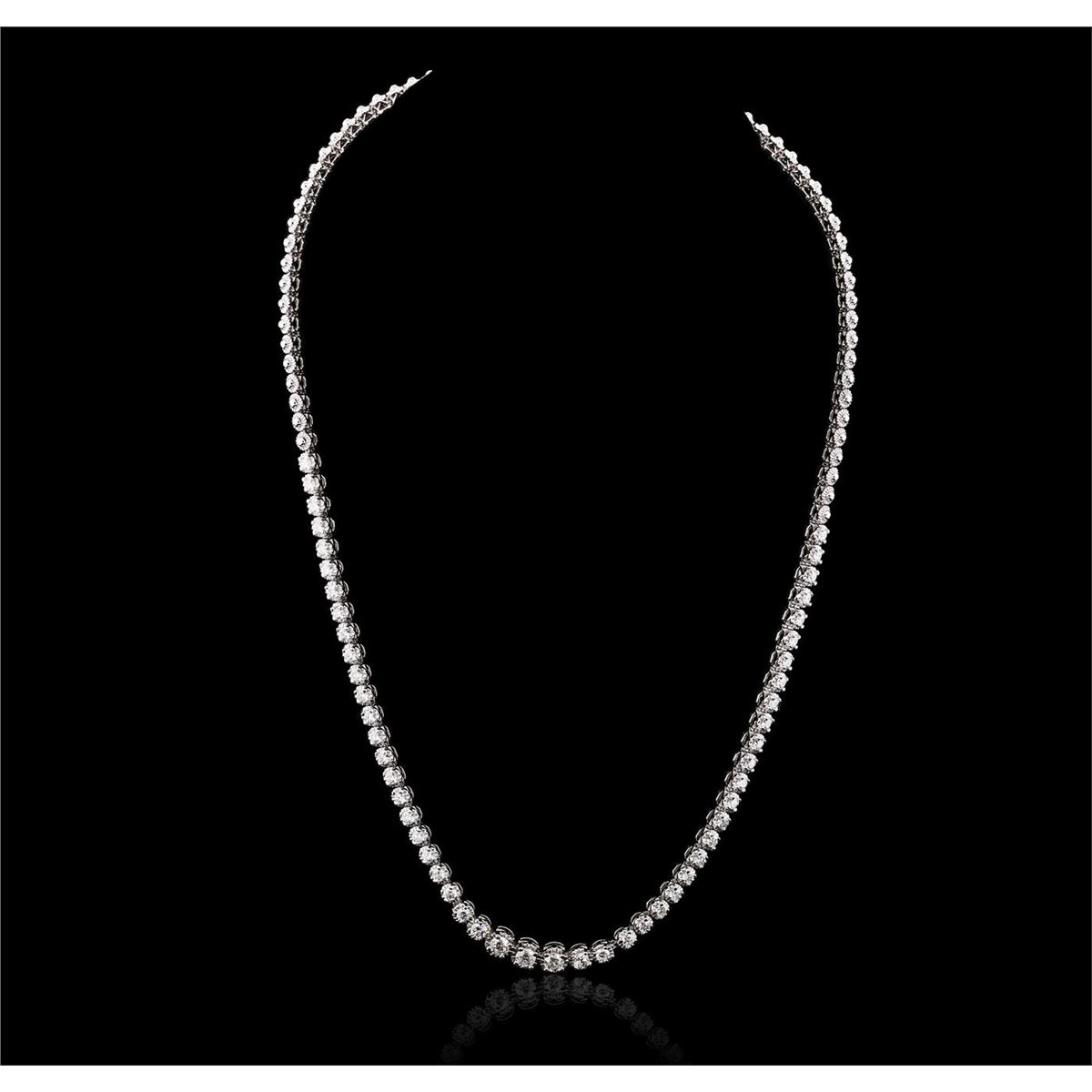 One electronically tested 14KT white gold ladies combination cast & assembled diamond necklace with a hidden box clasp with safety closer with a bright polish finish. Measurements: 16.50 in length. Identified with markings of 14K. Condition is new. Containing: Fifty-Three prong set round brilliant cut diamonds, measuring 3.60 - 2.40 x 1.80mm (depth est.) approximate total weight of 53 Stones = 3.49ct. Clarity: SI-1 to I-2. Color: I - J, Cut is Good. All diamonds are graded in the mounting, unless otherwise stated. Total Weight of Diamonds 3.49ct. Total Weight of Necklace 27.80 grams. GGL Appraised at $12,540.00.