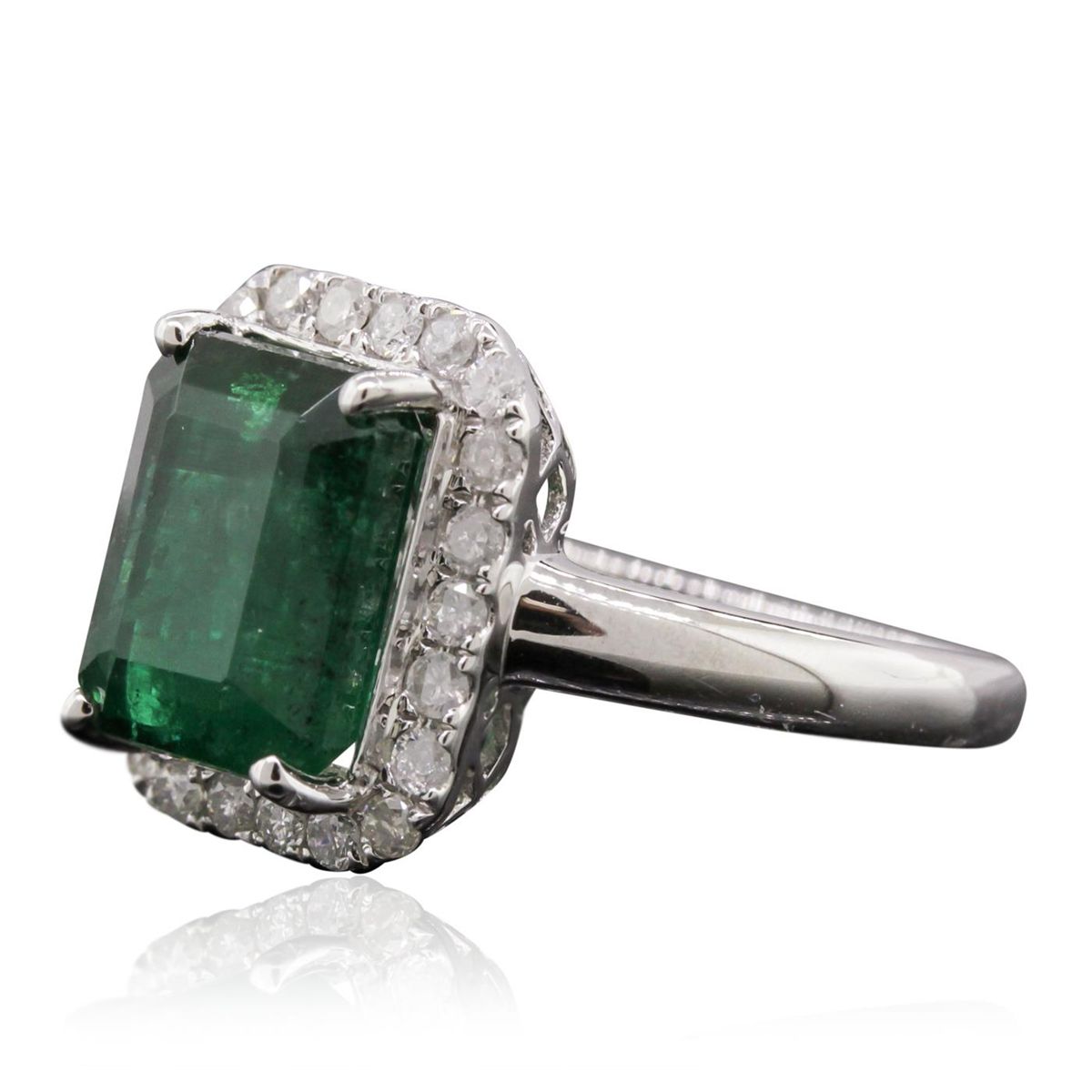One electronically tested 14KT white gold Ladies cast ring with a bright polish finish. Condition is new. Identified with markings of "14K". Containing: One prong set emerald standard step cut natural emerald, measuring 10.00 x 8.00 x 5.95mm, approximate weight of 3.50ct., clarity is heavily included, type III, medium, moderately strong, green color, (GIA G 5/4), cut is good. Colored gemstones are presumed to have been subjected to commonly used color/clarity enhancement processes. Twenty-Two prong set round brilliant cut diamonds, measuring 1.50 - 1.50 x 0.90mm (depth est.) approximate. Total Weight of 22 Stones = 0.27ct. Clarity: I-1 to I-2. Color: H - I, Cut is Good. All grading of diamonds and colored gemstones in this piece of jewelry are graded in the mounting, unless otherwise stated. Total Weight of Colored Stones 3.50ct. Total Weight of Diamonds 0.27ct. Total Weight of Ring 4.30 grams. GGL Appraised at $8,780.00.