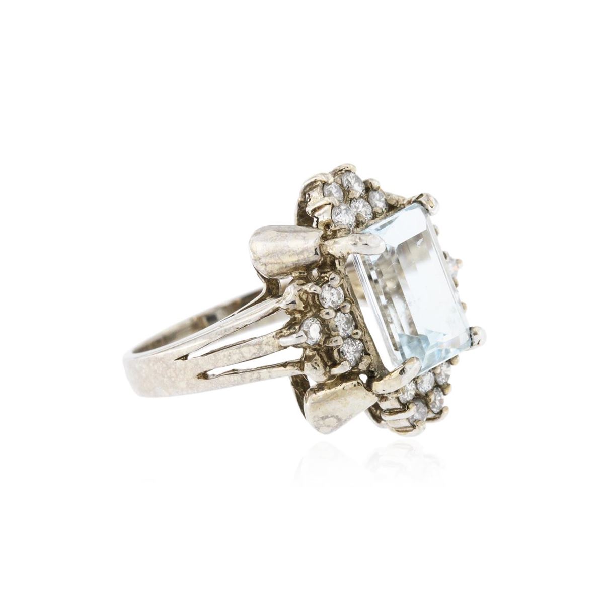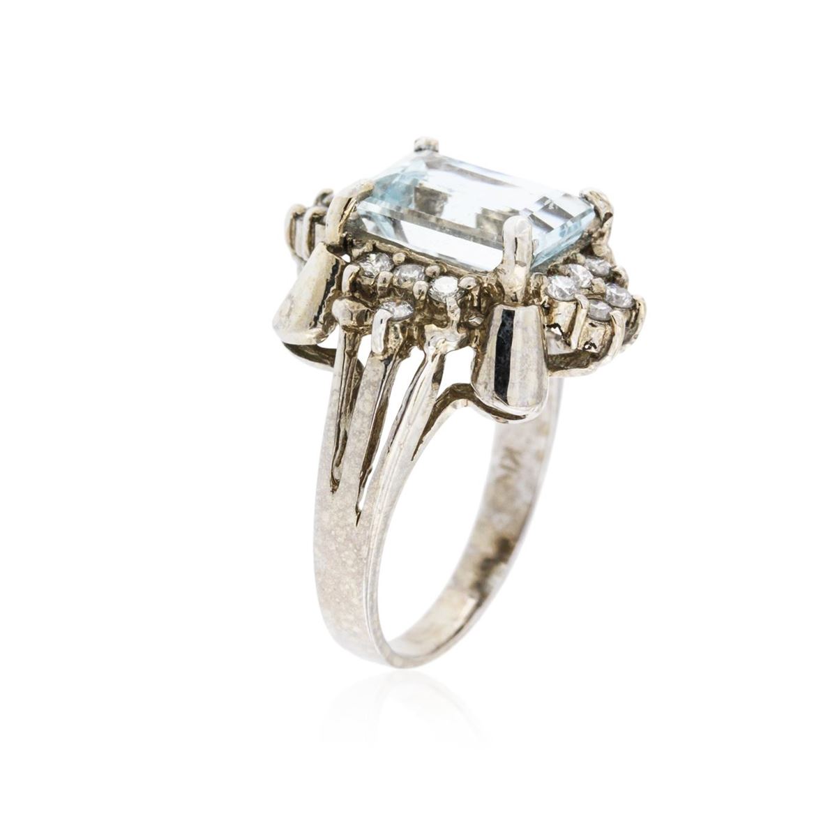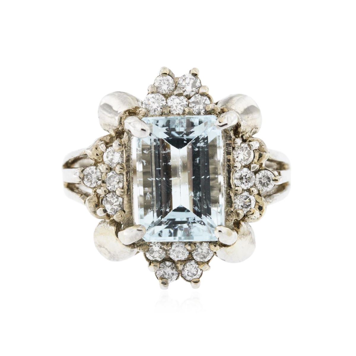 One electronically tested 14KT white gold ladies cast aquamarine and diamond ring with a bright polish finish. Condition is new, good workmanship. The featured aquamarine is set within a diamond bezel completed by a three millimeter wide band. Identified with markings of "14K". Containing: One prong set rectangular step cut natural aquamarine, measuring 10.05 x 7.20 x 5.40mm, 10%. bulge factor, approximate weight of 3.51ct., clarity is slightly included, type I, light, very slightly grayish, very slightly greenish blue color, (GIA vslgB 3/3), cut is good. Transmitting light with a minimum of distortion, transparent. Naturally occurring internal & external characteristics are present. Refractive index testing results of 1.56 to 1.57. This is a conclusive result for aquamarine. Graded in the setting. Eighteen prong set round brilliant cut diamonds, measuring 2.00 - 1.70 x 1.13mm (depth est.) approximate. Total Weight of 18 Stones = 0.52ct. Graded in the setting. Clarity: I-1 to I-2. Color: G - I. Total Weight of Colored Stones 3.51ct. Total Weight of Diamonds 0.52ct. Total Weight of Ring 6.26 grams. AIG Appraised at $3,710.00.