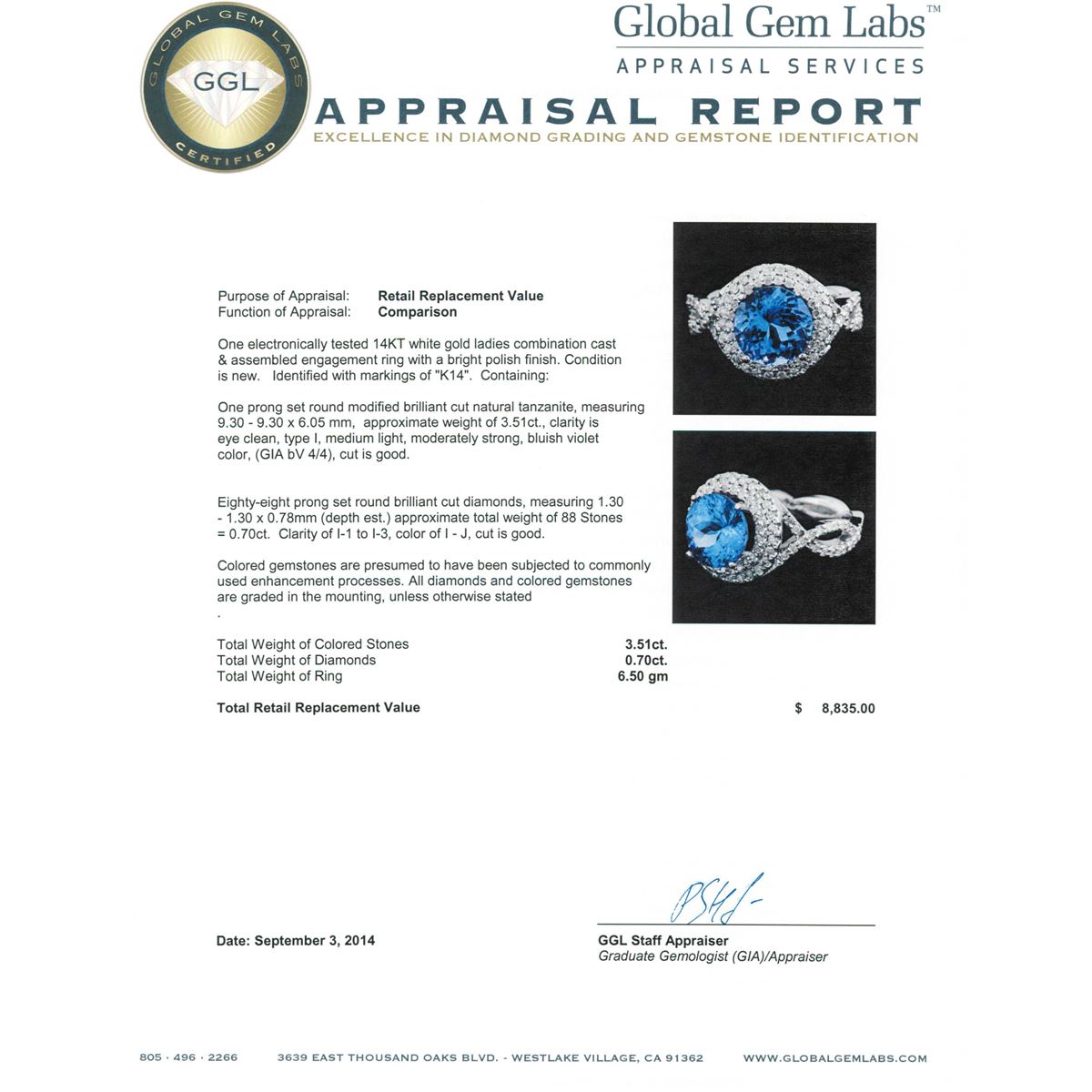 One electronically tested 14KT white gold ladies combination cast & assembled engagement ring with a bright polish finish. Identified with markings of "K14". Condition is new. Containing: One prong set round modified brilliant cut natural tanzanite, measuring 9.30 - 9.30 x 6.05 mm, approximate weight of 3.51ct., clarity is eye clean, type I, medium light, moderately strong, bluish violet color, (GIA bV 4/4), cut is good. Eighty-Eight prong set round brilliant cut diamonds, measuring 1.30 - 1.30 x 0.78mm (depth est.) approximate total weight of 88 Stones = 0.70ct. Clarity: I-1 to I-3. Color: I - J, Cut is Good. Colored gemstones are presumed to have been subjected to commonly used enhancement processes. All diamonds and colored gemstones are graded in the mounting, unless otherwise stated. Total Weight of Colored Stones 3.51ct. Total Weight of Diamonds 0.70ct. Total Weight of Ring 6.50 grams. GGL Appraised at $8,835.00.