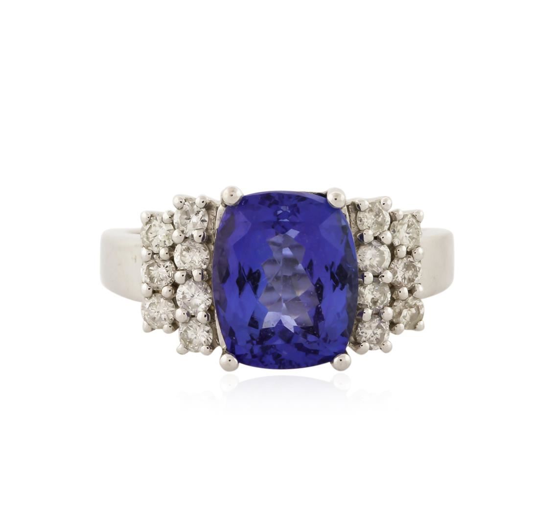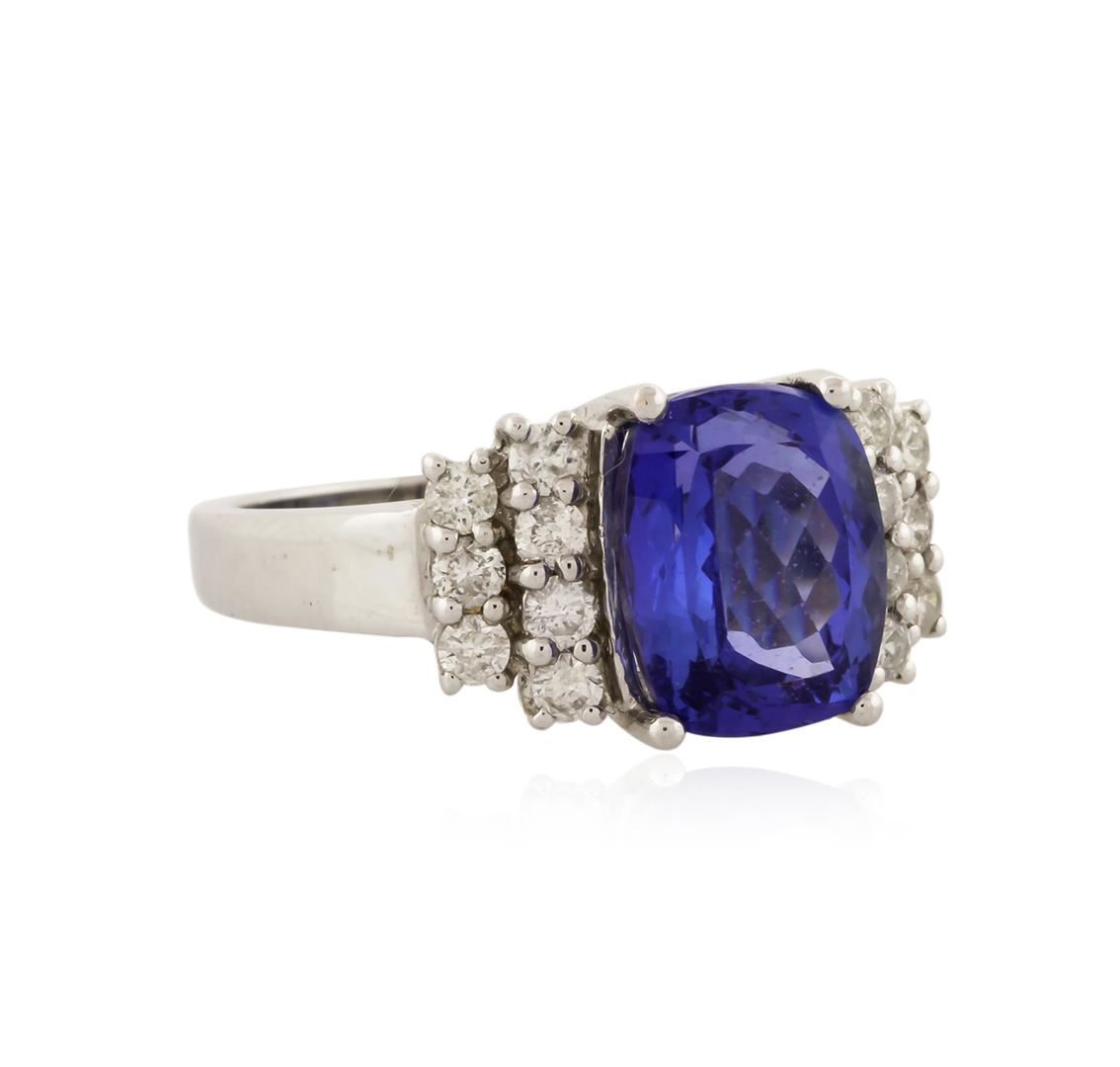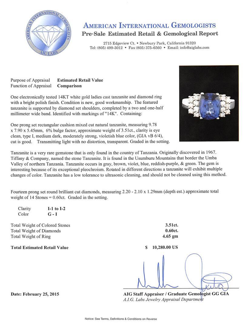 One electronically tested 14KT white gold ladies cast tanzanite and diamond ring with a bright polish finish. The featured tanzanite is supported by diamond set shoulders, completed by a two and one-half millimeter wide band. Identified with markings of "14K". Condition is new, good workmanship. Containing: One prong set rectangular cushion mixed cut natural tanzanite, measuring 9.78 x 7.90 x 5.45mm, 6%. bulge factor, approximate weight of 3.51ct., clarity is eye clean, type I, medium dark, moderately strong, violetish blue color, (GIA vB 6/4), cut is good. Transmitting light with no distortion, transparent. Graded in the setting. Tanzanite is a very rare gemstone that is only found in the country of Tanzania. Originally discovered in 1967. Tiffany & Company, named the stone Tanzanite. It is found in the Usumburu Mountains that border the Umba Valley of northern Tanzania. Tanzanite occurs in gray, brown, violet, blue, reddish-purple, & green. The gem is interesting because of its exceptional pleochroism. Rotated in different directions a tanzanite will exhibit multiple changes of color. Tanzanite has a low tolerance to ultrasonic cleaning, and should not be cleaned using this method. Fourteen prong set round brilliant cut diamonds, measuring 2.20 - 2.10 x 1.29mm (depth est.) approximate total weight of 14 Stones = 0.60ct. Graded in the setting. Clarity: I-1 to I-2. Color: G - I. Total Weight of Colored Stones 3.51ct. Total Weight of Diamonds 0.60ct. Total Weight of Ring 4.65 grams. AIG Appraised at $10,280.00.