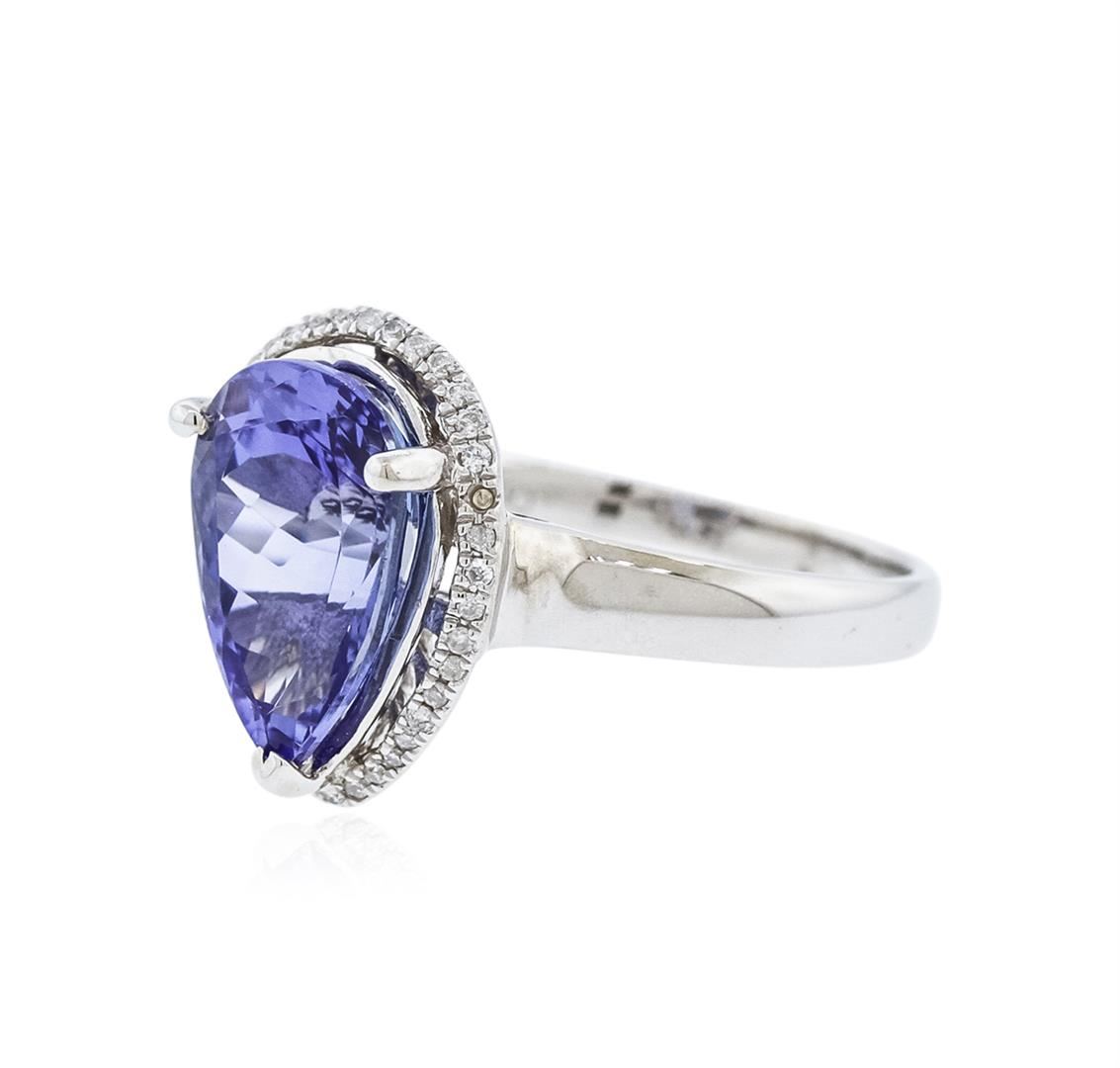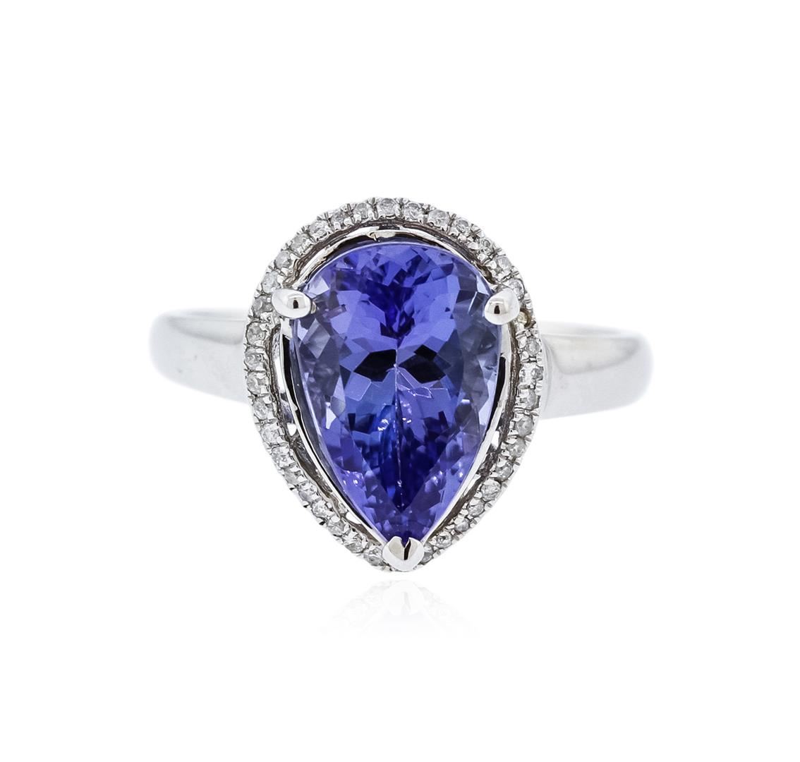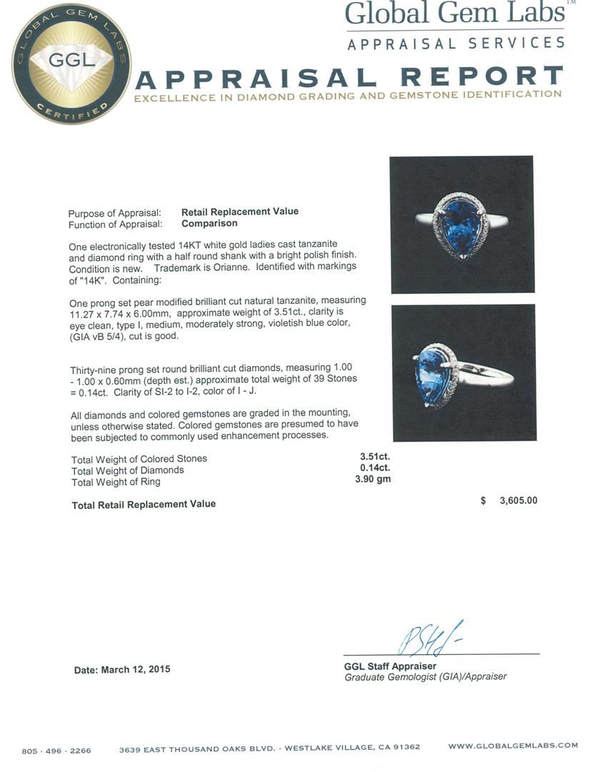 One electronically tested 14KT white gold ladies cast tanzanite and diamond ring with a half round shank with a bright polish finish. Trademark is Orianne. Identified with markings of "14K". Condition is new. Containing: One prong set pear modified brilliant cut natural tanzanite, measuring 11.27 x 7.74 x 6.00mm, approximate weight of 3.51ct., clarity is eye clean, type I, medium, moderately strong, violetish blue color, (GIA vB 5/4), cut is good. Thirty-Nine prong set round brilliant cut diamonds, measuring 1.00 - 1.00 x 0.60mm (depth est.) approximate total weight of 39 Stones = 0.14ct. Clarity: SI-2 to I-2. Color: I - J. All diamonds and colored gemstones are graded in the mounting, unless otherwise stated. Colored gemstones are presumed to have been subjected to commonly used enhancement processes. Total Weight of Colored Stones 3.51ct. Total Weight of Diamonds 0.14ct. Total Weight of Ring 3.90 grams. GGL Appraised at $3,605.00.