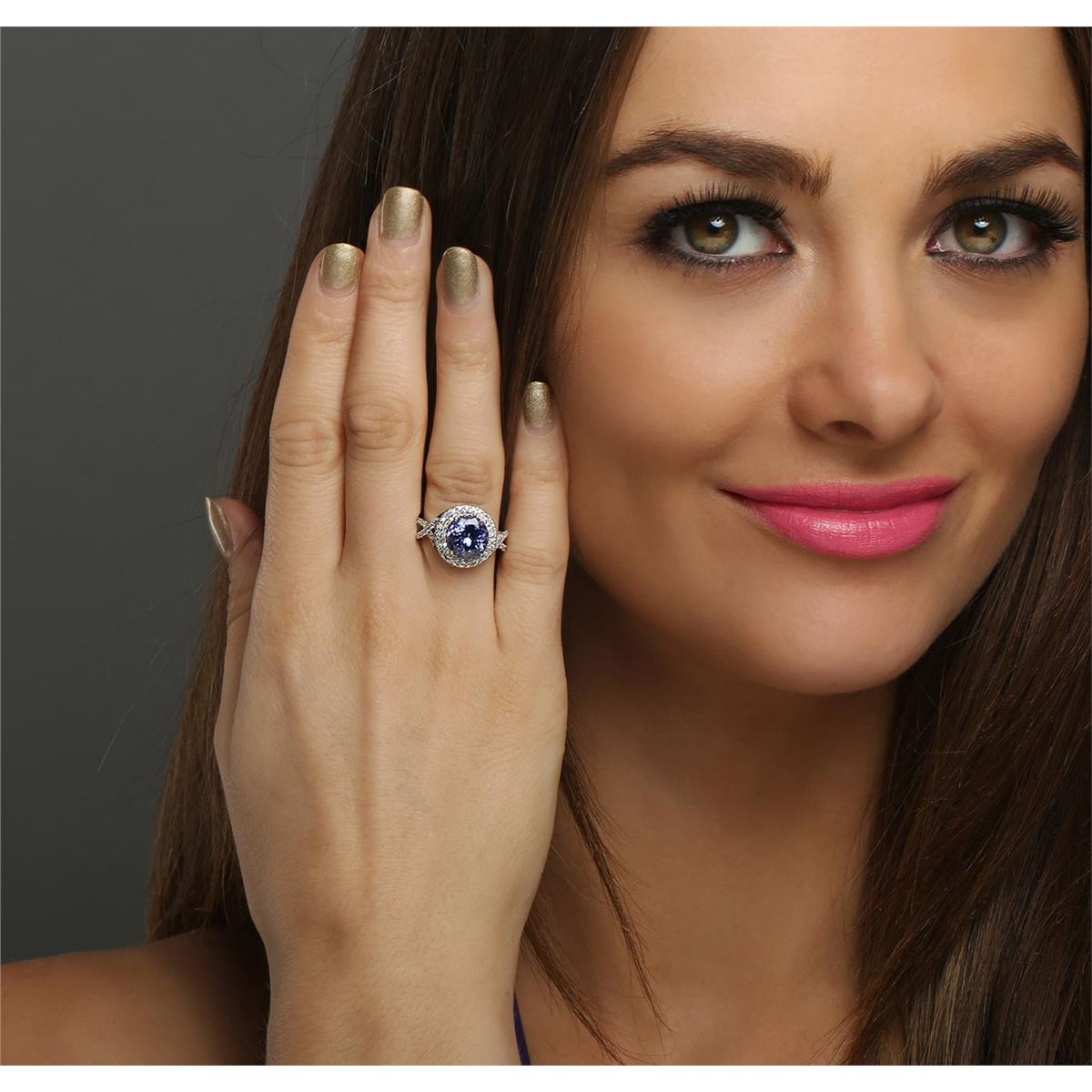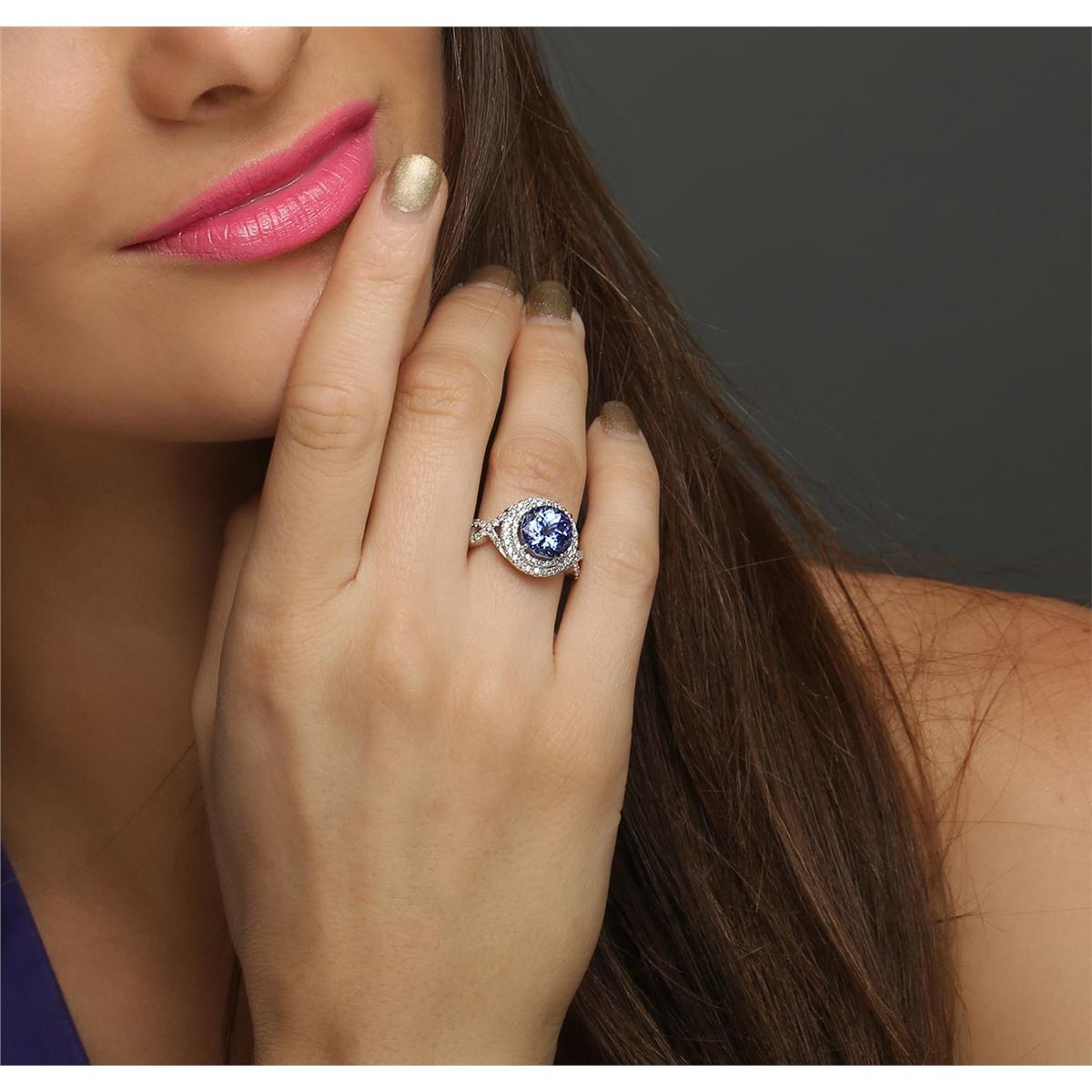 One electronically tested 14KT white gold ladies combination cast & assembled engagement ring with a bright polish finish. Identified with markings of "K14". Condition is new. Containing: One prong set round modified brilliant cut natural tanzanite, measuring 9.30 - 9.30 x 6.05 mm, approximate weight of 3.51ct., clarity is eye clean, type I, medium light, moderately strong, bluish violet color, (GIA bV 4/4), cut is good. Eighty-Eight prong set round brilliant cut diamonds, measuring 1.30 - 1.30 x 0.78mm (depth est.) approximate total weight of 88 Stones = 0.70ct. Clarity: I-1 to I-3. Color: I - J, Cut is Good. Colored gemstones are presumed to have been subjected to commonly used enhancement processes. All diamonds and colored gemstones are graded in the mounting, unless otherwise stated. Total Weight of Colored Stones 3.51ct. Total Weight of Diamonds 0.70ct. Total Weight of Ring 6.50 grams. GGL Appraised at $8,835.00.