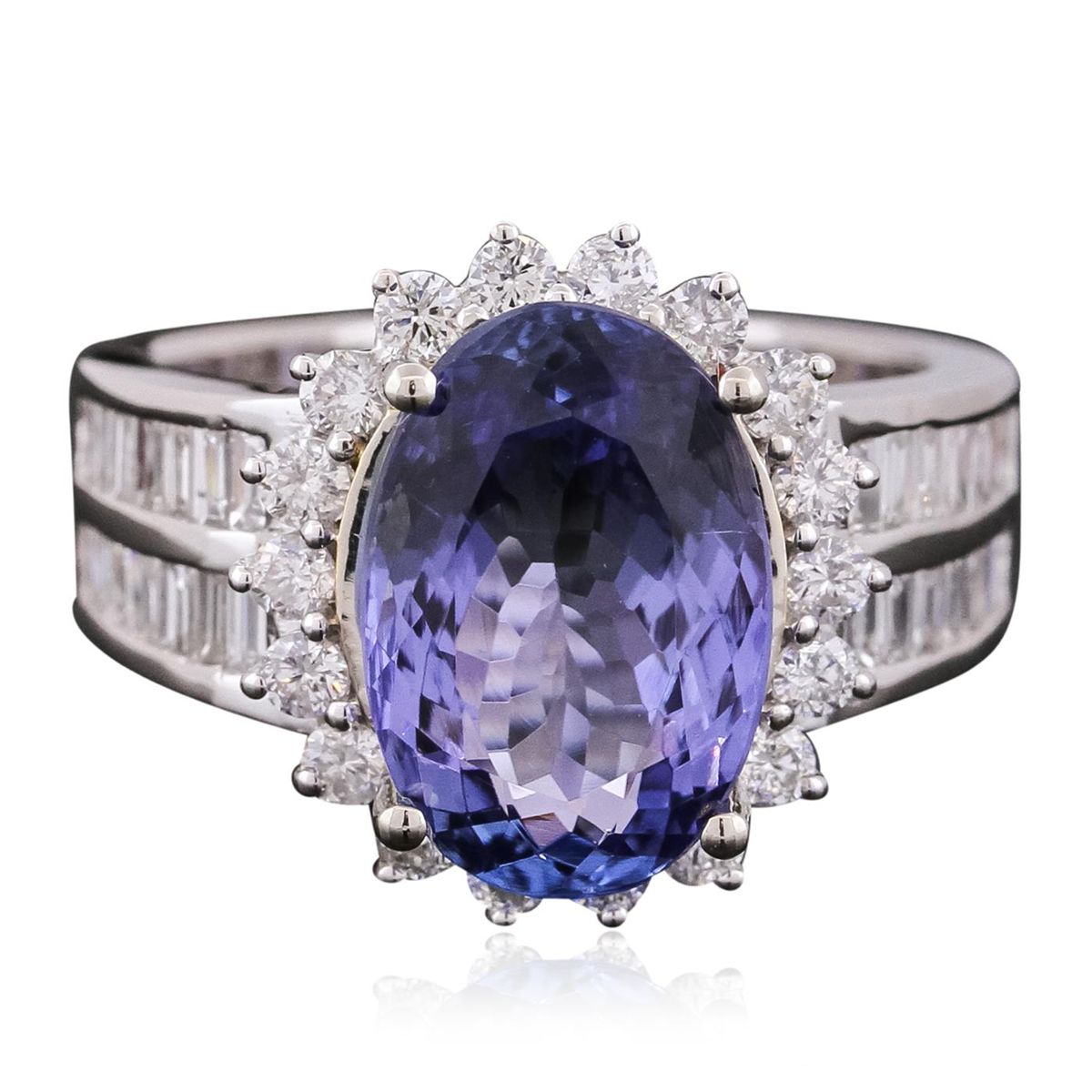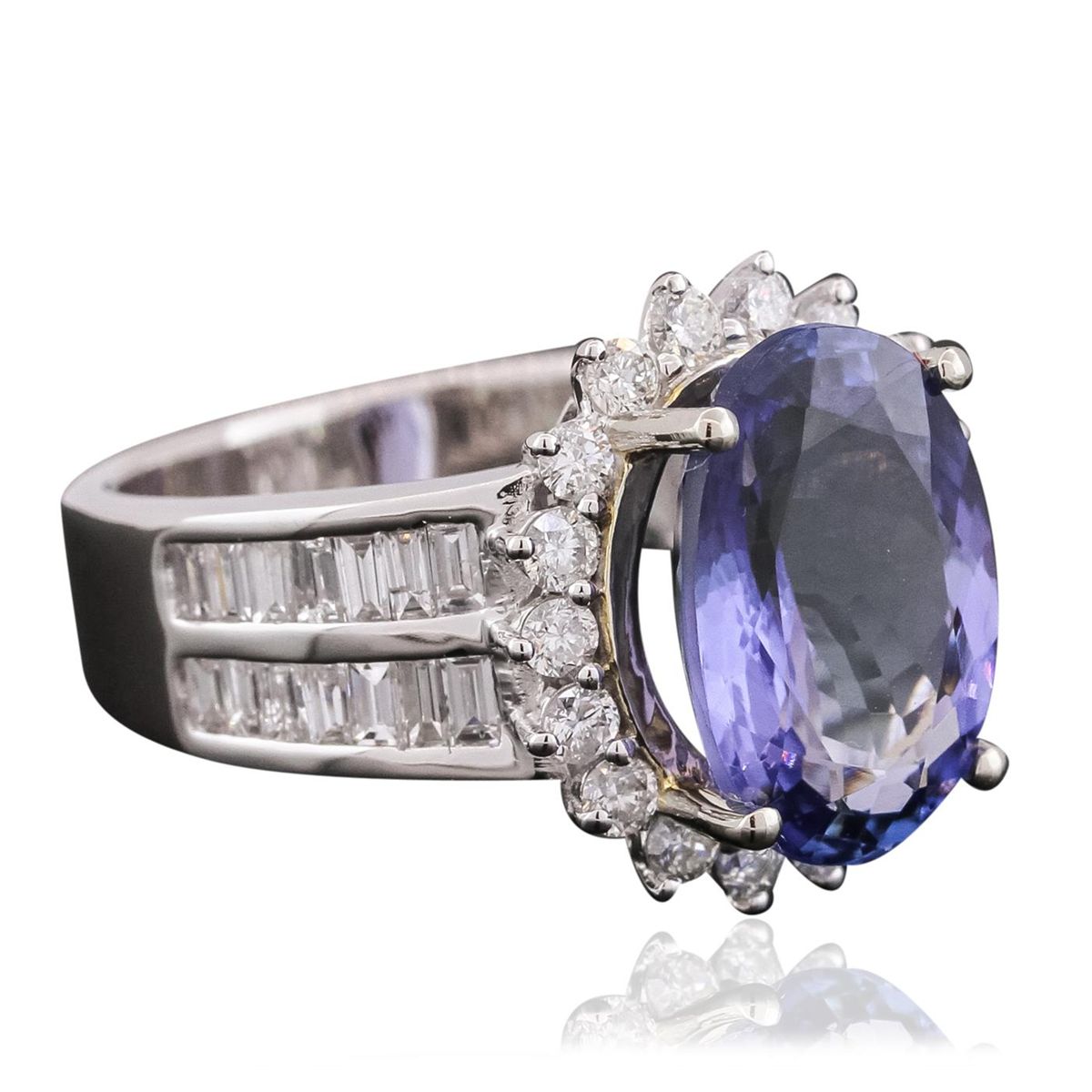One electronically tested 14KT white gold ladies combination cast & assembled ring with a bright polish finish. Identified with markings of "14K". Condition is new. Containing: One prong set oval modified brilliant cut natural tanzanite, measuring 13.10 x 8.97 x 4.32mm, approximate weight of 3.52ct., clarity is eye clean, type I, medium, moderately strong, bluish violet color, (GIA bV 5/4), cut is good. Eighteen prong set round brilliant cut diamonds, measuring 2.00 - 2.00 x 1.20mm (depth est.) approximate total weight of 18 Stones = 0.53ct. Clarity: SI-2. Color: H - I, Cut is Good. Twenty-Eight channel set baguette cut diamonds, measuring from 1.80 x 1.30 x 1.11mm (depth est.) to 2.00 x 1.50 x 1.28mm (depth est.) approximate total weight of 28 Stones = 0.81ct. Clarity: SI-1. Color: I - J, Cut is Good. Colored gemstones are presumed to have been subjected to commonly used enhancement processes. All diamonds and colored gemstones are graded in the mounting, unless otherwise stated. Total Weight of Colored Stones 3.52ct. Total Weight of Diamonds 1.34ct. Total Weight of Ring 7.20 grams. GGL Appraised at $9,405.00.