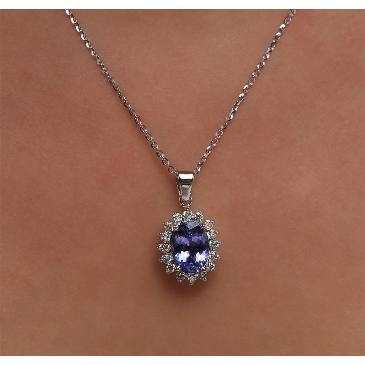 One electronically tested 14KT white gold ladies combination cast & assembled tanzanite and diamond pendant & chain 18.0" long, cable link with a lobster claw clasp with a bright polish finish. Identified with markings of "14K". Condition is new. Containing: One prong set oval modified brilliant cut natural tanzanite, measuring 11.20 x 8.11 x 5.25mm, exact weight 3.53ct., clarity is eye clean, type I, medium, moderately strong, violet color, (GIA V 5/4), cut is good. Sixteen prong set round brilliant cut diamonds, measuring 2.00 - 2.00 x 1.20mm (depth est.) approximate total weight of 16 Stones = 0.47ct. Clarity: SI-1 to SI-2. Color: J - K, Cut is Good. All diamonds and colored gemstones are graded in the mounting, unless otherwise stated. Colored gemstones are presumed to have been subjected to commonly used enhancement processes. Total Weight of Colored Stones 3.53ct. Total Weight of Diamonds 0.47ct. Total Weight of Pendant & Chain 7.00 grams. GGL Appraised at $6,460.00.