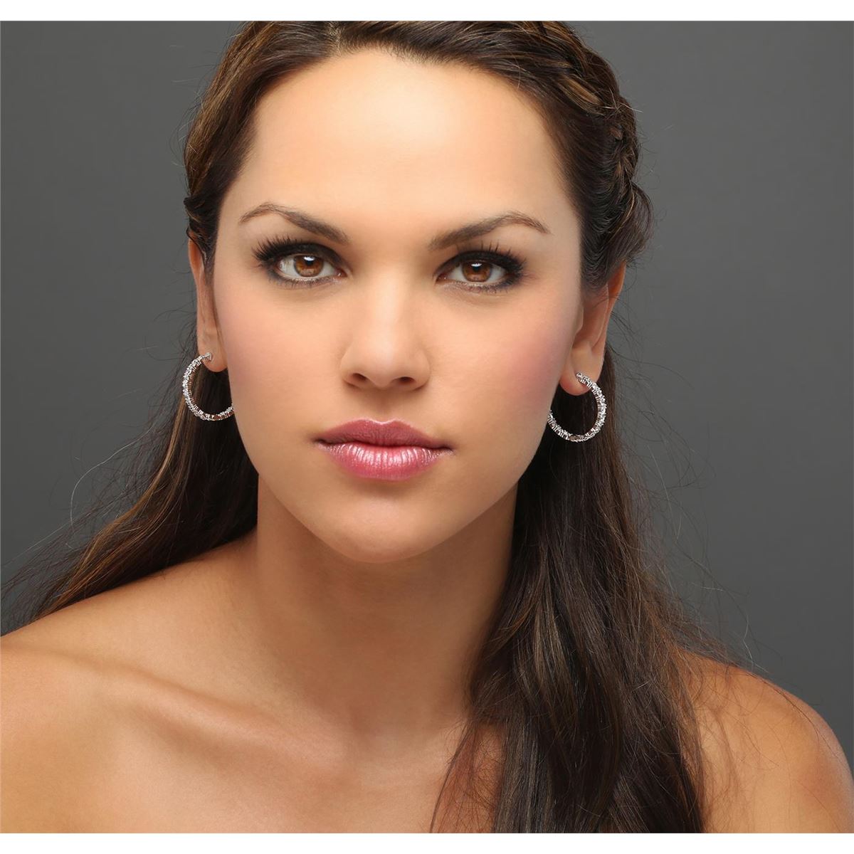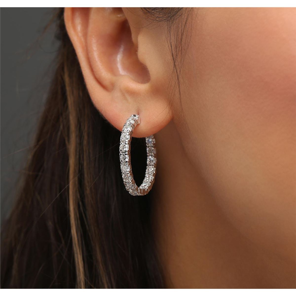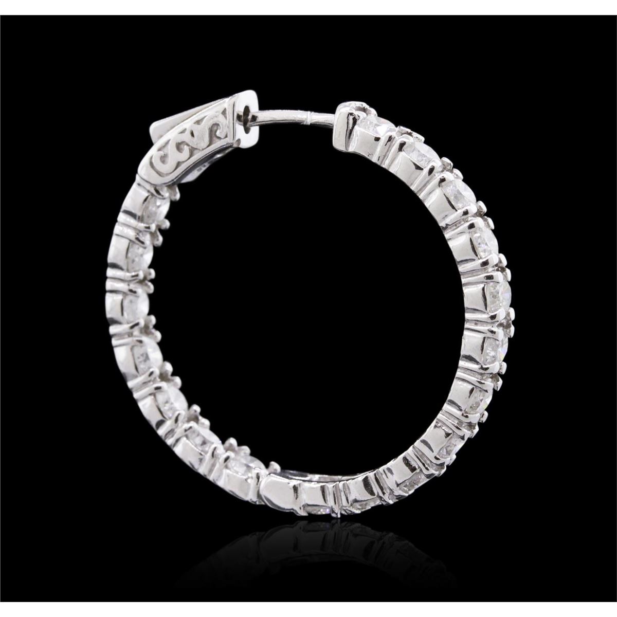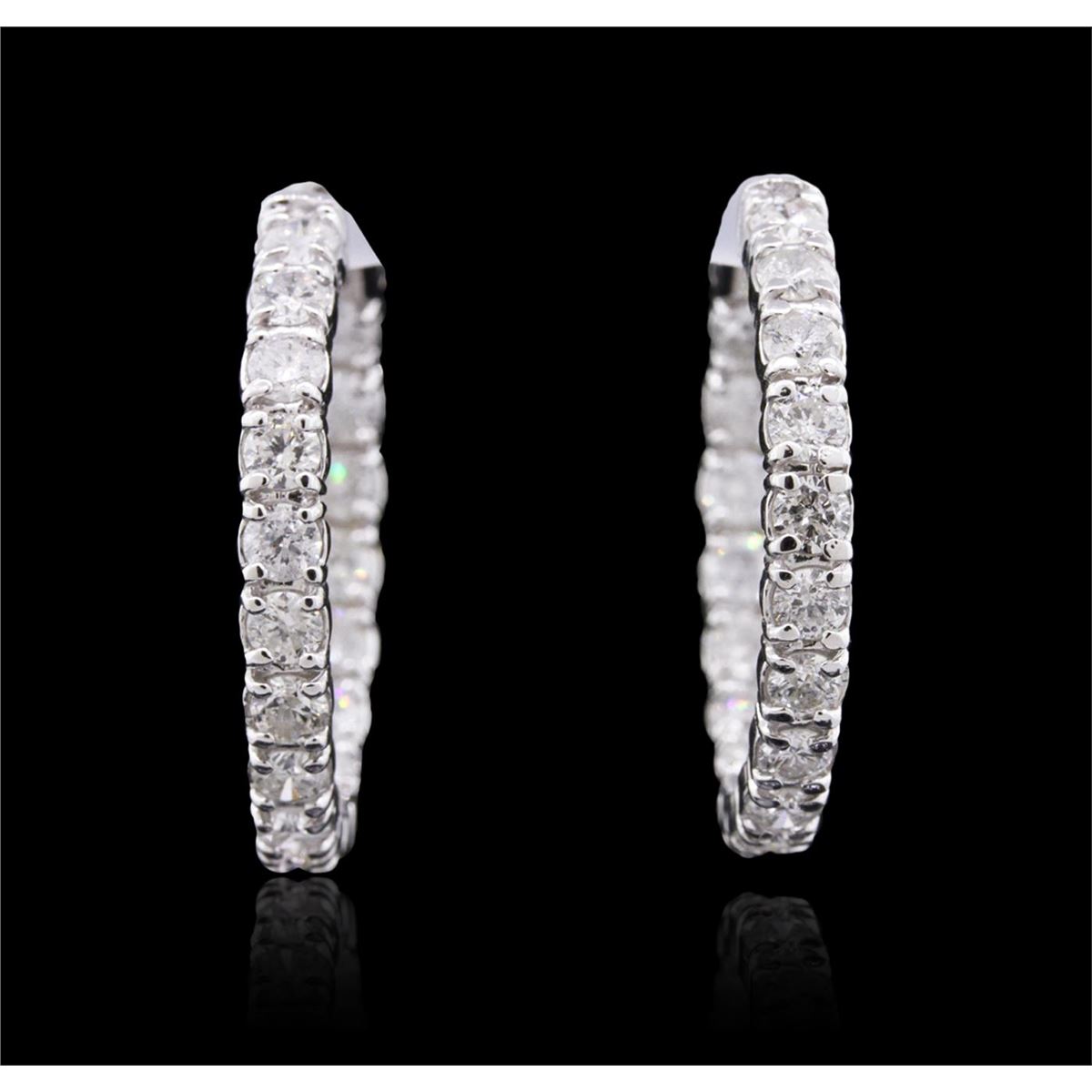 One pair electronically tested 14KT white gold ladies combination cast & assembled hoop earrings with hinged clip backs with a bright polish finish. Identified with markings of "14K". Condition is new. Containing: Thirty-Six prong set round brilliant cut diamonds, measuring 3.00 - 3.00 x 1.80mm (depth est.) approximate total  weight of 36 Stones = 3.56ct. Clarity: I-1 to I-2. Color: I - J, Cut is Good. All diamonds are graded in the mounting, unless otherwise stated. Total Weight of Diamonds 3.56ct. Total Weight of Earrings 9.40 grams. GGL Appraised at $7,175.00.