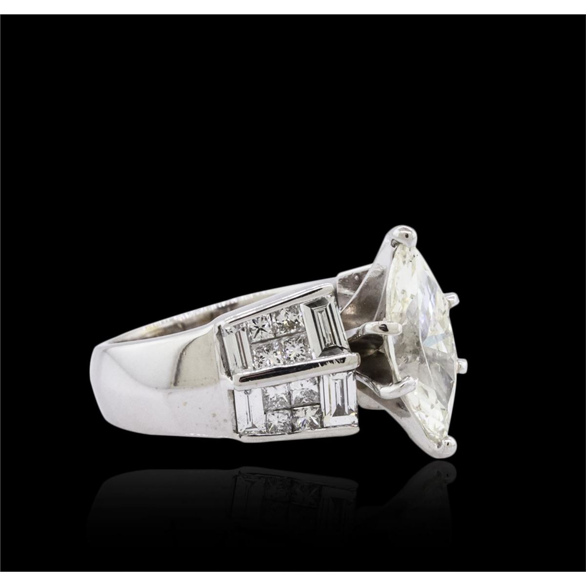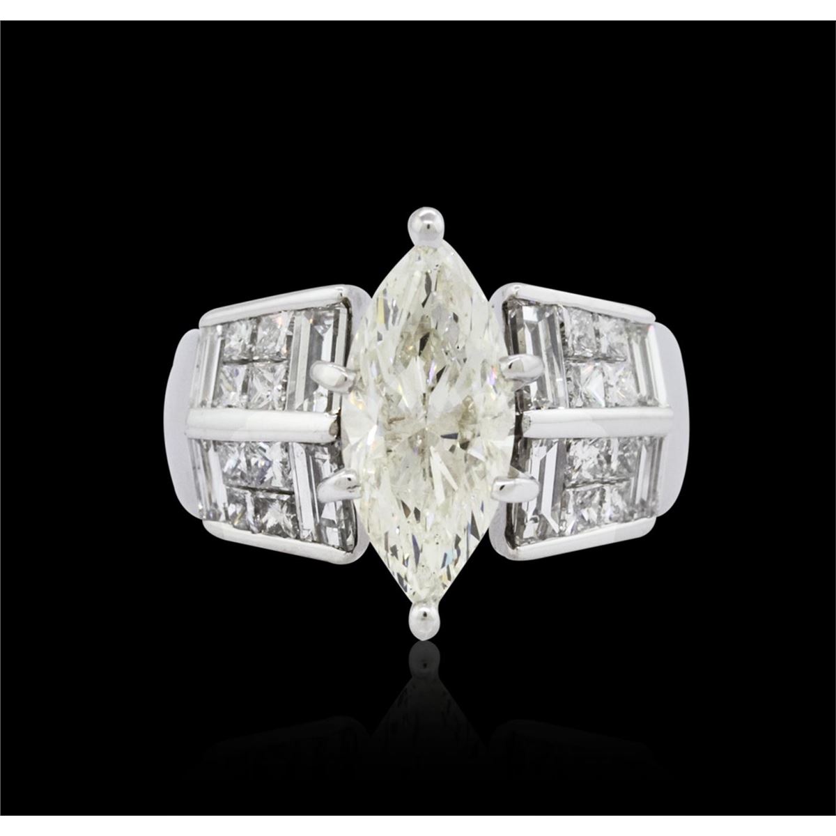 One electronically tested 14KT white gold ladies cast diamond unity ring with a bright polish finish. The featured diamond is supported by tapering diamond set shoulders, completed by a four millimeter wide band. Identified with markings of "14K". Condition is new, good workmanship. Containing: One prong set marquise shaped cut diamond, measuring 13.20 x 6.00 x 3.80mm (depth est.) approximate weight of 1.86ct with a strong blue fluorescence. Graded in the setting. Clarity: I-1. Color: 63.3%. Table 58.3%. Sixteen channel set princess cut diamonds, measuring 2.00 x 1.90 x 1.43mm (depth est.) approximate total weight of 16 Stones = 0.81ct. Graded in the setting. Clarity: SI-1 to SI-2. Color: G - I Eight channel set baguette cut diamonds, measuring from 3.70 x 1.90 x 1.33mm (depth est.) to 4.20 x 2.30 x 1.61mm (depth est.) approximate total weight of 8 Stones = 0.90ct. Graded in the setting. Clarity: VS-1 to VS-2. Color: G - I. Total Weight of Diamonds 3.57ct. Total Weight of Ring 10.22 grams. AIG Appraised at $19,835.00.