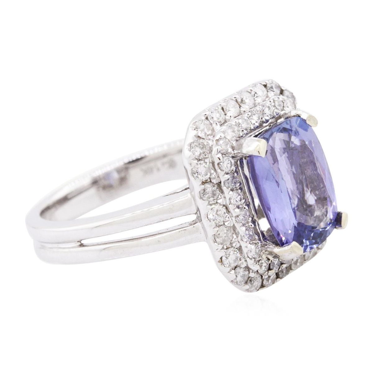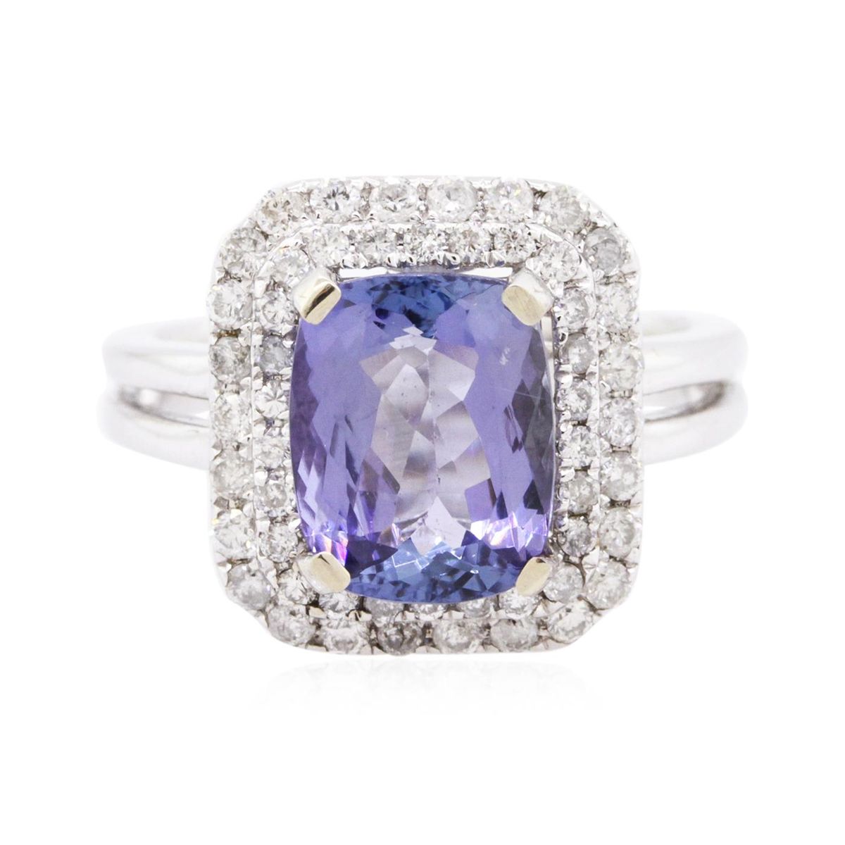 One electronically tested 14KT white gold ladies combination cast & assembled tanzanite and diamond ring with a split shank with a bright polish finish. Identified with markings of "14K". Condition is new. Containing: One prong set rectangular cushion modified brilliant cut natural tanzanite, measuring 10.37 x 8.20 x 5.33mm, approximate weight of 3.57ct., clarity is eye clean, type I, medium light, very slightly grayish, violet color, (GIA V 4/3), cut is good. Fifty-Two prong set round brilliant cut diamonds, measuring 1.50 - 1.40 x 0.87mm (depth est.) approximate total weight of 52 Stones = 0.58ct. Clarity: I-1 to I-2. Color: I - J, Cut is Good. All colored gemstones are graded in the mounting, unless otherwise stated. All diamonds and colored gemstones are graded in the mounting, unless otherwise stated. Total Weight of Colored Stones 3.57ct. Total Weight of Diamonds 0.58ct. Total Weight of Ring 6.60 grams. GGL Appraised at $8,130.00.