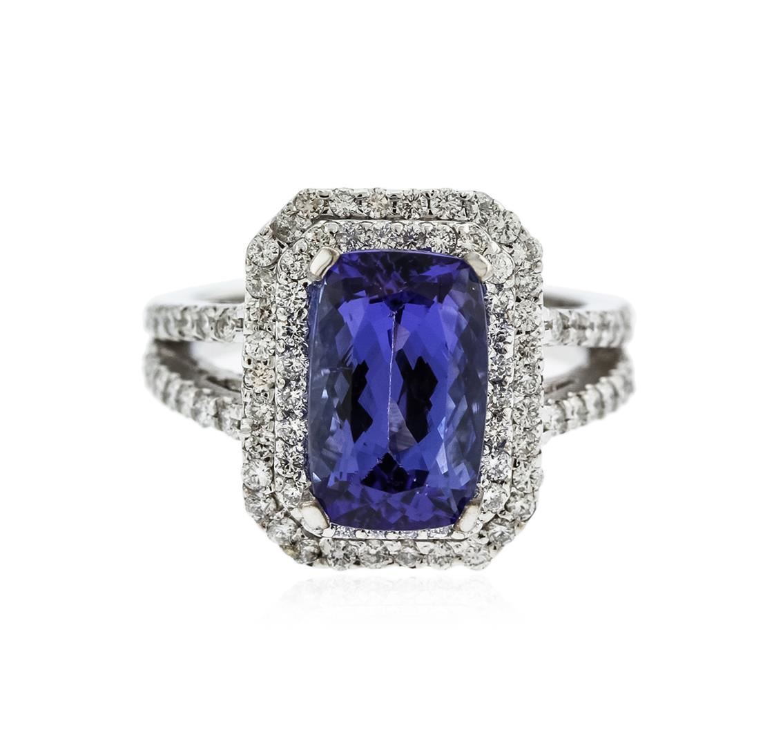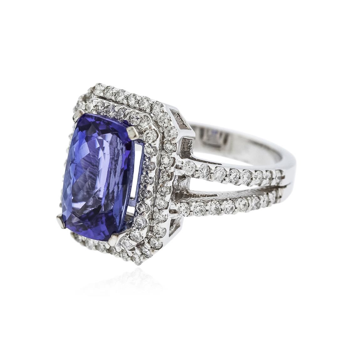 One electronically tested 14KT white gold ladies cast tanzanite and diamond ring with a bright polish finish. Identified with markings of "K14". Condition is new. Containing: One prong set rectangular cushion modified brilliant cut natural tanzanite, measuring 12.10 x 7.60 x 4.94mm, approximate weight of 3.58ct., clarity is eye clean, type I, medium light, very slightly grayish, violet color, (GIA V 4/3), cut is good. Ninety-Four prong set round brilliant cut diamonds, measuring 1.50 - 1.30 x 0.84mm (depth est.) approximate total weight of 94 Stones = 0.94ct. Clarity: SI-1 to I-1. Color: H - I, Cut is Good. Colored gemstones are presumed to have been subjected to commonly used enhancement processes. All diamonds and colored gemstones are graded in the mounting, unless otherwise stated. Total Weight of Colored Stones 3.58ct. Total Weight of Diamonds 0.94ct. Total Weight of Ring 8.30 grams. GGL Appraised at $5,510.00.