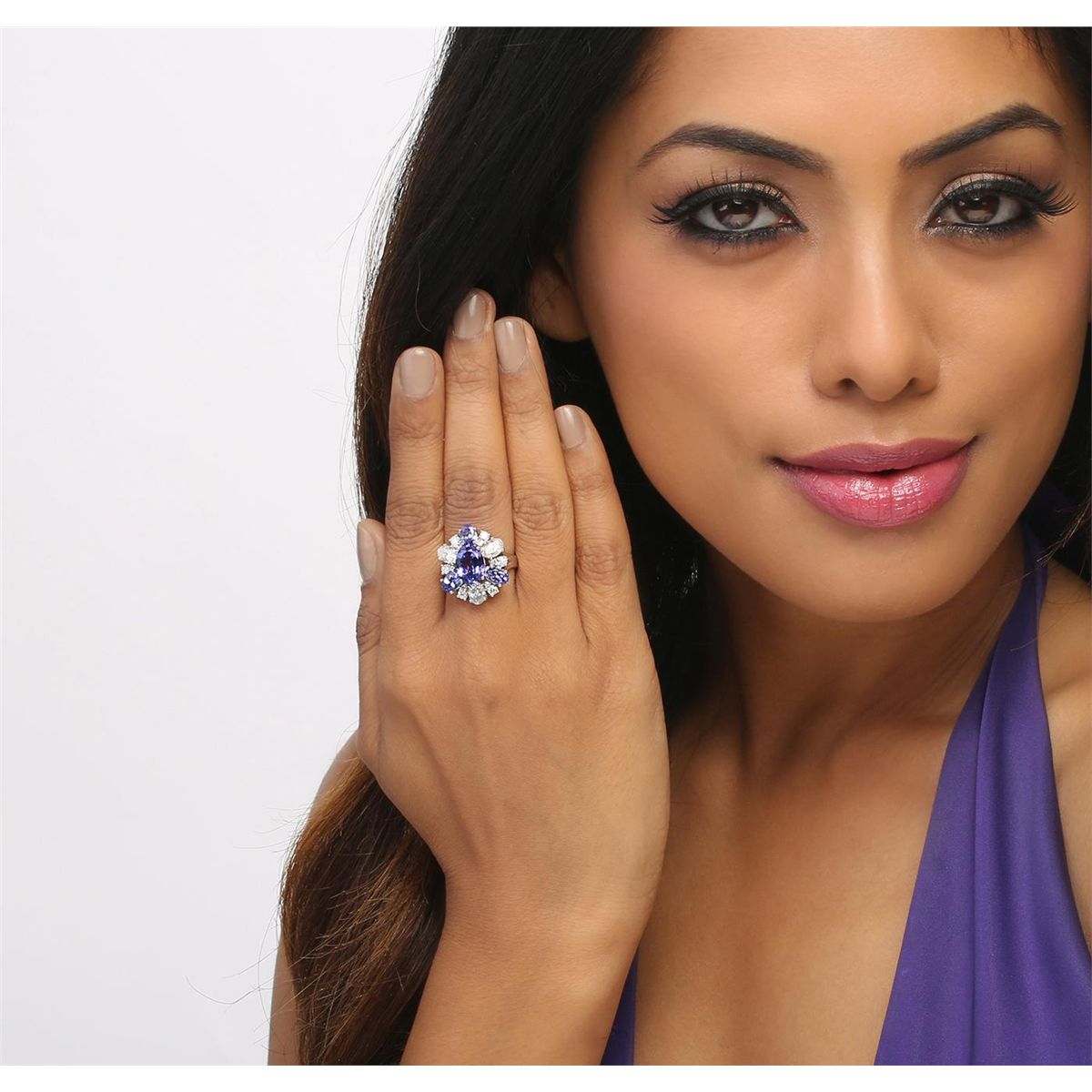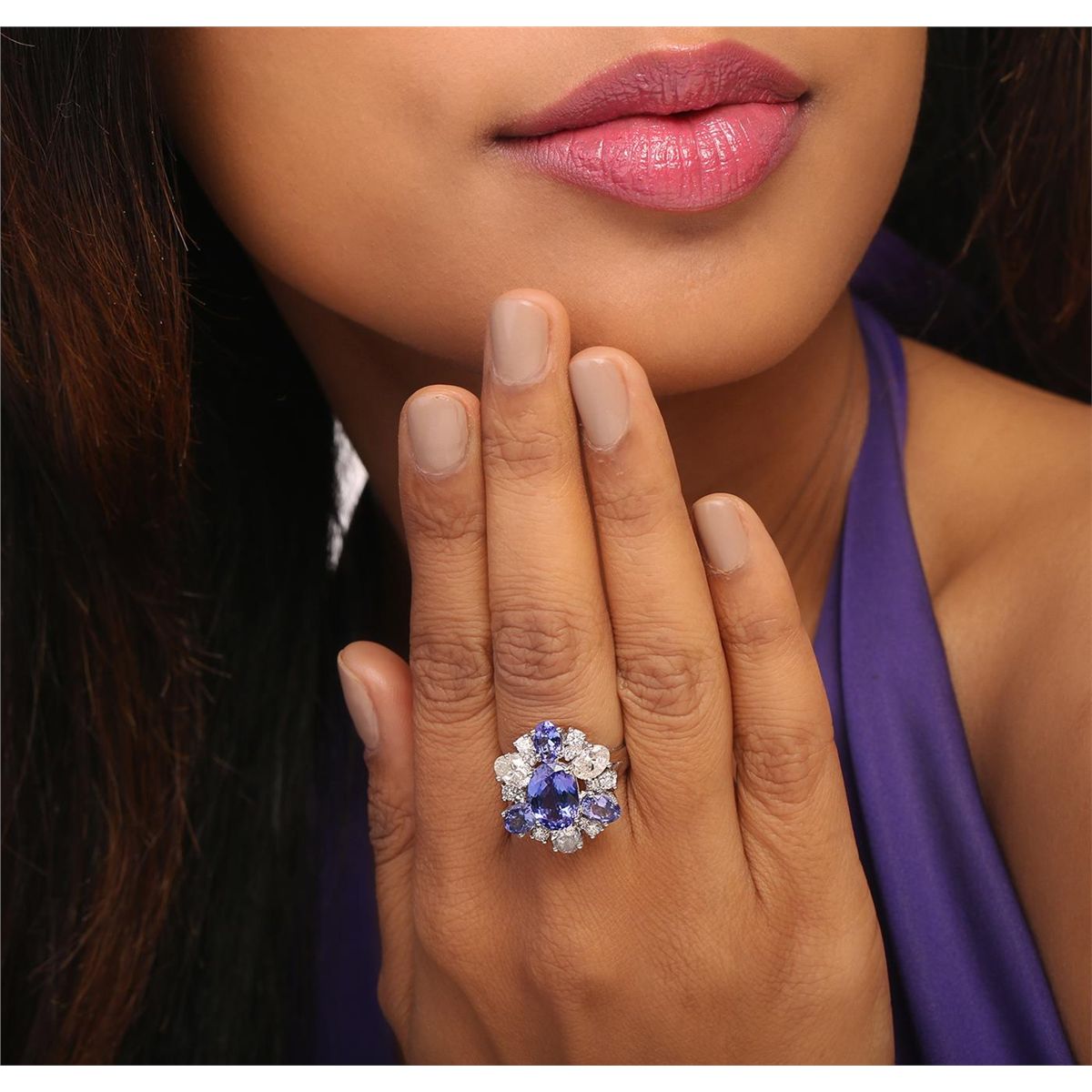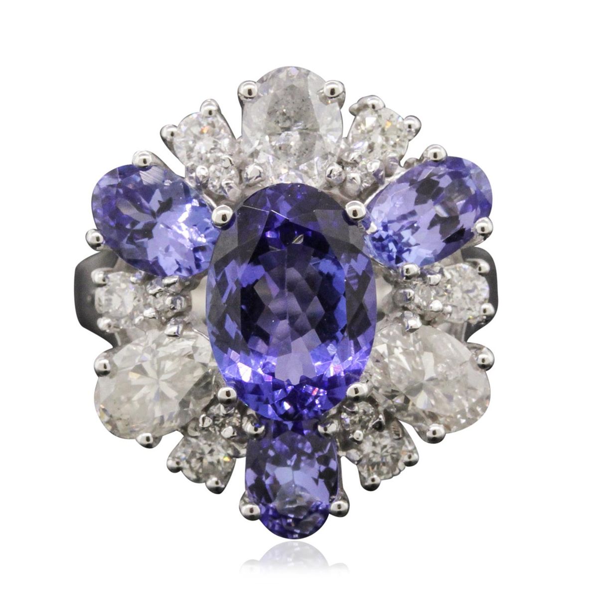 One electronically tested 14KT white gold ladies combination cast & assembled ring with a bright polish finish. Condition is new. Identified with markings of "K14". Containing: One prong set oval modified brilliant cut natural tanzanite, measuring 10.02 x 7.30 x 4.50mm, approximate weight of 2.26ct., clarity is eye clean, type I, medium light, very slightly grayish, bluish violet color, (GIA bV 4/3), cut is good. Three prong set oval modified brilliant cut natural tanzanites, measuring 6.00 x 4.00 x 2.60mm, approximate. Total Weight of 1.32ct., clarity is eye clean, type I, medium light, very slightly grayish, violet color, (GIA V 4/3), cut is good. Three prong set oval shaped cut diamonds, measuring 6.00 x 4.20 x 2.65mm (depth est.) approximate. Total Weight of 3 Stones = 1.28ct. Clarity: I-1 to I-2. Color: I - J, Cut is Good. Twelve prong set round brilliant cut diamonds, measuring 2.10 - 1.50 x 1.08mm (depth est.) approximate. Total Weight of 12 Stones = 0.26ct. Clarity: I-1 to I-2. Color: H - I, Cut is Good. Colored gemstones are presumed to have been subjected to commonly used enhancement processes. All diamonds and colored gemstones are graded in the mounting, unless otherwise stated. Total Weight of Colored Stones 3.58ct. Total Weight of Diamonds 1.54ct. Total Weight of Ring 7.60 grams. GGL Appraised at $11,195.00.