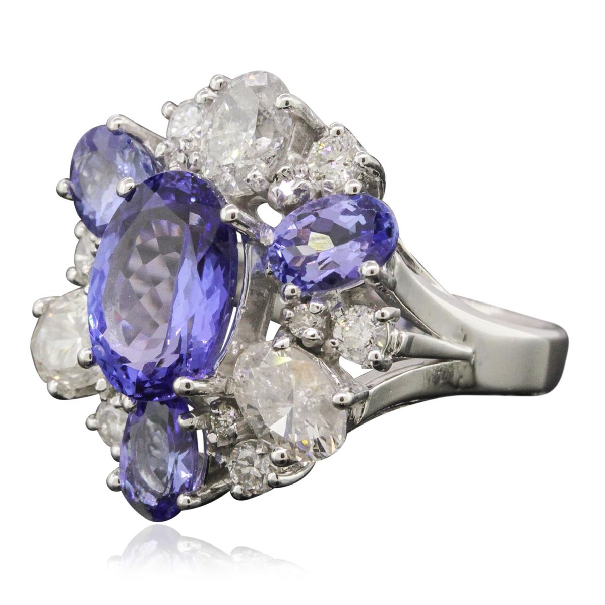 One electronically tested 14KT white gold ladies combination cast & assembled ring with a bright polish finish. Condition is new. Identified with markings of "K14". Containing: One prong set oval modified brilliant cut natural tanzanite, measuring 10.02 x 7.30 x 4.50mm, approximate weight of 2.26ct., clarity is eye clean, type I, medium light, very slightly grayish, bluish violet color, (GIA bV 4/3), cut is good. Three prong set oval modified brilliant cut natural tanzanites, measuring 6.00 x 4.00 x 2.60mm, approximate. Total Weight of 1.32ct., clarity is eye clean, type I, medium light, very slightly grayish, violet color, (GIA V 4/3), cut is good. Three prong set oval shaped cut diamonds, measuring 6.00 x 4.20 x 2.65mm (depth est.) approximate. Total Weight of 3 Stones = 1.28ct. Clarity: I-1 to I-2. Color: I - J, Cut is Good. Twelve prong set round brilliant cut diamonds, measuring 2.10 - 1.50 x 1.08mm (depth est.) approximate. Total Weight of 12 Stones = 0.26ct. Clarity: I-1 to I-2. Color: H - I, Cut is Good. Colored gemstones are presumed to have been subjected to commonly used enhancement processes. All diamonds and colored gemstones are graded in the mounting, unless otherwise stated. Total Weight of Colored Stones 3.58ct. Total Weight of Diamonds 1.54ct. Total Weight of Ring 7.60 grams. GGL Appraised at $11,195.00.