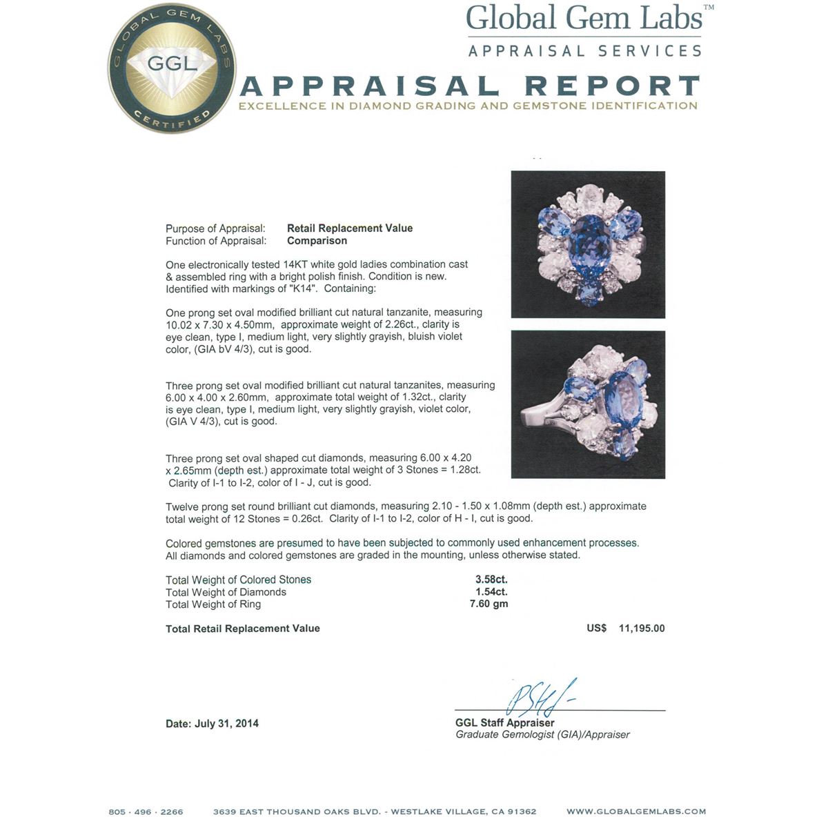 One electronically tested 14KT white gold ladies combination cast & assembled ring with a bright polish finish. Condition is new. Identified with markings of "K14". Containing: One prong set oval modified brilliant cut natural tanzanite, measuring 10.02 x 7.30 x 4.50mm, approximate weight of 2.26ct., clarity is eye clean, type I, medium light, very slightly grayish, bluish violet color, (GIA bV 4/3), cut is good. Three prong set oval modified brilliant cut natural tanzanites, measuring 6.00 x 4.00 x 2.60mm, approximate. Total Weight of 1.32ct., clarity is eye clean, type I, medium light, very slightly grayish, violet color, (GIA V 4/3), cut is good. Three prong set oval shaped cut diamonds, measuring 6.00 x 4.20 x 2.65mm (depth est.) approximate. Total Weight of 3 Stones = 1.28ct. Clarity: I-1 to I-2. Color: I - J, Cut is Good. Twelve prong set round brilliant cut diamonds, measuring 2.10 - 1.50 x 1.08mm (depth est.) approximate. Total Weight of 12 Stones = 0.26ct. Clarity: I-1 to I-2. Color: H - I, Cut is Good. Colored gemstones are presumed to have been subjected to commonly used enhancement processes. All diamonds and colored gemstones are graded in the mounting, unless otherwise stated. Total Weight of Colored Stones 3.58ct. Total Weight of Diamonds 1.54ct. Total Weight of Ring 7.60 grams. GGL Appraised at $11,195.00.