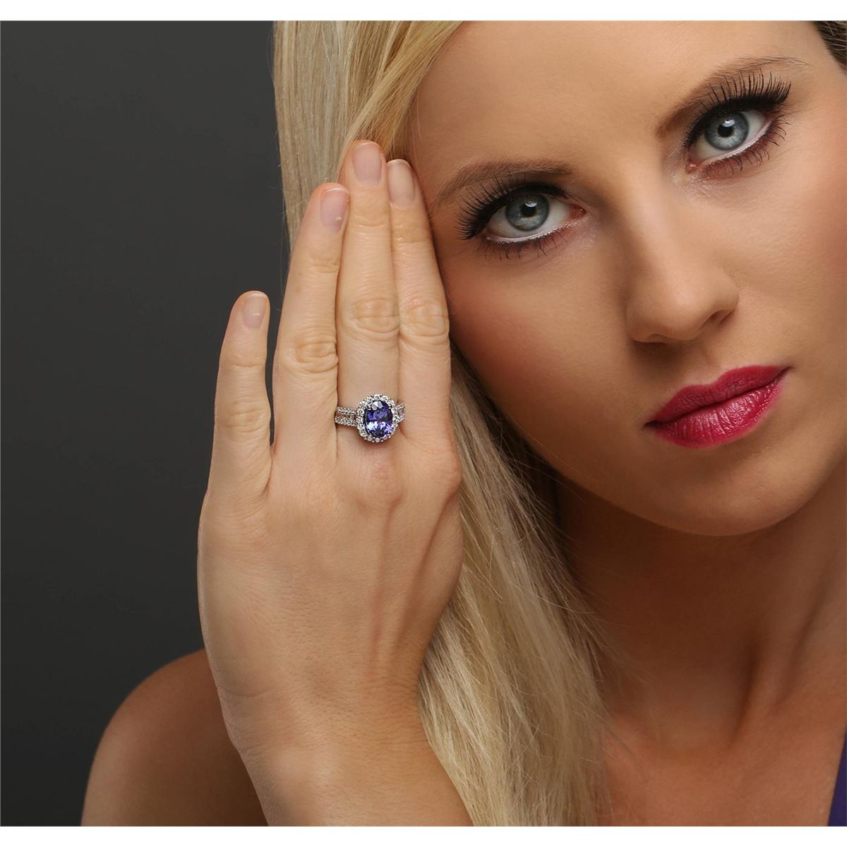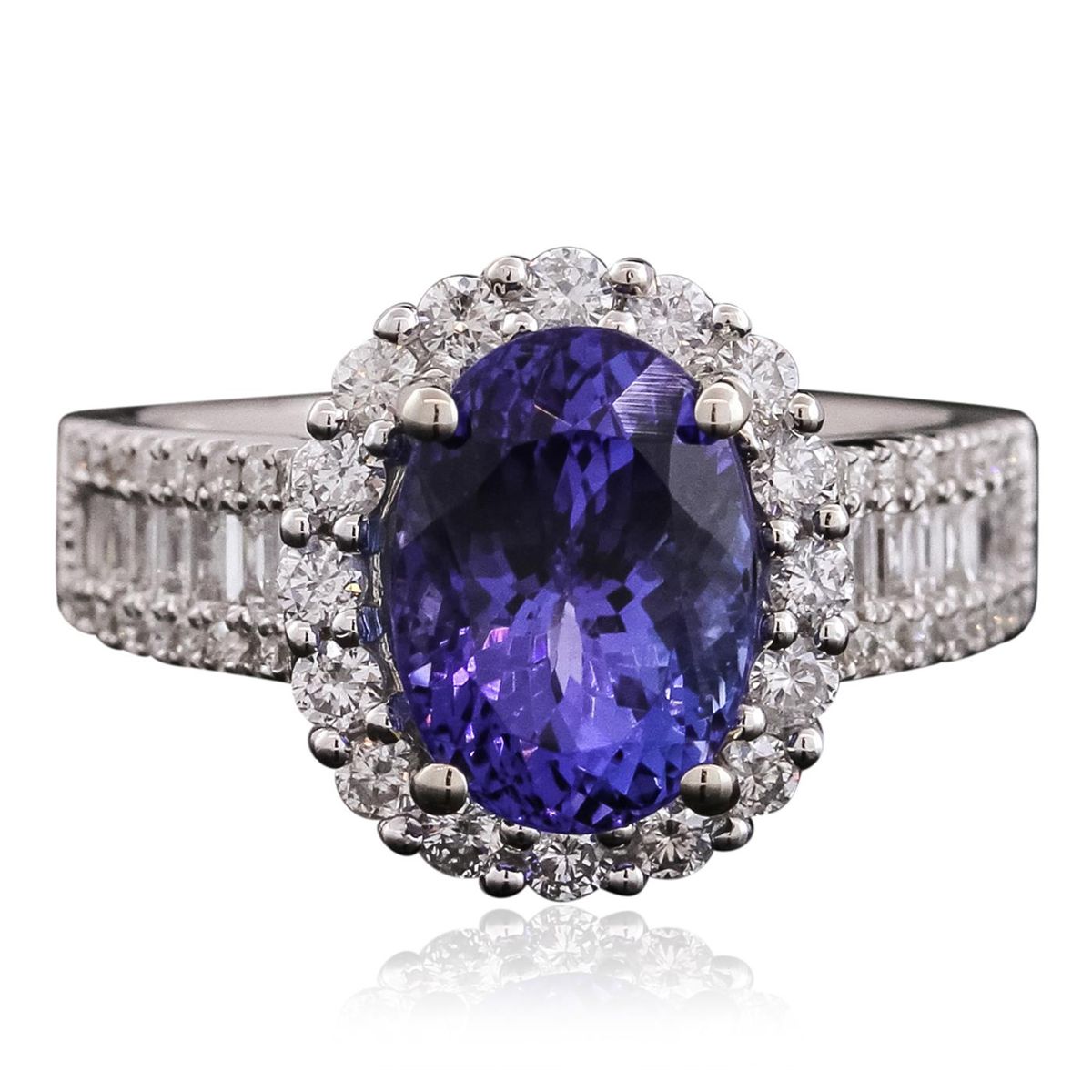 One electronically tested 14KT white gold ladies combination cast & assembled tanzanite and diamond ring with a flat shank with a bright polish finish. Identified with markings of "14K". Condition is new. Containing: One prong set oval modified brilliant cut natural tanzanite, measuring 10.62 x 7.62 x 6.44mm, approximate weight of 3.59ct., clarity is eye clean, type I, medium, moderately strong, bluish violet color, (GIA bV 5/4), cut is good. Forty-Eight prong set round brilliant cut diamonds, measuring 1.80 - 1.00 x 0.84mm (depth est.) approximate total weight of 48 Stones = 0.48ct. Clarity: SI-2 to I-2. Color: H - I, Cut is Good. Fourteen channel set baguette cut diamonds, measuring from 1.50 x 1.20 x 1.02mm (depth est.) to 2.00 x 1.50 x 1.28mm (depth est.) approximate total weight of 14 Stones = 0.35ct. Clarity: SI-1. Color: I - J, Cut is Good. Colored gemstones are presumed to have been subjected to commonly used enhancement processes. All diamonds and colored gemstones are graded in the mounting, unless otherwise stated total weight of Colored Stones 3.59ct. Total Weight of Diamonds 0.83ct. Total Weight of Ring 6.10 grams. GGL Appraised at $9,340.00.