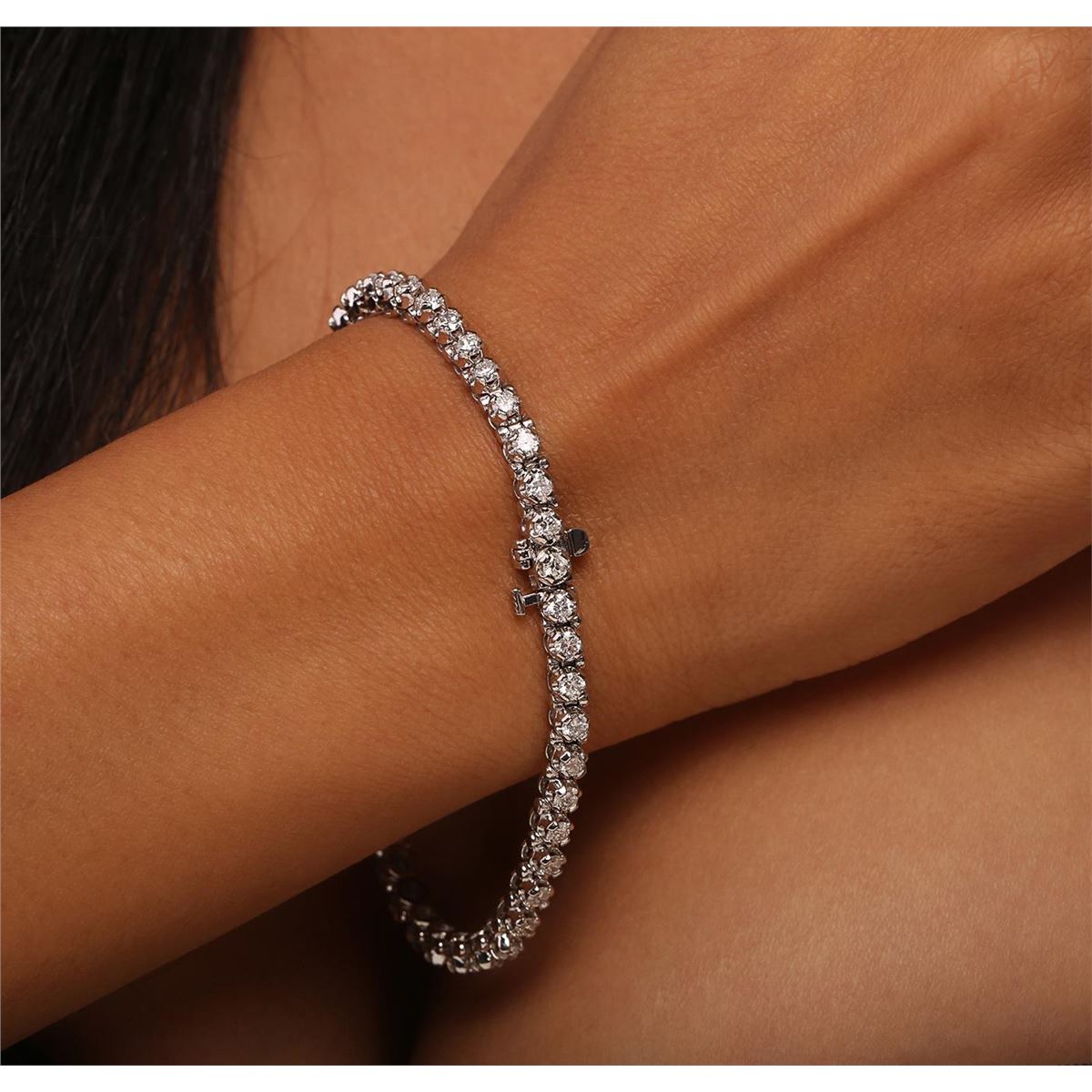 One electronically tested 14KT white gold ladies combination cast & assembled tennis bracelet with a hidden box clasp with a bright polish finish. Condition is new. Measurements: 7" in length. Identified with markings of "14K". Containing: Forty-Five prong set round brilliant cut diamonds, measuring 2.80 - 2.80 x 1.68mm (depth est.) approximate total weight of 45 Stones = 3.61ct. Clarity: SI-2 to I-1. Color: I - J, Cut is Good. All diamonds are graded in the mounting, unless otherwise stated. Total Weight of Diamonds 3.61ct. Total Weight of Bracelet 13.20 grams. GGL Appraised at $16,460.00.