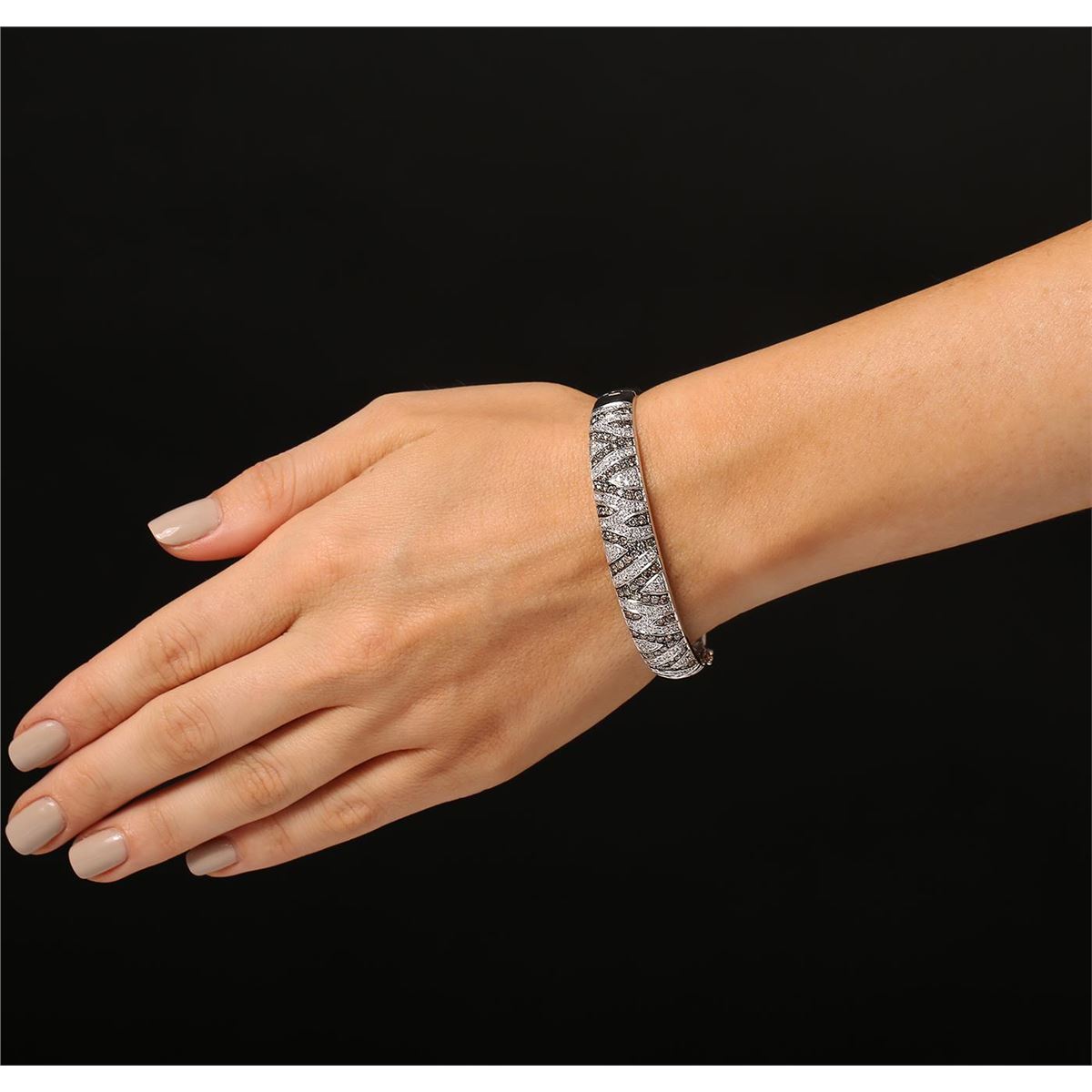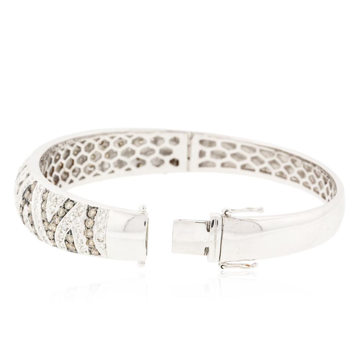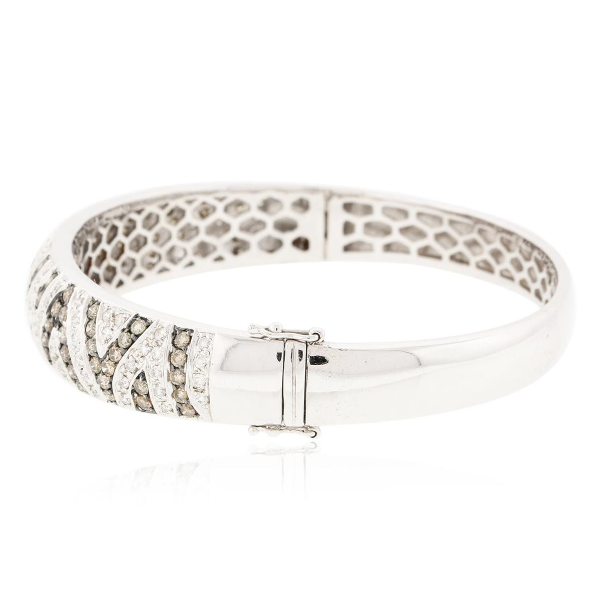 One electronically tested 14KT white gold ladies cast & assembled diamond bangle bracelet with a bright and anodized finish. Condition is new, good workmanship. Seven inch length hinged bangle bracelet features a zebra style brown and white diamond pattern on one arm terminating in a concealed clasp with twin safeties. Identified with markings of "14K 585". Containing: Eighty-four bead set round brilliant cut diamonds, measuring 2.00 - 1.90 x 1.17mm (depth est.) approximate total weight of 84 Stones = 2.38ct. Graded in the setting. Clarity SI-2 to I-1. Color Fancy Brown. Ninety-three bead set round brilliant cut diamonds, measuring 1.50 - 1.50 x 0.90mm (depth est.) approximate total weight of 93 Stones = 1.24ct. Graded in the setting. Clarity I-1 to I-2. Color G - I. Total Weight of Diamonds 3.62ct. Total Weight of Bangle Bracelet 29.40gm. AIG Appraised at $13,700.00.
