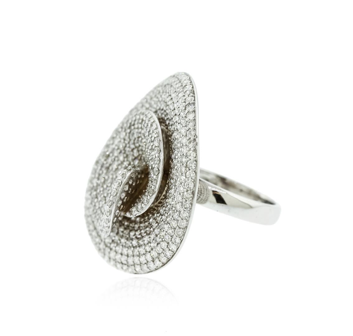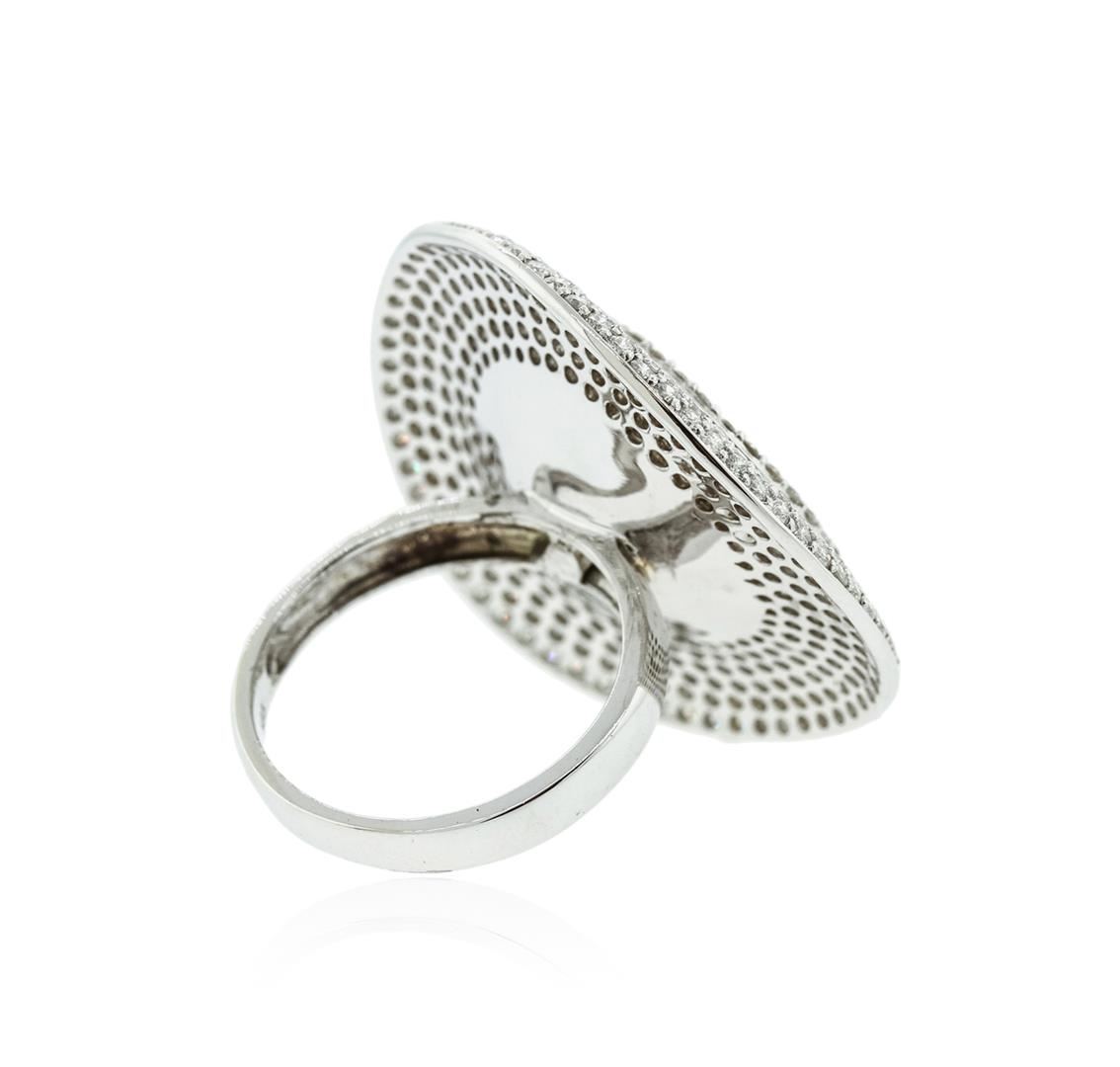 One electronically tested 14KT white gold ladies cast diamond ring with a bright polish finish. Identified with markings of "585". Condition is new. Containing: Four Hundred Fifty-Two prong set round brilliant cut diamonds, measuring 1.30 - 1.30 x 0.78mm (depth est.) approximate total weight of 452 Stones = 3.62ct.. Clarity: SI-2 to I-2. Color: H - I, Cut is Good. All diamonds are graded in the mounting, unless otherwise stated.. Total Weight of Diamonds 3.62ct.. Total Weight of Ring 15.70 grams. GGL Appraised at $9,885.00.