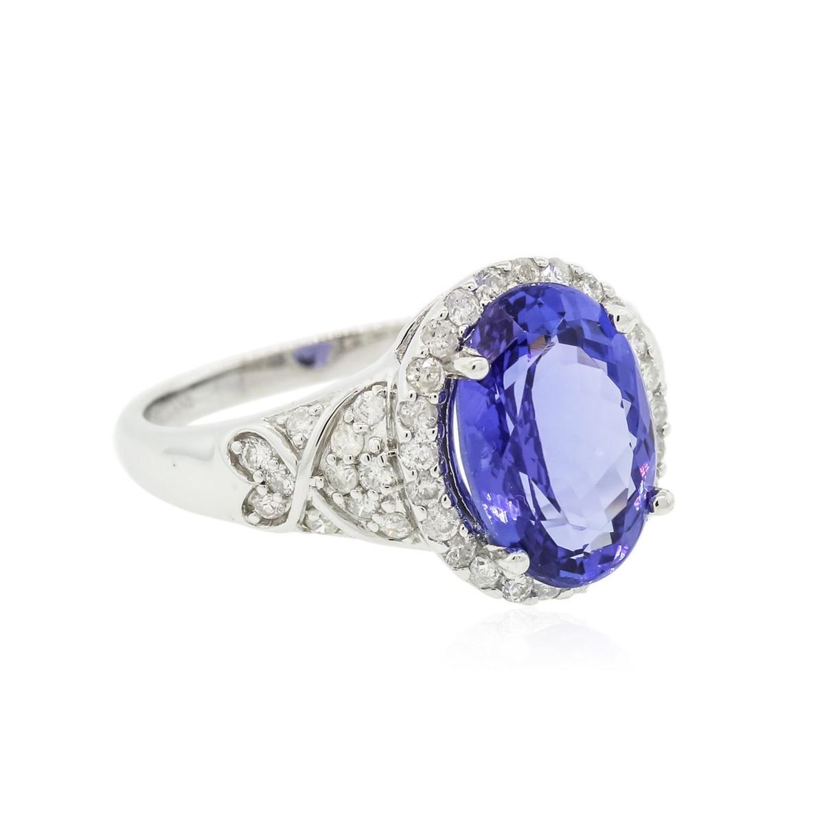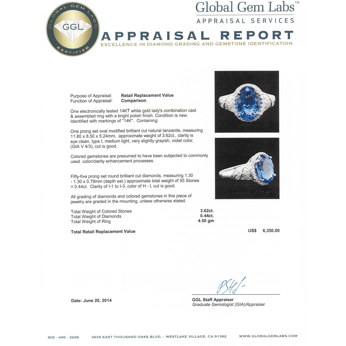 One electronically tested 14KT white gold Ladies combination cast & assembled ring with a bright polish finish. Condition is new. Identified with markings of "14K". Containing: One prong set oval modified brilliant cut natural tanzanite, measuring 11.80 x 8.50 x 5.24mm, approximate weight of 3.62ct., clarity is eye clean, type I, medium light, very slightly grayish, violet color, (GIA V 4/3), cut is good. Colored gemstones are presumed to have been subjected to commonly used color/clarity enhancement processes. Fifty-Five prong set round brilliant cut diamonds, measuring 1.30 - 1.30 x 0.78mm (depth est.) approximate. Total Weight of 55 Stones = 0.44ct. Clarity: I-1 to I-3. Color: H - I, Cut is Good. All grading of diamonds and colored gemstones in this piece of jewelry are graded in the mounting, unless otherwise stated. Total Weight of Colored Stones 3.62ct. Total Weight of Diamonds 0.44ct. Total Weight of Ring 4.50 grams. GGL Appraised at $6,350.00.