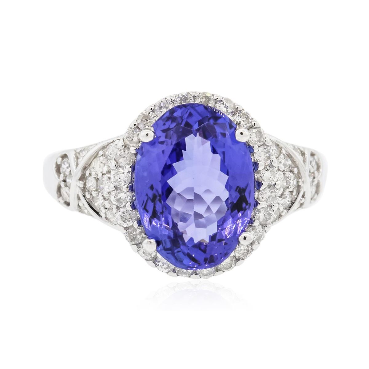 One electronically tested 14KT white gold Ladies combination cast & assembled ring with a bright polish finish. Condition is new. Identified with markings of "14K". Containing: One prong set oval modified brilliant cut natural tanzanite, measuring 11.80 x 8.50 x 5.24mm, approximate weight of 3.62ct., clarity is eye clean, type I, medium light, very slightly grayish, violet color, (GIA V 4/3), cut is good. Colored gemstones are presumed to have been subjected to commonly used color/clarity enhancement processes. Fifty-Five prong set round brilliant cut diamonds, measuring 1.30 - 1.30 x 0.78mm (depth est.) approximate. Total Weight of 55 Stones = 0.44ct. Clarity: I-1 to I-3. Color: H - I, Cut is Good. All grading of diamonds and colored gemstones in this piece of jewelry are graded in the mounting, unless otherwise stated. Total Weight of Colored Stones 3.62ct. Total Weight of Diamonds 0.44ct. Total Weight of Ring 4.50 grams. GGL Appraised at $6,350.00.