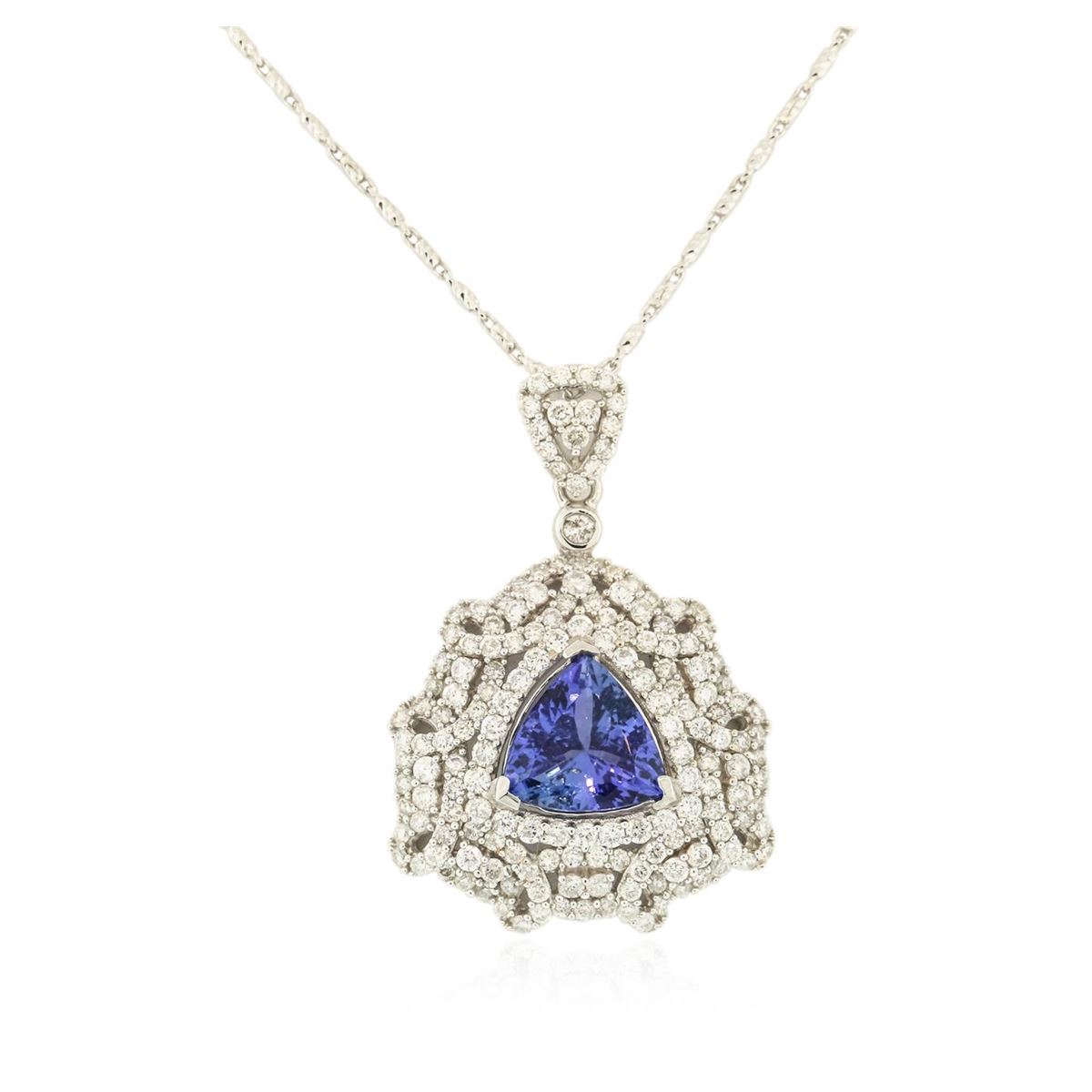 One electronically tested 14KT white gold ladies cast & assembled tanzanite and diamond pendant with chain. The pendant features a tanzanite set within a diamond lattice gallery, completed by a diamond set bail. The pendant is supported by an eighteen inch length 14KT white gold designer style chain, terminating in a lobster claw clasp. Bright polish finish. Trademark is Orianne. Identified with markings of "14K". Condition is new, good workmanship. Containing: One prong set triangle brilliant cut natural tanzanite, measuring 10.10 x 10.00 x 5.60mm, 6% bulge factor, approximate weight of 3.62ct., clarity is slightly included, type I, medium dark, very slightly grayish, violetish blue color, (GIA vB 6/3), cut is good. Transmitting light with a minimum of distortion, transparent, Naturally occurring internal & external characteristics are present. Graded in the setting. Tanzanite is a very rare gemstone that is only found in the country of Tanzania. Originally discovered in 1967. Tiffany & Company, named the stone Tanzanite. It is found in the Usumburu Mountains that border the Umba Valley of northern Tanzania. Tanzanite occurs in gray, brown, violet, blue, reddish-purple, & green. The gem is interesting because of its exceptional pleochroism. Rotated in different directions a tanzanite will exhibit multiple changes of color. Tanzanite has a low tolerance to ultrasonic cleaning, and should not be cleaned using this method. One Hundred Sixty prong set round brilliant cut diamonds, measuring 1.70 - 1.50 x 0.96mm (depth est.) approximate total weight of 160 Stones = 2.30ct. Graded in the setting. Clarity: I-1 to I-2. Color: H - J. Total Weight of Colored Stones 3.62ct. Total Weight of Diamonds 2.30ct. Total Weight of Pendant With Chain 9.94 grams. AIG Appraised at $15,860.00.