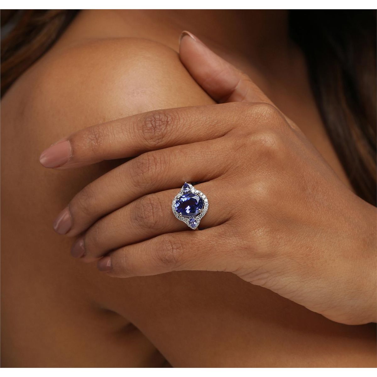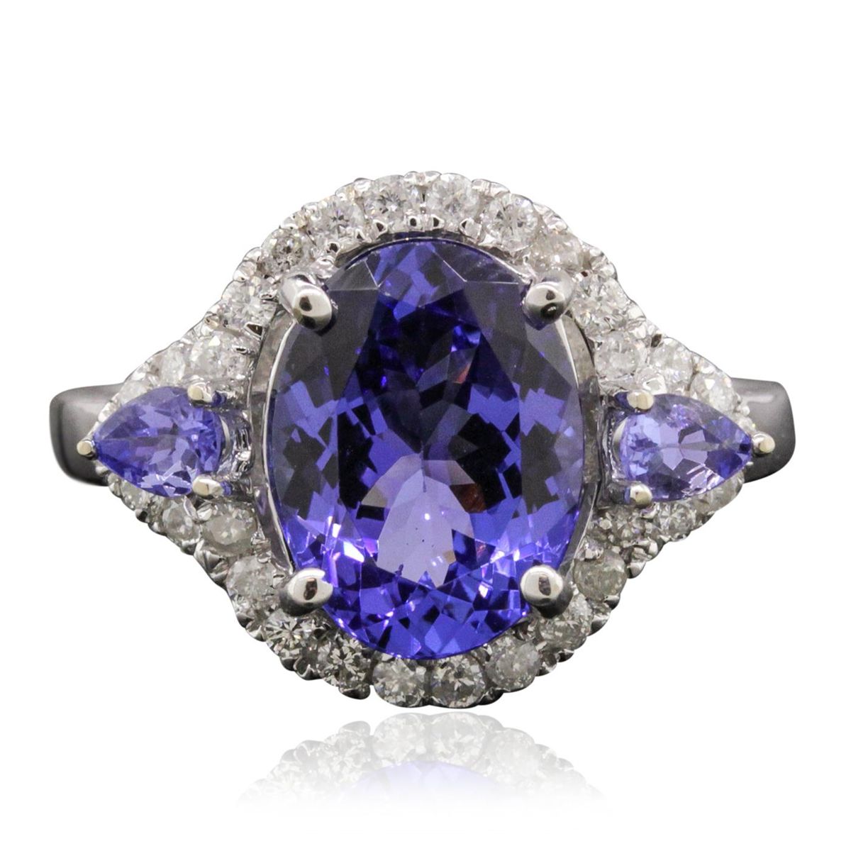 One electronically tested 14KT white gold ladies cast tanzanite and diamond ring with a bright polish finish. Condition is new, good workmanship. The featured tanzanite is set within a diamond bezel accented by a single tanzanite on either side, completed by a two millimeter wide band. Trademark is Orianne. Identified with markings of "14K". Containing: One prong set oval mixed cut natural tanzanite, measuring 11.05 x 8.20 x 5.05mm, 6%. bulge factor, approximate weight of 3.32ct., clarity is eye clean, type I, medium dark, very slightly grayish, bluish violet color, (GIA bV 6/3), cut is good. Transmitting light with no distortion, transparent. Graded in the setting. Two prong set pear mixed cut natural tanzanites, measuring 3.80 x 2.80 x 1.90mm, approximate. Total Weight of 0.30ct., clarity is eye clean, type I, medium, very slightly grayish, bluish violet color, (GIA bV 5/3), cut is good. Transmitting light with no distortion, transparent. Measurements & the color grade are an average for the pair. Graded in the setting. Tanzanite is a very rare gemstone that is only found in the country of Tanzania. Originally discovered in 1967. Tiffany & Company, named the stone Tanzanite. It is found in the Usumburu Mountains that border the Umba Valley of northern Tanzania. Tanzanite occurs in gray, brown, violet, blue, reddish-purple, & green. The gem is interesting because of its exceptional pleochroism. Rotated in different directions a tanzanite will exhibit multiple changes of color. Tanzanite has a low tolerance to ultrasonic cleaning, and should not be cleaned using this method. Thirty prong set round brilliant cut diamonds, measuring 1.60 - 1.50 x 0.93mm (depth est.) approximate. Total Weight of 30 Stones = 0.40ct. Graded in the setting. Clarity: SI-2 to I-2. Color: G - I. Total Weight of Colored Stones 3.62ct. Total Weight of Diamonds 0.40ct. Total Weight of Ring 4.78 grams. AIG Appraised at $10,480.00.