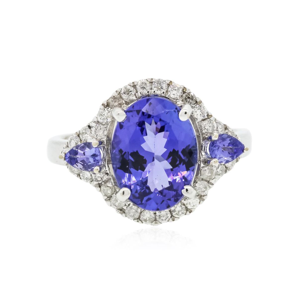 One electronically tested 14KT white gold ladies cast tanzanite and diamond ring with a bright polish finish. Condition is new, good workmanship. The featured tanzanite is set within a diamond bezel accented by a single tanzanite on either side, completed by a two millimeter wide band. Trademark is Orianne. Identified with markings of "14K". Containing: One prong set oval mixed cut natural tanzanite, measuring 11.05 x 8.20 x 5.05mm, 6%. bulge factor, approximate weight of 3.32ct., clarity is eye clean, type I, medium dark, very slightly grayish, bluish violet color, (GIA bV 6/3), cut is good. Transmitting light with no distortion, transparent. Graded in the setting. Two prong set pear mixed cut natural tanzanites, measuring 3.80 x 2.80 x 1.90mm, approximate. Total Weight of 0.30ct., clarity is eye clean, type I, medium, very slightly grayish, bluish violet color, (GIA bV 5/3), cut is good. Transmitting light with no distortion, transparent. Measurements & the color grade are an average for the pair. Graded in the setting. Tanzanite is a very rare gemstone that is only found in the country of Tanzania. Originally discovered in 1967. Tiffany & Company, named the stone Tanzanite. It is found in the Usumburu Mountains that border the Umba Valley of northern Tanzania. Tanzanite occurs in gray, brown, violet, blue, reddish-purple, & green. The gem is interesting because of its exceptional pleochroism. Rotated in different directions a tanzanite will exhibit multiple changes of color. Tanzanite has a low tolerance to ultrasonic cleaning, and should not be cleaned using this method. Thirty prong set round brilliant cut diamonds, measuring 1.60 - 1.50 x 0.93mm (depth est.) approximate. Total Weight of 30 Stones = 0.40ct. Graded in the setting. Clarity: SI-2 to I-2. Color: G - I. Total Weight of Colored Stones 3.62ct. Total Weight of Diamonds 0.40ct. Total Weight of Ring 4.78 grams. AIG Appraised at $10,480.00.