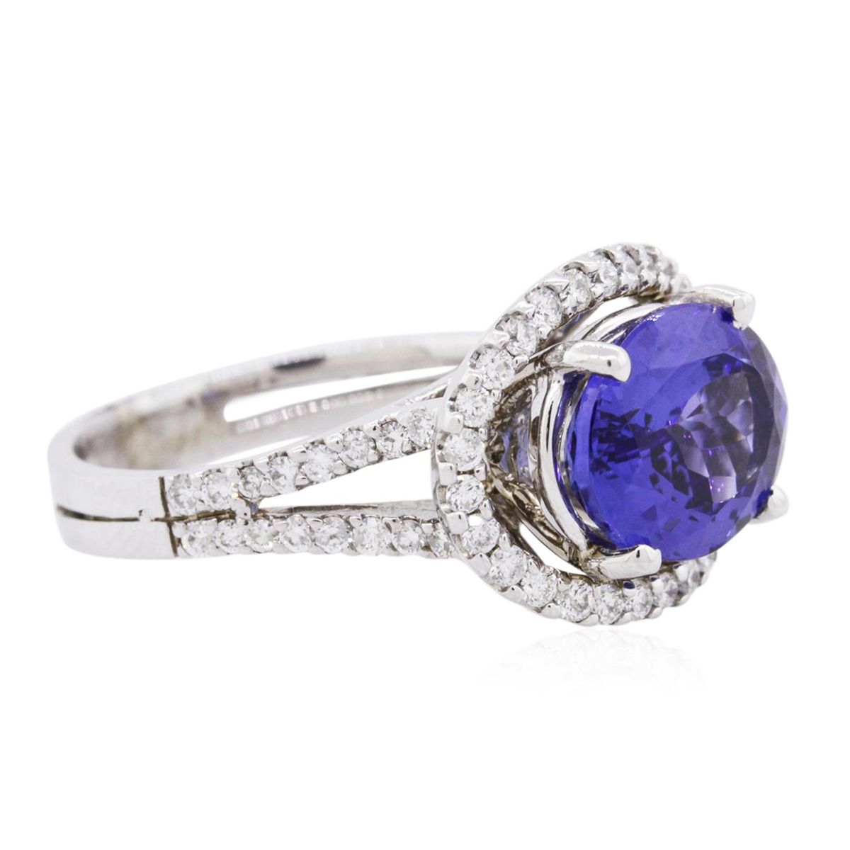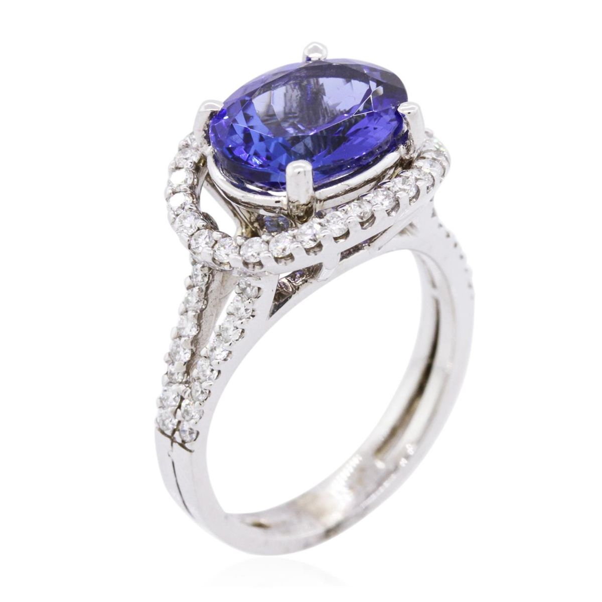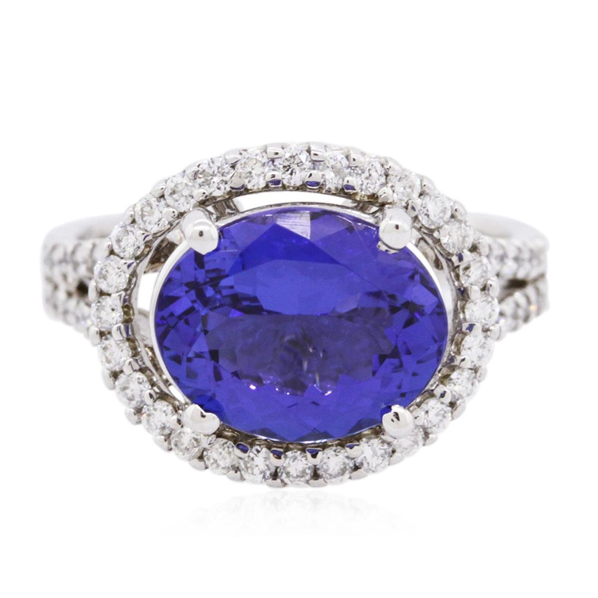 One electronically tested 14KT white gold ladies combination cast & assembled tanzanite and diamond ring with a flat shank with a bright polish finish. Identified with markings of "14K". Condition is new. Containing: One prong set oval modified brilliant cut natural tanzanite, measuring 10.02 x 8.89 x 5.81mm, approximate weight of 3.64ct., clarity is eye clean, type I, medium, moderately strong, violetish blue color, (GIA vB 5/4), cut is good. Sixty prong set round brilliant cut diamonds, measuring 1.50 - 1.30 x 0.84mm (depth est.) approximate total weight of 60 Stones = 0.60ct. Clarity: SI-2 to I-1. Color: I - J, Cut is Good. All diamonds and colored gemstones are graded in the mounting, unless otherwise stated. Colored gemstones are presumed to have been subjected to commonly used enhancement processes. Total Weight of Colored Stones 3.64ct. Total Weight of Diamonds 0.60ct. Total Weight of Ring 6.30 grams. GGL Appraised at $8,450.00.