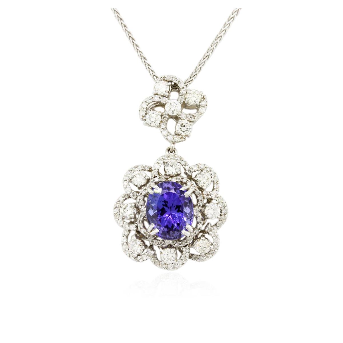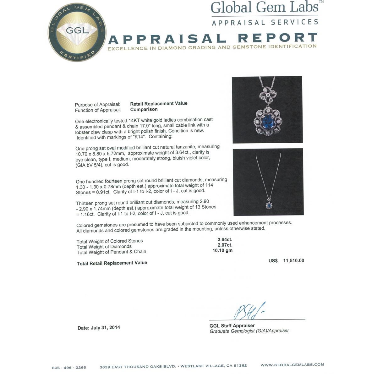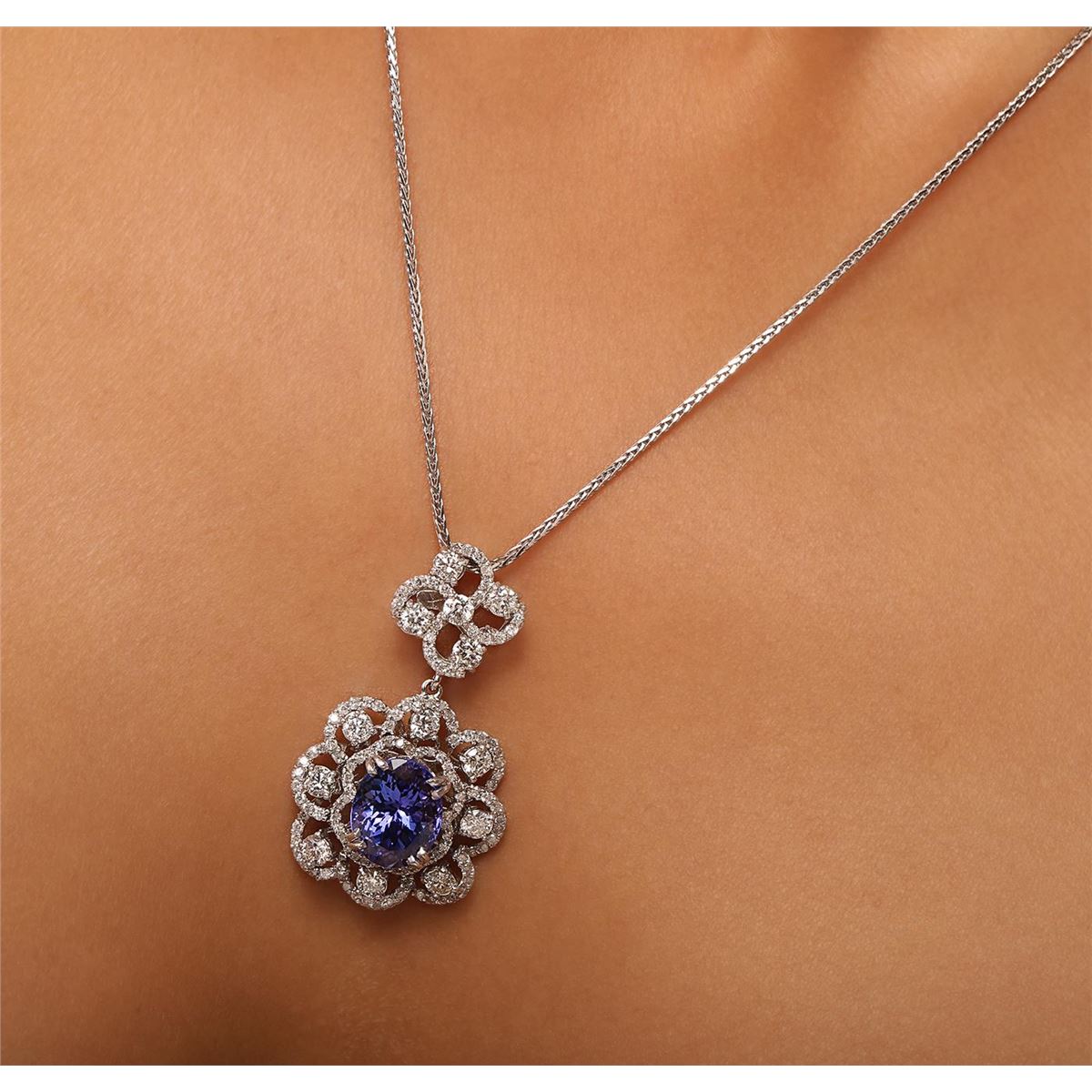 One electronically tested 14KT white gold ladies combination cast & assembled pendant & chain 17.0" long, small cable link with a lobster claw clasp with a bright polish finish. Condition is new. Identified with markings of "K14". Containing: One prong set oval modified brilliant cut natural tanzanite, measuring 10.70 x 8.80 x 5.72mm, approximate weight of 3.64ct., clarity is eye clean, type I, medium, moderately strong, bluish violet color, (GIA bV 5/4), cut is good. One Hundred Fourteen prong set round brilliant cut diamonds, measuring 1.30 - 1.30 x 0.78mm (depth est.) approximate. Total Weight of 114 Stones = 0.91ct. Clarity: I-1 to I-2. Color: I - J, Cut is Good. Thirteen prong set round brilliant cut diamonds, measuring 2.90 - 2.90 x 1.74mm (depth est.) approximate. Total Weight of 13 Stones = 1.16ct. Clarity: I-1 to I-2. Color: I - J, Cut is Good. Colored gemstones are presumed to have been subjected to commonly used enhancement processes. All diamonds and colored gemstones are graded in the mounting, unless otherwise stated. Total Weight of Colored Stones 3.64ct. Total Weight of Diamonds 2.07ct. Total Weight of Pendant & Chain 10.10 grams. GGL Appraised at $11,510.00.