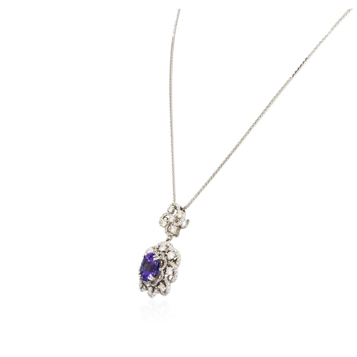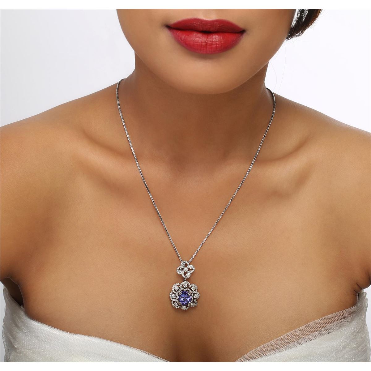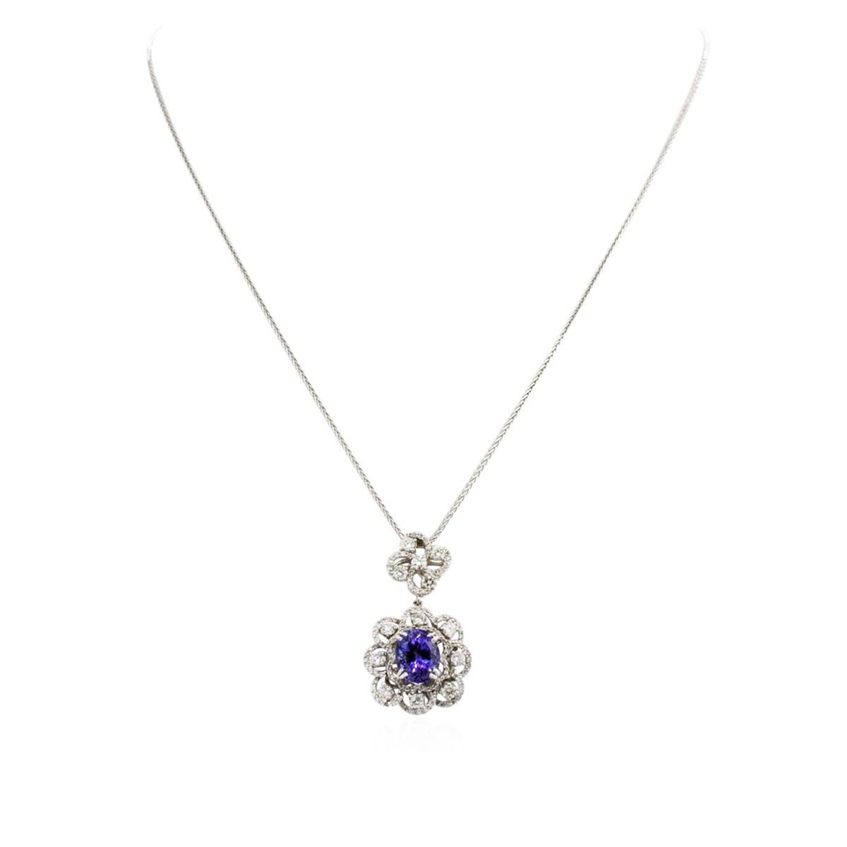One electronically tested 14KT white gold ladies combination cast & assembled pendant & chain 17.0" long, small cable link with a lobster claw clasp with a bright polish finish. Condition is new. Identified with markings of "K14". Containing: One prong set oval modified brilliant cut natural tanzanite, measuring 10.70 x 8.80 x 5.72mm, approximate weight of 3.64ct., clarity is eye clean, type I, medium, moderately strong, bluish violet color, (GIA bV 5/4), cut is good. One Hundred Fourteen prong set round brilliant cut diamonds, measuring 1.30 - 1.30 x 0.78mm (depth est.) approximate. Total Weight of 114 Stones = 0.91ct. Clarity: I-1 to I-2. Color: I - J, Cut is Good. Thirteen prong set round brilliant cut diamonds, measuring 2.90 - 2.90 x 1.74mm (depth est.) approximate. Total Weight of 13 Stones = 1.16ct. Clarity: I-1 to I-2. Color: I - J, Cut is Good. Colored gemstones are presumed to have been subjected to commonly used enhancement processes. All diamonds and colored gemstones are graded in the mounting, unless otherwise stated. Total Weight of Colored Stones 3.64ct. Total Weight of Diamonds 2.07ct. Total Weight of Pendant & Chain 10.10 grams. GGL Appraised at $11,510.00.