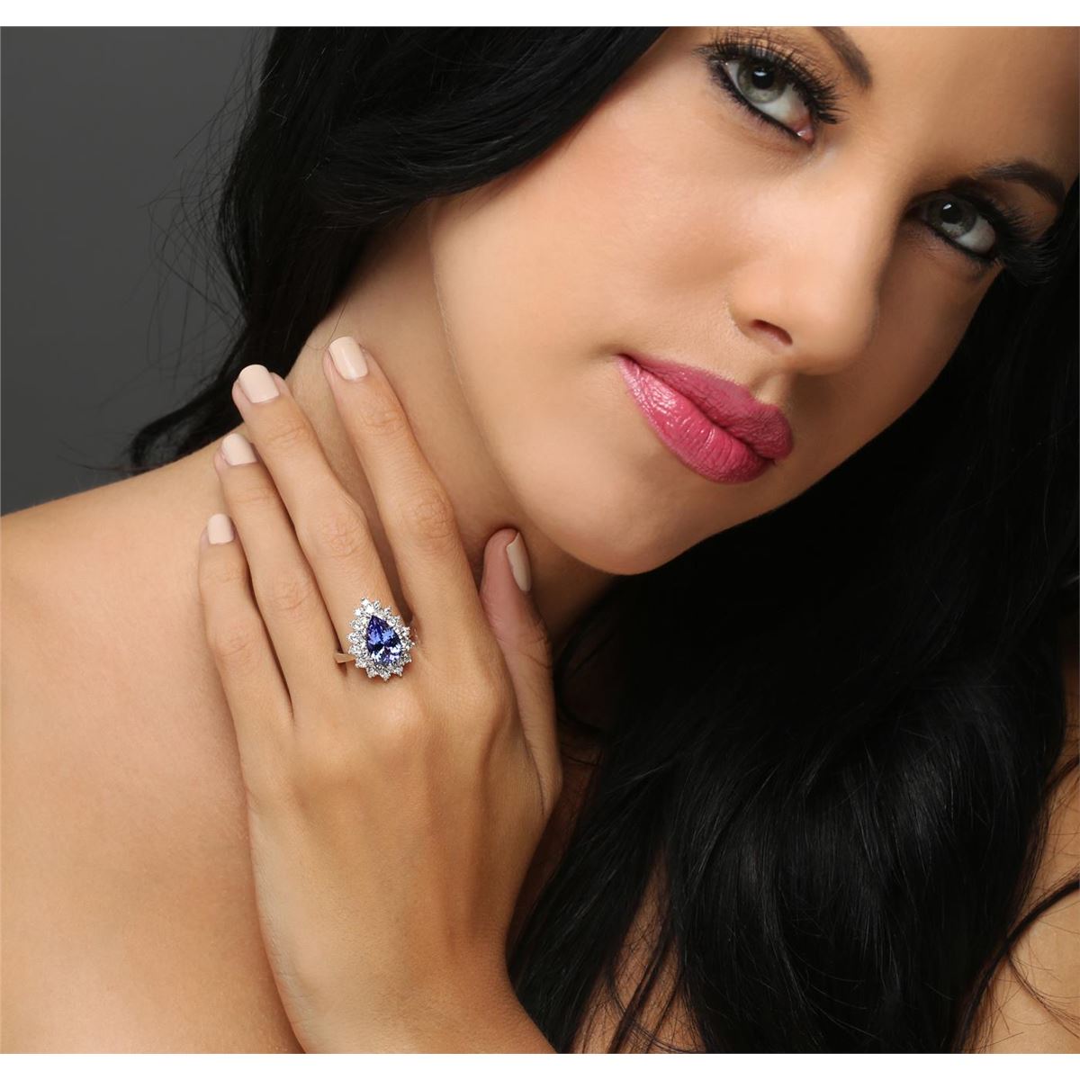 One electronically tested 14KT white gold ladies combination cast & assembled tanzanite and diamond ring with a flat shank with a bright polish finish. Identified with markings of "K14". Condition is new. Containing: One prong set pear modified brilliant cut natural tanzanite, measuring 12.00 x 8.01 x 5.66mm, approximate weight of 3.65ct., clarity is eye clean, type I, medium, very slightly grayish, violet color, (GIA V 5/3), cut is good. Twenty-Nine prong set round brilliant cut diamonds, measuring 2.50 - 2.00 x 1.35mm (depth est.) approximate total weight of 29 Stones = 1.21ct. Clarity: SI-1 to I-1. Color: J, Cut is Good. Colored gemstones are presumed to have been subjected to commonly used enhancement processes. All diamonds and colored gemstones are graded in the mounting, unless otherwise stated. Total Weight of Colored Stones 3.65ct. Total Weight of Diamonds 1.21ct. Total Weight of Ring 6.10 grams. GGL Appraised at $9,495.00.