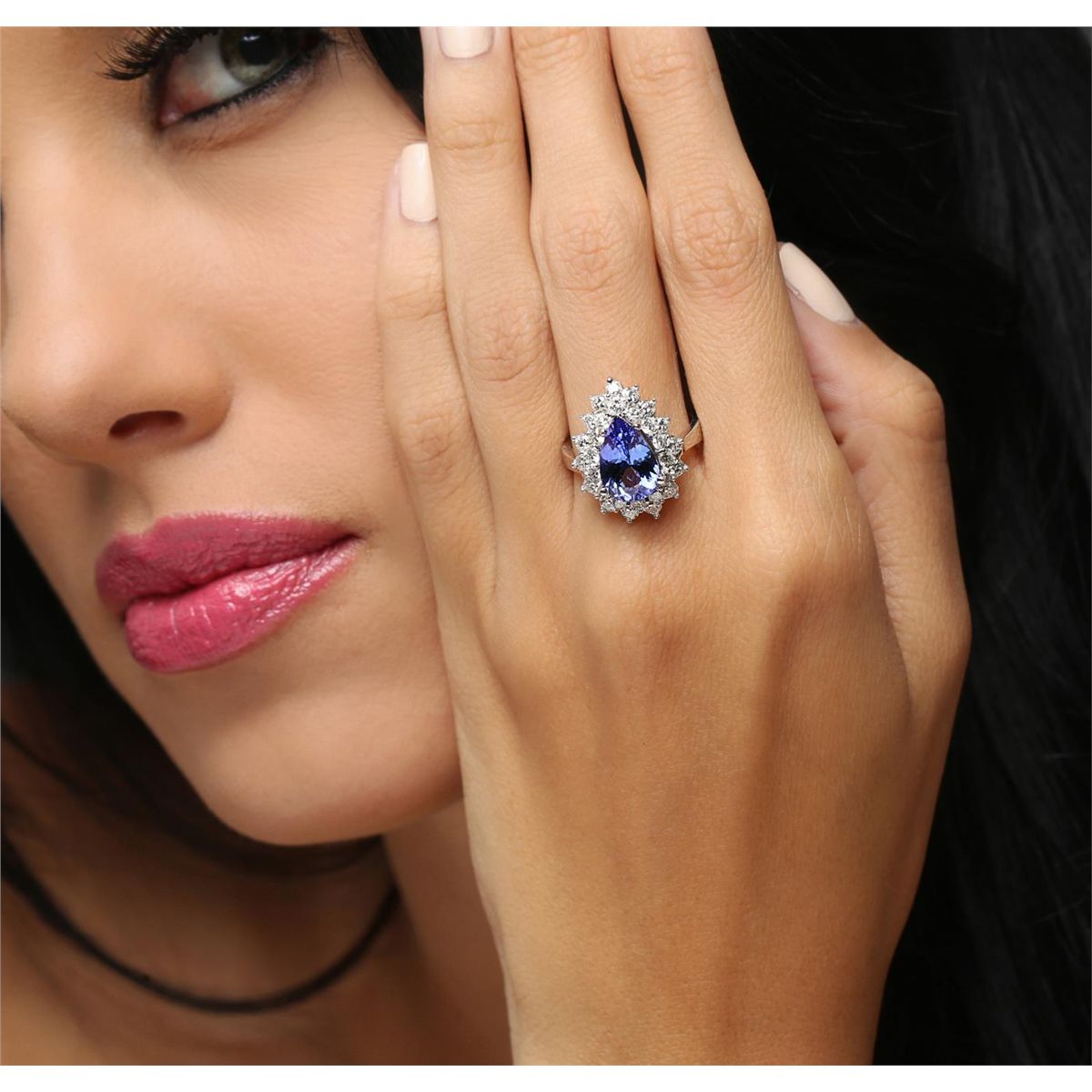 One electronically tested 14KT white gold ladies combination cast & assembled tanzanite and diamond ring with a flat shank with a bright polish finish. Identified with markings of "K14". Condition is new. Containing: One prong set pear modified brilliant cut natural tanzanite, measuring 12.00 x 8.01 x 5.66mm, approximate weight of 3.65ct., clarity is eye clean, type I, medium, very slightly grayish, violet color, (GIA V 5/3), cut is good. Twenty-Nine prong set round brilliant cut diamonds, measuring 2.50 - 2.00 x 1.35mm (depth est.) approximate total weight of 29 Stones = 1.21ct. Clarity: SI-1 to I-1. Color: J, Cut is Good. Colored gemstones are presumed to have been subjected to commonly used enhancement processes. All diamonds and colored gemstones are graded in the mounting, unless otherwise stated. Total Weight of Colored Stones 3.65ct. Total Weight of Diamonds 1.21ct. Total Weight of Ring 6.10 grams. GGL Appraised at $9,495.00.
