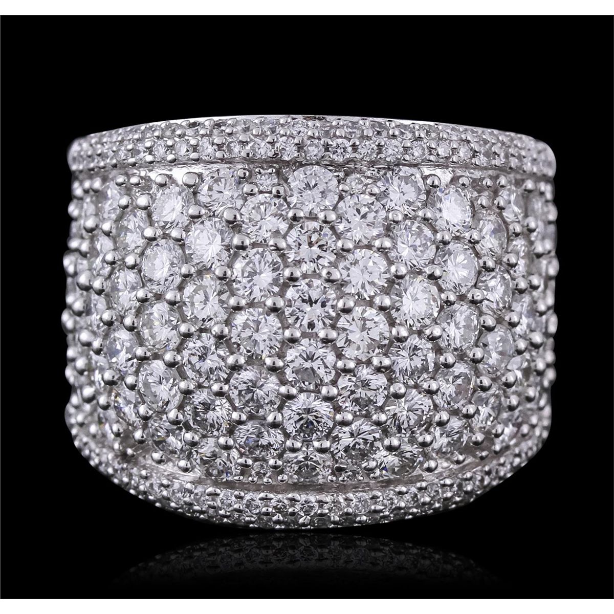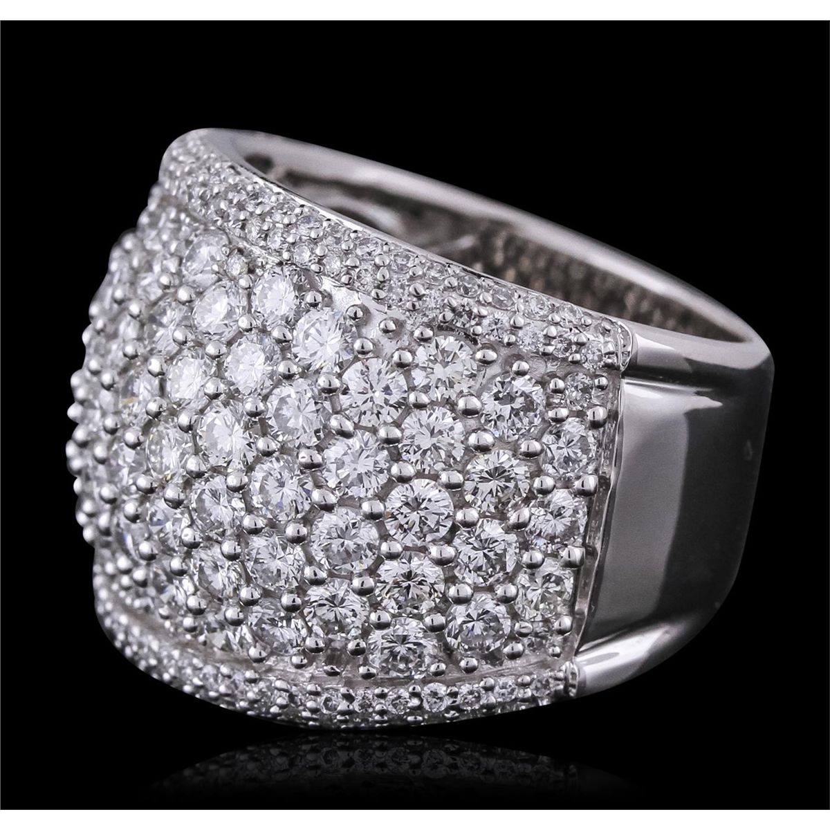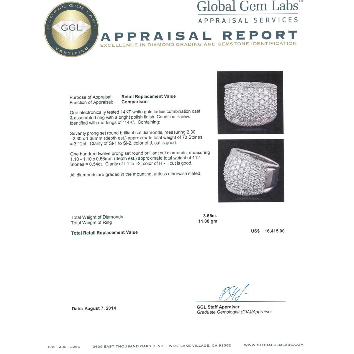 One electronically tested 14KT white gold ladies combination cast & assembled ring with a bright polish finish. Identified with markings of "14K". Condition is new. Containing: Seventy prong set round brilliant cut diamonds, measuring 2.30 - 2.30 x 1.38mm (depth est.) approximate total weight of 70 Stones = 3.12ct. Clarity: SI-1 to SI-2. Color: J, Cut is Good. One Hundred Twelve prong set round brilliant cut diamonds, measuring 1.10 - 1.10 x 0.66mm (depth est.) approximate total weight of 112 Stones = 0.54ct. Clarity: I-1 to I-2. Color: H - I, Cut is Good. All diamonds are graded in the mounting, unless otherwise stated. Total Weight of Diamonds 3.65ct. Total Weight of Ring 11.00 grams. GGL Appraised at $16,415.00.