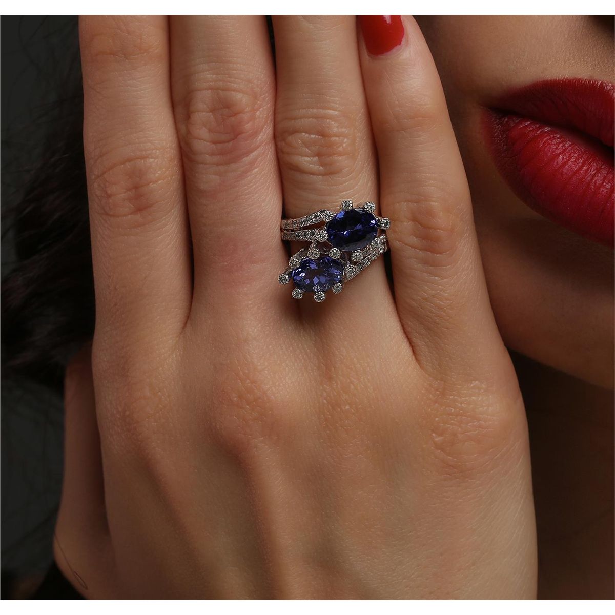 One electronically tested 14KT white gold ladies cast tanzanite and diamond ring. The ring features a stylized tanzanite and diamond bypass design, completed by a one and one-half millimeter wide band. Bright polish finish with milgrain detailing. Condition is new, good workmanship. Containing: Two prong set oval brilliant cut natural tanzanites, measuring 8.50 x 6.50 x 4.50mm, 8% bulge factor, approximate total weight of 3.66ct., clarity is eye clean, type I, medium dark, very slightly grayish, violetish blue color, (GIA vB 6/3), cut is good. Transmitting light with no distortion, transparent. Measurements & the color grade are an average for the pair. Graded in the setting. Tanzanite is a very rare gemstone that is only found in the country of Tanzania. Originally discovered in 1967. Tiffany & Company, named the stone Tanzanite. It is found in the Usumburu Mountains that border the Umba Valley of northern Tanzania. Tanzanite occurs in gray, brown, violet, blue, reddish-purple, & green. The gem is interesting because of its exceptional pleochroism. Rotated in different directions a tanzanite will exhibit multiple changes of color. Tanzanite has a low tolerance to ultrasonic cleaning, and should not be cleaned using this method. Seventy-Three prong set round brilliant cut diamonds, measuring 1.30 - 1.20 x 0.75mm (depth est.) approximate total weight of 73 Stones = 0.61ct. Graded in the setting. Clarity: SI-1 to I-1. Color: H - J. Total Weight of Colored Stones 3.66ct. Total Weight of Diamonds 0.61ct. Total Weight of Ring 5.29 grams. AIG Appraised at $10,000.00.