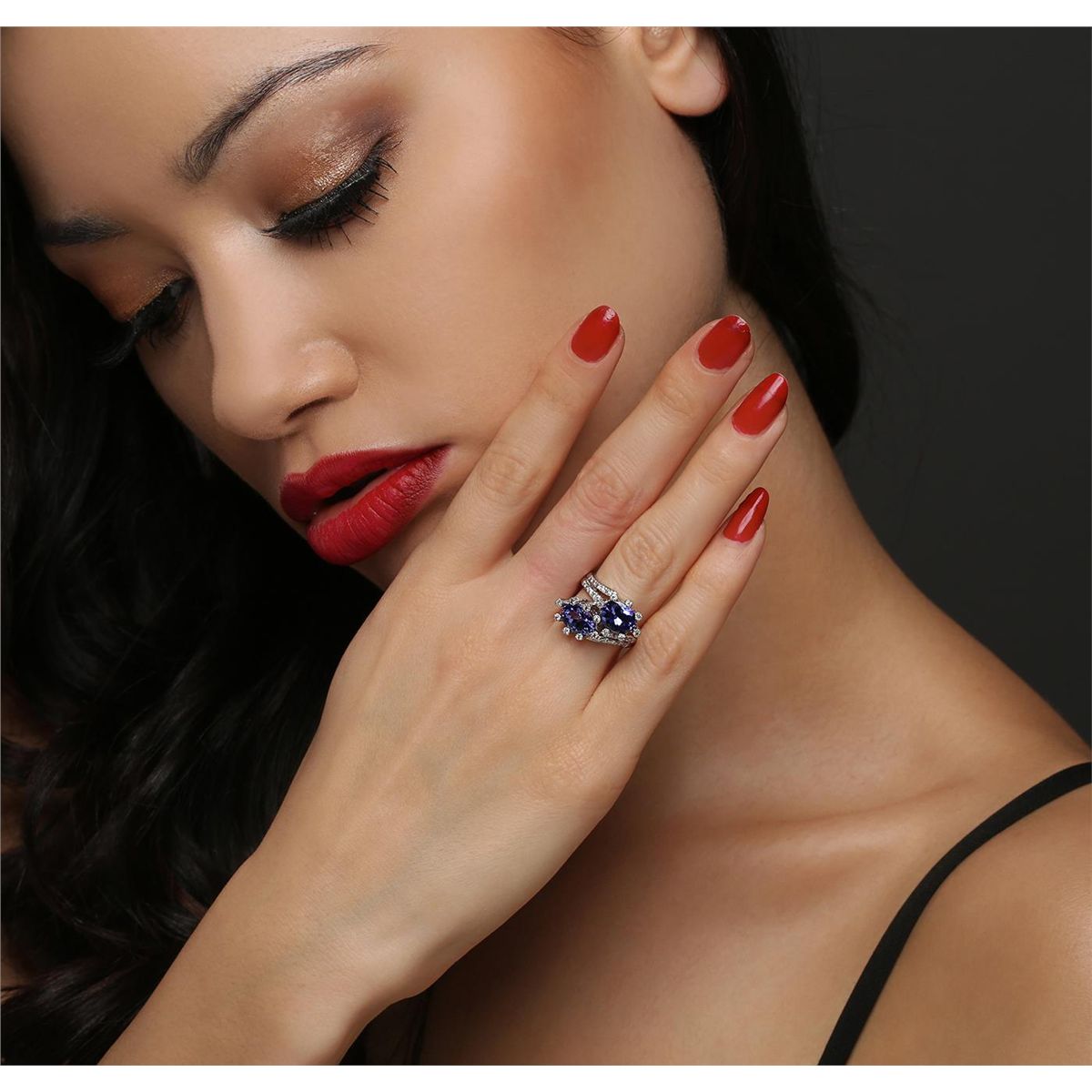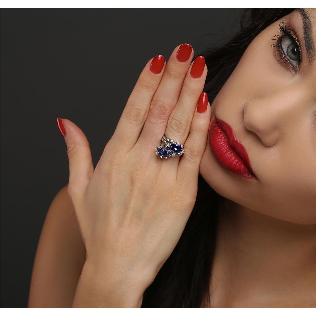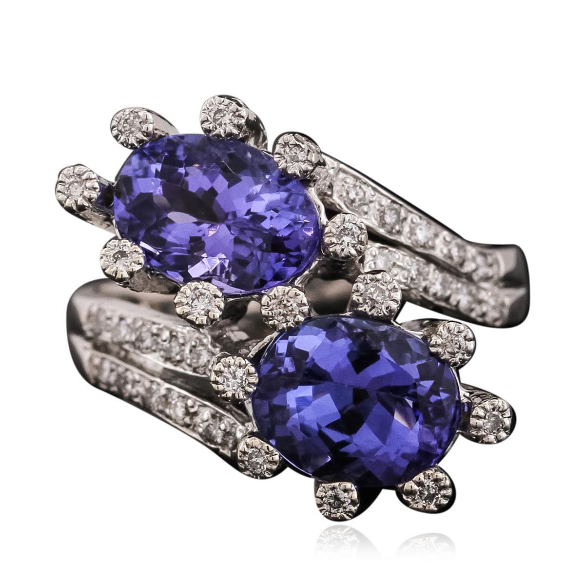 One electronically tested 14KT white gold ladies cast tanzanite and diamond ring. The ring features a stylized tanzanite and diamond bypass design, completed by a one and one-half millimeter wide band. Bright polish finish with milgrain detailing. Condition is new, good workmanship. Containing: Two prong set oval brilliant cut natural tanzanites, measuring 8.50 x 6.50 x 4.50mm, 8% bulge factor, approximate total weight of 3.66ct., clarity is eye clean, type I, medium dark, very slightly grayish, violetish blue color, (GIA vB 6/3), cut is good. Transmitting light with no distortion, transparent. Measurements & the color grade are an average for the pair. Graded in the setting. Tanzanite is a very rare gemstone that is only found in the country of Tanzania. Originally discovered in 1967. Tiffany & Company, named the stone Tanzanite. It is found in the Usumburu Mountains that border the Umba Valley of northern Tanzania. Tanzanite occurs in gray, brown, violet, blue, reddish-purple, & green. The gem is interesting because of its exceptional pleochroism. Rotated in different directions a tanzanite will exhibit multiple changes of color. Tanzanite has a low tolerance to ultrasonic cleaning, and should not be cleaned using this method. Seventy-Three prong set round brilliant cut diamonds, measuring 1.30 - 1.20 x 0.75mm (depth est.) approximate total weight of 73 Stones = 0.61ct. Graded in the setting. Clarity: SI-1 to I-1. Color: H - J. Total Weight of Colored Stones 3.66ct. Total Weight of Diamonds 0.61ct. Total Weight of Ring 5.29 grams. AIG Appraised at $10,000.00.
