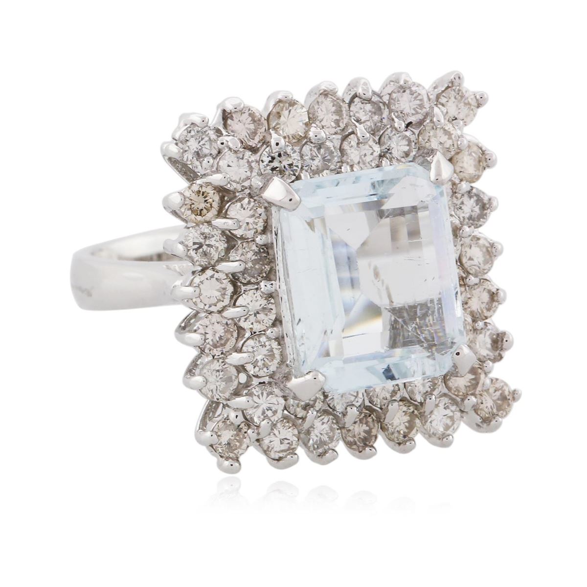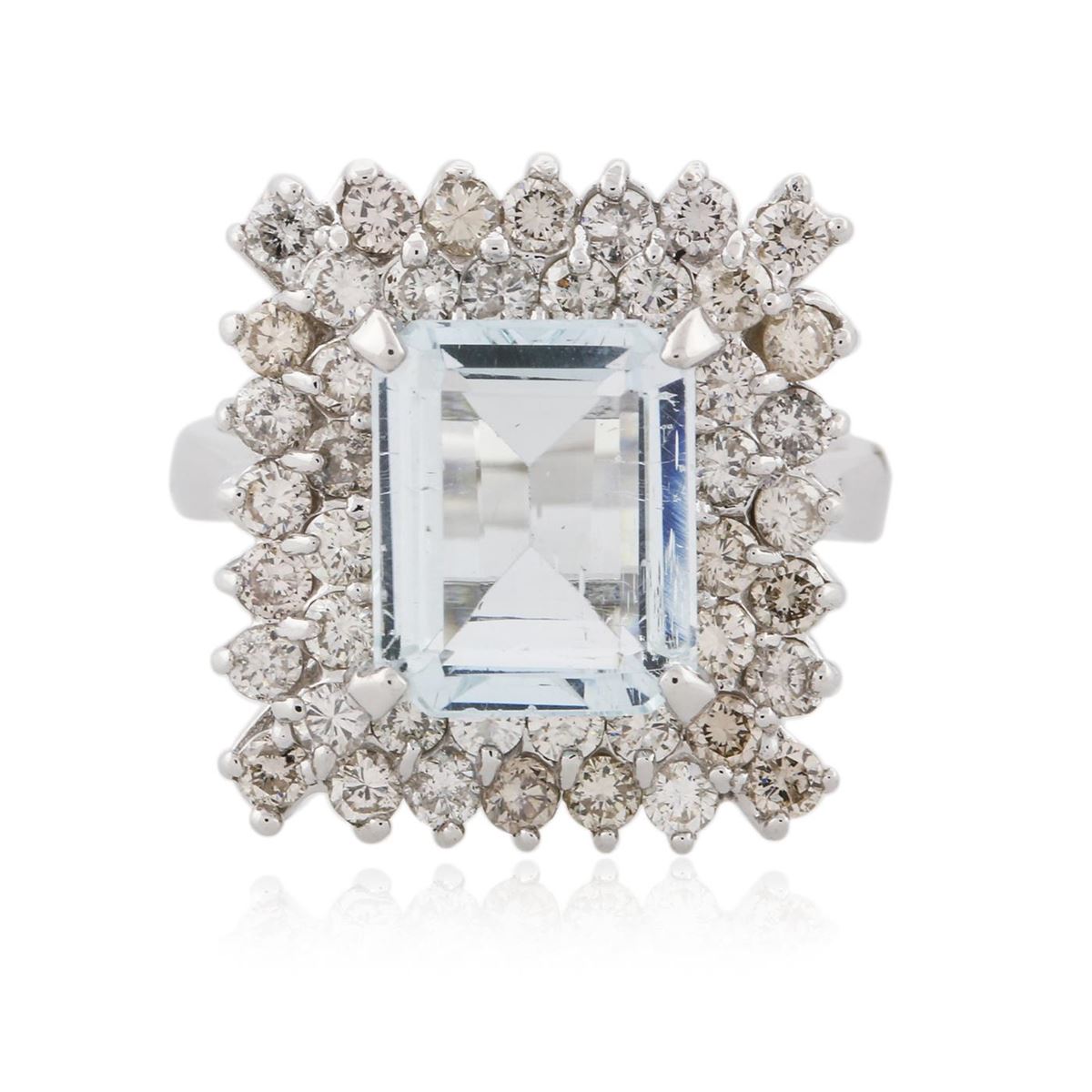 One electronically tested 14KT white gold ladies cast aquamarine and diamond ring with a bright polish finish. Condition is new, good workmanship. The featured aquamarine is set within two tiered diamond bezels supported by split shoulders, completed by a three and one-half millimeter wide band. Identified with markings of "K14". Containing: One prong set rectangular step cut natural aquamarine, measuring 10.40 x 8.15 x 4.85mm, 10%. bulge factor, approximate weight of 3.69ct., clarity is slightly included, type I, medium, very slightly grayish, very strongly greenish blue color, (GIA vstgB 5/3), cut is good. Transmitting light with a minimum of distortion, transparent. Naturally occurring internal & external characteristics are present. Refractive index testing results of 1.57 to 1.58. This is a conclusive result for beryl (aquamarine). Graded in the setting. Forty-Four prong set round brilliant cut diamonds, measuring 2.20 - 2.00 x 1.26mm (depth est.) approximate. Total Weight of 44 Stones = 1.59ct. Graded in the setting. Clarity: VS-2 to SI-2. Color: H - J. Total Weight of Colored Stones 3.69ct. Total Weight of Diamonds 1.59ct. Total Weight of Ring 7.86 grams. AIG Appraised at $8,085.00.