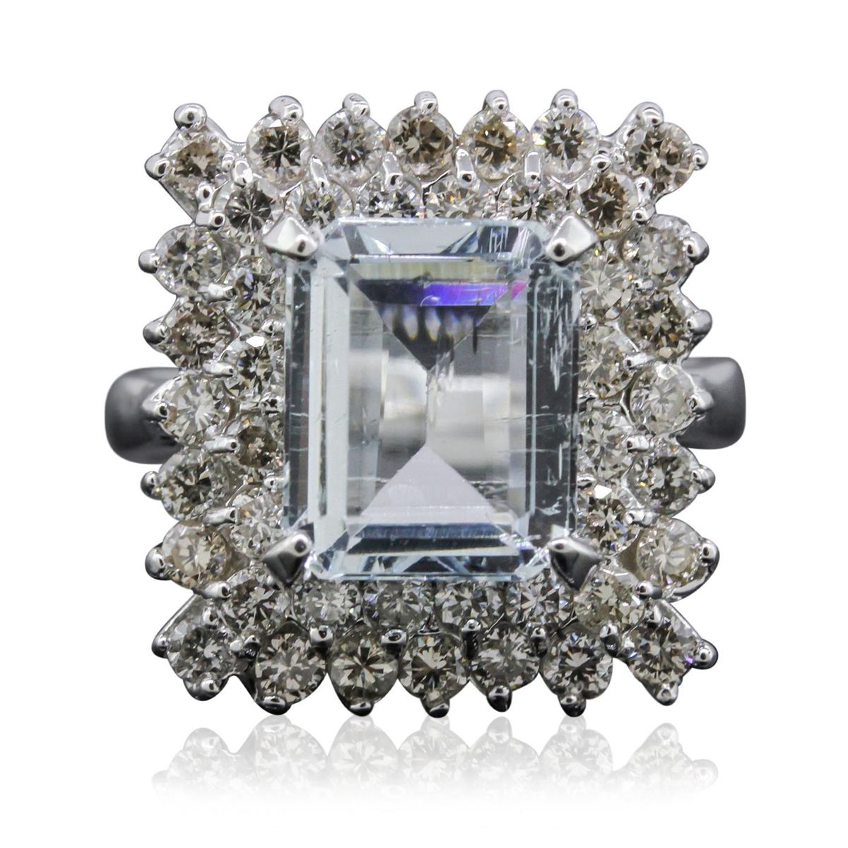 One electronically tested 14KT white gold ladies cast aquamarine and diamond ring with a bright polish finish. Condition is new, good workmanship. The featured aquamarine is set within two tiered diamond bezels supported by split shoulders, completed by a three and one-half millimeter wide band. Identified with markings of "K14". Containing: One prong set rectangular step cut natural aquamarine, measuring 10.40 x 8.15 x 4.85mm, 10%. bulge factor, approximate weight of 3.69ct., clarity is slightly included, type I, medium, very slightly grayish, very strongly greenish blue color, (GIA vstgB 5/3), cut is good. Transmitting light with a minimum of distortion, transparent. Naturally occurring internal & external characteristics are present. Refractive index testing results of 1.57 to 1.58. This is a conclusive result for beryl (aquamarine). Graded in the setting. Forty-Four prong set round brilliant cut diamonds, measuring 2.20 - 2.00 x 1.26mm (depth est.) approximate. Total Weight of 44 Stones = 1.59ct. Graded in the setting. Clarity: VS-2 to SI-2. Color: H - J. Total Weight of Colored Stones 3.69ct. Total Weight of Diamonds 1.59ct. Total Weight of Ring 7.86 grams. AIG Appraised at $8,085.00.
