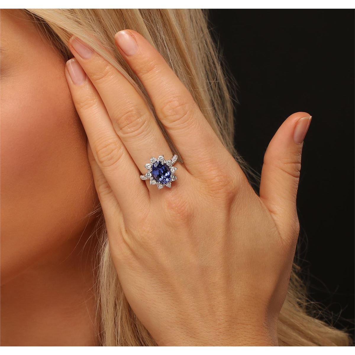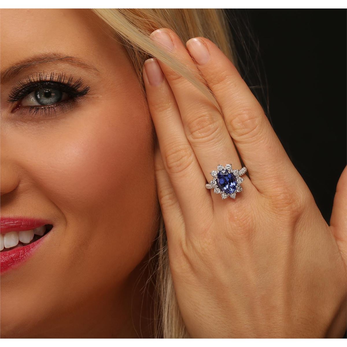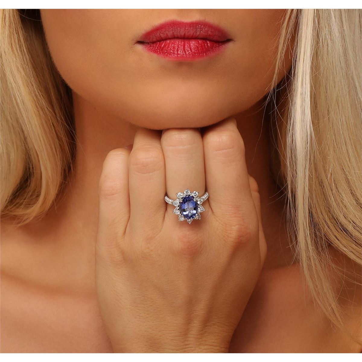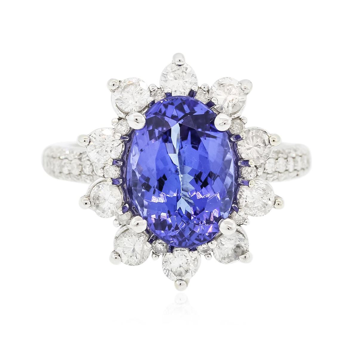 One electronically tested 14KT white gold ladies combination cast & assembled ring with a bright polish finish. Condition is new. Identified with markings of "14K". Containing: One prong set oval modified brilliant cut natural tanzanite, measuring 11.20 x 9.20 x 5.30mm, approximate weight of 3.69ct., clarity is eye clean, type I, medium, moderately strong, bluish violet color, (GIA bV 5/4), cut is good. Forty-Four prong set round brilliant cut diamonds, measuring 1.00 - 1.00 x 0.60mm (depth est.) approximate total weight of 44 Stones = 0.16ct. Clarity: I-1 to I-2. Color: H - I, Cut is Good. Ten prong set round brilliant cut diamonds, measuring 2.70 - 2.70 x 1.62mm (depth est.) approximate total weight of 10 Stones = 0.72ct. Clarity: SI-2 to I-1. Color: I - J, Cut is Good. Colored gemstones are presumed to have been subjected to commonly used enhancement processes. All diamonds and colored gemstones are graded in the mounting, unless otherwise stated. Total Weight of Colored Stones 3.69ct. Total Weight of Diamonds 0.88ct. Total Weight of Ring 5.00 grams. GGL Appraised at $9,080.00.