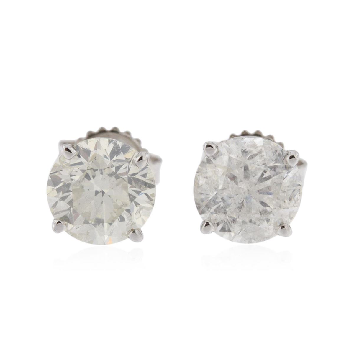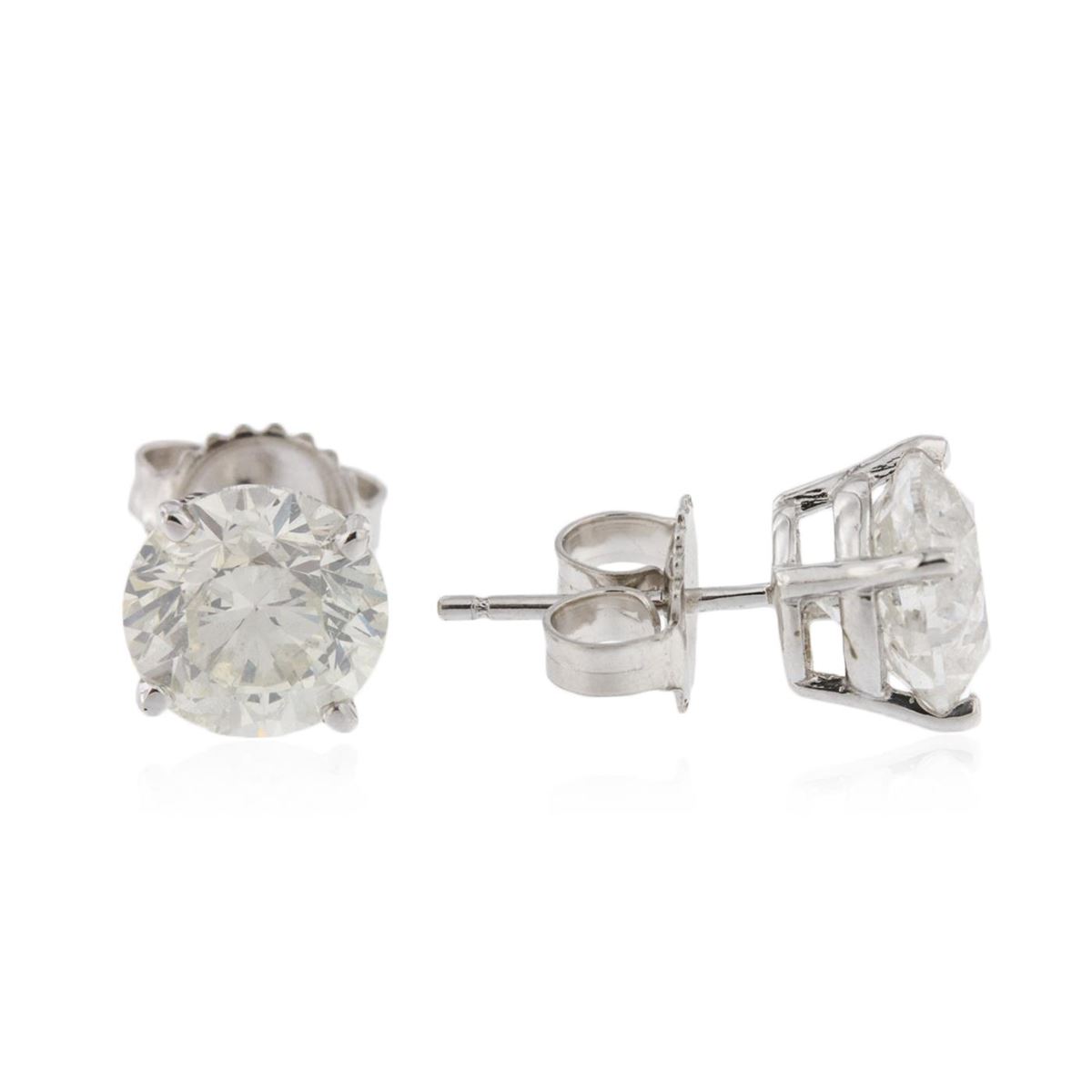 One electronically tested 14KT white gold Ladies cast stud earrings with friction posts with a bright polish finish. Condition is new. Identified with markings of "14K". Containing: One prong set round brilliant cut diamond, measuring 7.65 - 7.59 x 5.20mm (depth est.) approximate weight of 1.84ct. Clarity: SI-2. Color: K, Cut is Fair. One prong set round brilliant cut diamond, measuring 7.66 - 7.65 x 5.20mm (depth est.) approximate weight of 1.86ct. Clarity: I-3. Color: I, Cut is Fair. Total Weight of Diamonds 3.70ct. Total Weight of Earrings 2.00 grams. GGL Appraised at $27,165.00.