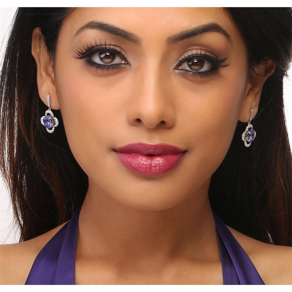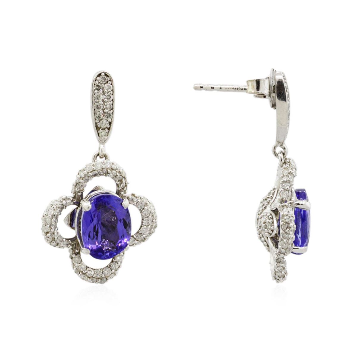 One pair electronically tested 14KT white gold ladies combination cast & assembled dangle earrings with hinged clip backs with a bright polish finish. Condition is new. Identified with markings of "14K". Containing: Two prong set oval modified brilliant cut natural tanzanites, measuring 8.80 x 6.90 x 4.49mm, approximate. Total Weight of 3.70ct., clarity is eye clean, type I, medium light, moderately strong, bluish violet color, (GIA bV 4/4), cut is good. One Hundred Sixty-Eight prong set round brilliant cut diamonds, measuring 1.30 - 1.30 x 0.78mm (depth est.) approximate. Total Weight of 168 Stones = 1.34ct. Clarity: I-1 to I-2. Color: I - J, Cut is Good. Colored gemstones are presumed to have been subjected to commonly used enhancement processes. All diamonds and colored gemstones are graded in the mounting, unless otherwise stated. Total Weight of Colored Stones 3.70ct. Total Weight of Diamonds 1.34ct. Total Weight of Earrings 5.40 grams. GGL Appraised at $8,660.00.
