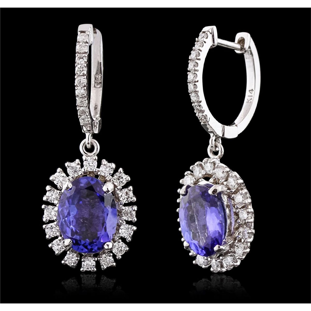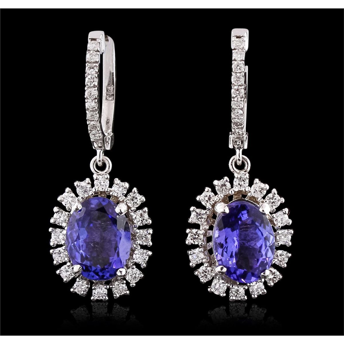 One pair electronically tested 14KT white gold ladies combination cast & assembled dangle earrings with hinged clip backs with a bright polish finish. Identified with markings of "14K". Condition is new. Containing: Two prong set oval modified brilliant cut natural tanzanites, measuring 9.20 x 6.70 x 4.36mm, approximate total weight of 3.70ct., clarity is eye clean, type I, medium, moderately strong, bluish violet color, (GIA bV 5/4), cut is good. Fifty prong set round brilliant cut diamonds, measuring 1.50 - 1.30 x 0.84mm (depth est.) approximate total weight of 50 Stones = 0.50ct. Clarity: I-1 to I-2. Color: I - J, Cut is Good. Colored gemstones are presumed to have been subjected to commonly used enhancement processes. All diamonds and colored gemstones are graded in the mounting, unless otherwise stated. Total Weight of Colored Stones 3.70ct. Total Weight of Diamonds 0.50ct. Total Weight of Earrings 6.80 grams. GGL Appraised at $8,465.00.