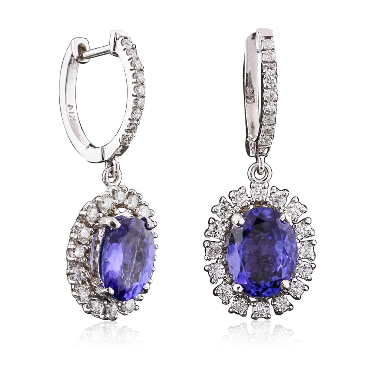 One pair electronically tested 14KT white gold ladies combination cast & assembled dangle earrings with hinged clip backs with a bright polish finish. Identified with markings of "14K". Condition is new. Containing: Two prong set oval modified brilliant cut natural tanzanites, measuring 9.20 x 6.70 x 4.36mm, approximate total weight of 3.70ct., clarity is eye clean, type I, medium, moderately strong, bluish violet color, (GIA bV 5/4), cut is good. Fifty prong set round brilliant cut diamonds, measuring 1.50 - 1.30 x 0.84mm (depth est.) approximate total weight of 50 Stones = 0.50ct. Clarity: I-1 to I-2. Color: I - J, Cut is Good. Colored gemstones are presumed to have been subjected to commonly used enhancement processes. All diamonds and colored gemstones are graded in the mounting, unless otherwise stated. Total Weight of Colored Stones 3.70ct. Total Weight of Diamonds 0.50ct. Total Weight of Earrings 6.80 grams. GGL Appraised at $8,465.00.