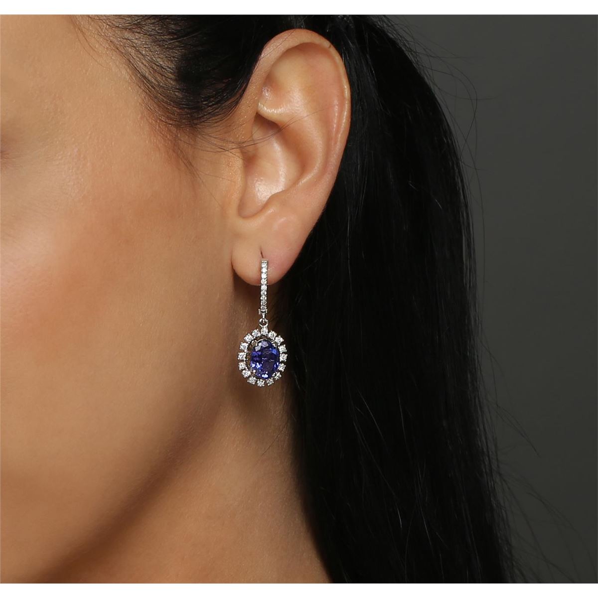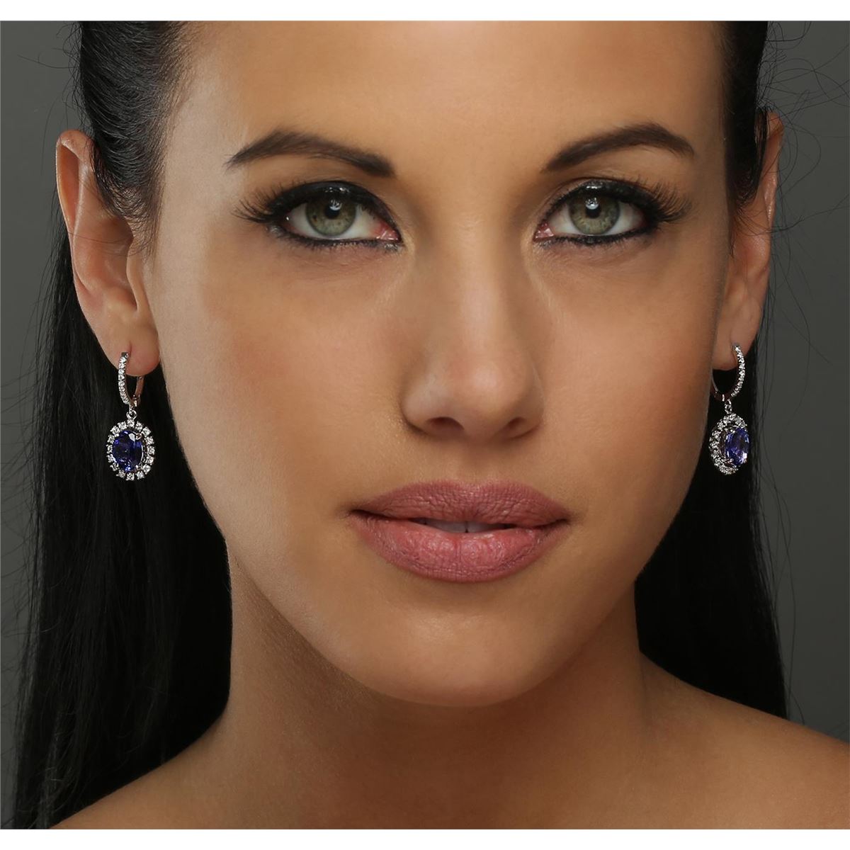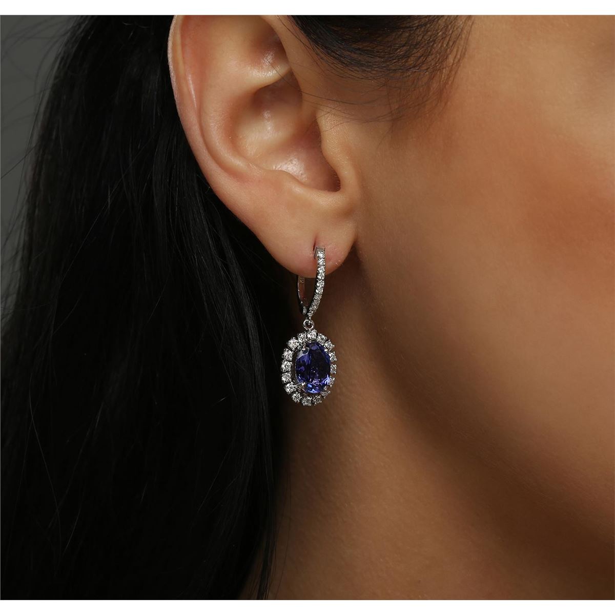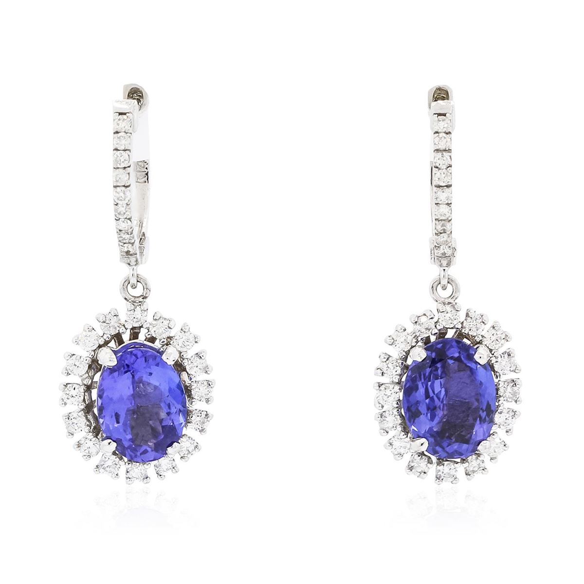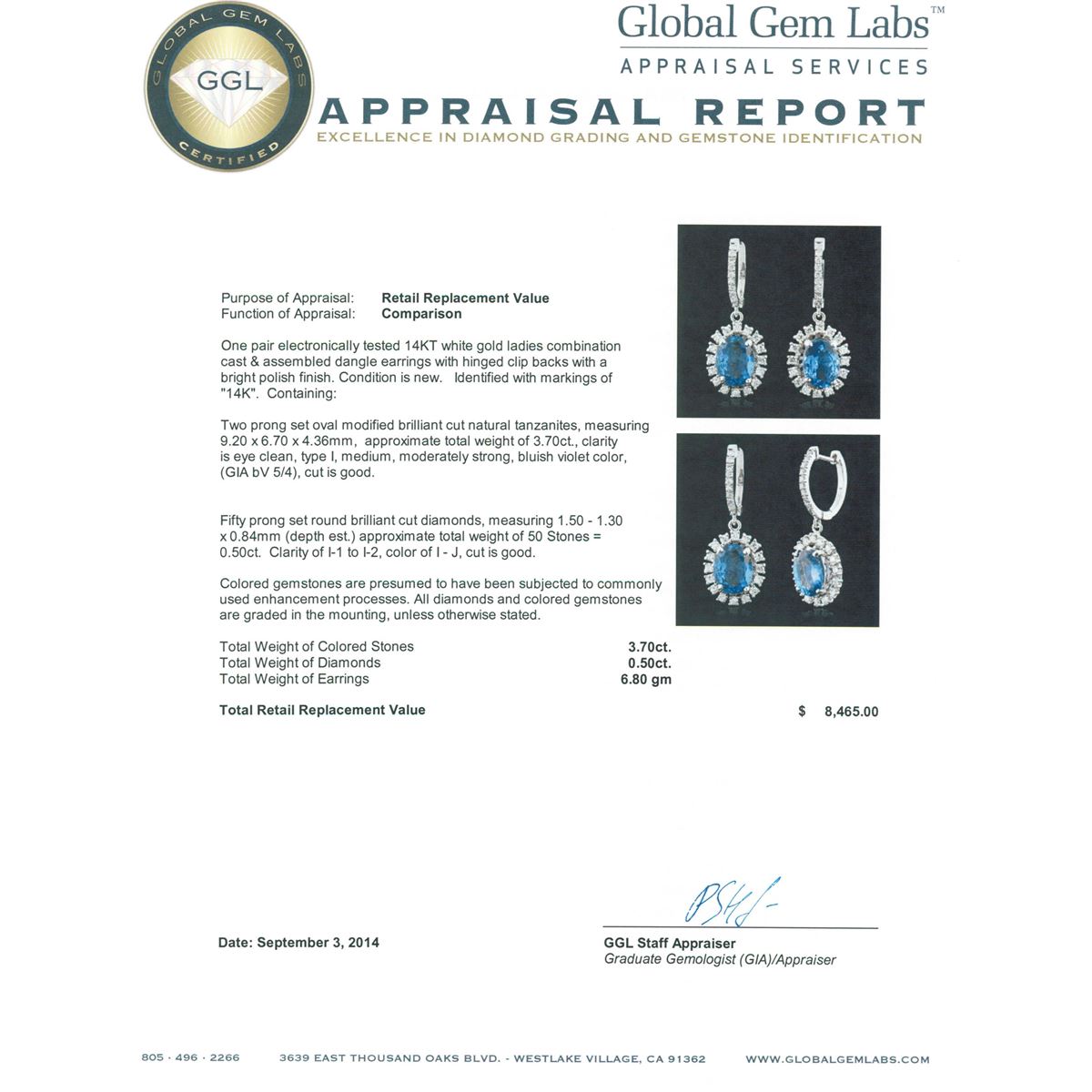 One pair electronically tested 14KT white gold ladies combination cast & assembled dangle earrings with hinged clip backs with a bright polish finish. Identified with markings of "14K". Condition is new. Containing: Two prong set oval modified brilliant cut natural tanzanites, measuring 9.20 x 6.70 x 4.36mm, approximate total weight of 3.70ct., clarity is eye clean, type I, medium, moderately strong, bluish violet color, (GIA bV 5/4), cut is good. Fifty prong set round brilliant cut diamonds, measuring 1.50 - 1.30 x 0.84mm (depth est.) approximate total weight of 50 Stones = 0.50ct. Clarity: I-1 to I-2. Color: I - J, Cut is Good. Colored gemstones are presumed to have been subjected to commonly used enhancement processes. All diamonds and colored gemstones are graded in the mounting, unless otherwise stated. Total Weight of Colored Stones 3.70ct. Total Weight of Diamonds 0.50ct. Total Weight of Earrings 6.80 grams. GGL Appraised at $8,465.00.