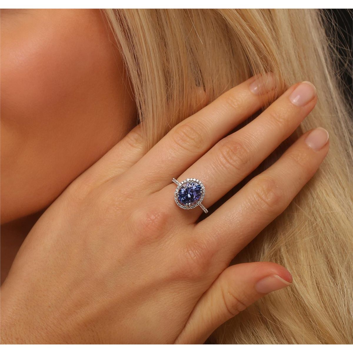 One electronically tested 14KT white gold ladies cast tanzanite and diamond ring with a bright polish finish. The featured tanzanite is set within a diamond bezel supported by diamond set shoulders, completed by a one and one-half millimeter wide band. Trademark is PMI. Identified with markings of "14K". Condition is new, good workmanship. Containing: One prong set oval brilliant cut natural tanzanite, measuring 10.55 x 8.50 x 5.65mm, 8%. bulge factor, approximate weight of 3.71ct., clarity is eye clean, type I, medium dark, very slightly grayish, bluish violet color, (GIA bV 6/3), cut is good. Transmitting light with no distortion, transparent. Graded in the setting. Tanzanite is a very rare gemstone that is only found in the country of Tanzania. Originally discovered in 1967. Tiffany & Company, named the stone Tanzanite. It is found in the Usumburu Mountains that border the Umba Valley of northern Tanzania. Tanzanite occurs in gray, brown, violet, blue, reddish-purple, & green. The gem is interesting because of its exceptional pleochroism. Rotated in different directions a tanzanite will exhibit multiple changes of color. Tanzanite has a low tolerance to ultrasonic cleaning, and should not be cleaned using this method. Forty-Two prong set round brilliant cut diamonds, measuring 1.10 - 1.00 x 0.63mm (depth est.) approximate total weight of 42 Stones = 0.27ct. Graded in the setting. Clarity: SI-1 to I-1. Color: H - J. Total Weight of Colored Stones 3.71ct. Total Weight of Diamonds 0.27ct. Total Weight of Ring 3.75 grams. AIG Appraised at $10,970.00.