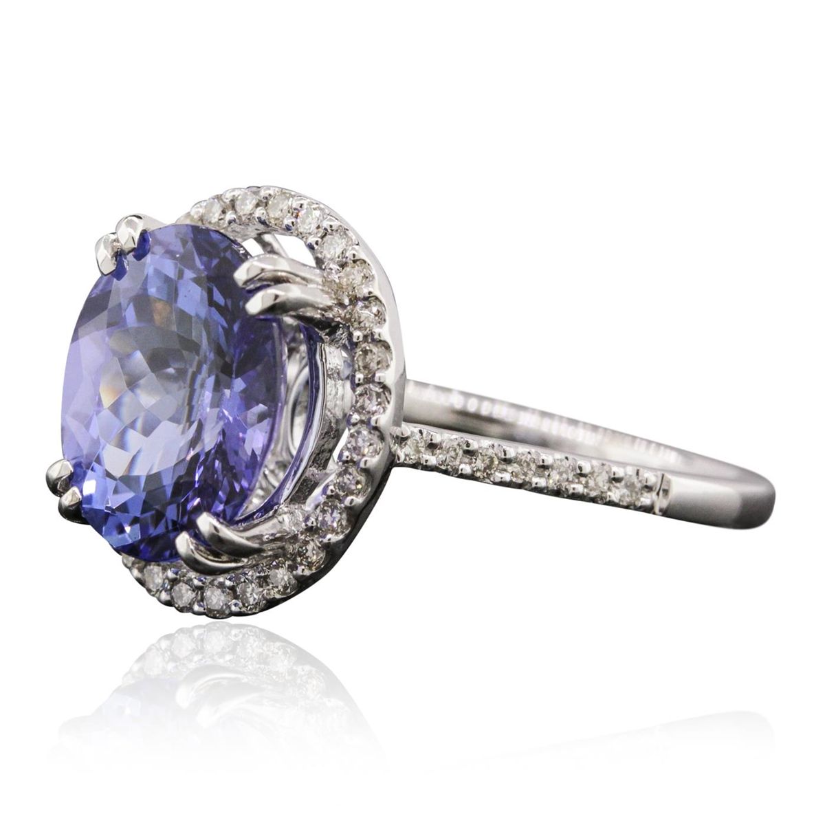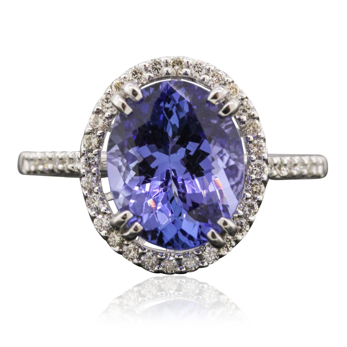One electronically tested 14KT white gold ladies cast tanzanite and diamond ring with a bright polish finish. The featured tanzanite is set within a diamond bezel supported by diamond set shoulders, completed by a one and one-half millimeter wide band. Trademark is PMI. Identified with markings of "14K". Condition is new, good workmanship. Containing: One prong set oval brilliant cut natural tanzanite, measuring 10.55 x 8.50 x 5.65mm, 8%. bulge factor, approximate weight of 3.71ct., clarity is eye clean, type I, medium dark, very slightly grayish, bluish violet color, (GIA bV 6/3), cut is good. Transmitting light with no distortion, transparent. Graded in the setting. Tanzanite is a very rare gemstone that is only found in the country of Tanzania. Originally discovered in 1967. Tiffany & Company, named the stone Tanzanite. It is found in the Usumburu Mountains that border the Umba Valley of northern Tanzania. Tanzanite occurs in gray, brown, violet, blue, reddish-purple, & green. The gem is interesting because of its exceptional pleochroism. Rotated in different directions a tanzanite will exhibit multiple changes of color. Tanzanite has a low tolerance to ultrasonic cleaning, and should not be cleaned using this method. Forty-Two prong set round brilliant cut diamonds, measuring 1.10 - 1.00 x 0.63mm (depth est.) approximate total weight of 42 Stones = 0.27ct. Graded in the setting. Clarity: SI-1 to I-1. Color: H - J. Total Weight of Colored Stones 3.71ct. Total Weight of Diamonds 0.27ct. Total Weight of Ring 3.75 grams. AIG Appraised at $10,970.00.