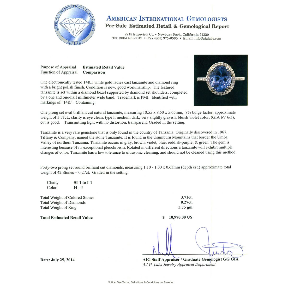 One electronically tested 14KT white gold ladies cast tanzanite and diamond ring with a bright polish finish. The featured tanzanite is set within a diamond bezel supported by diamond set shoulders, completed by a one and one-half millimeter wide band. Trademark is PMI. Identified with markings of "14K". Condition is new, good workmanship. Containing: One prong set oval brilliant cut natural tanzanite, measuring 10.55 x 8.50 x 5.65mm, 8%. bulge factor, approximate weight of 3.71ct., clarity is eye clean, type I, medium dark, very slightly grayish, bluish violet color, (GIA bV 6/3), cut is good. Transmitting light with no distortion, transparent. Graded in the setting. Tanzanite is a very rare gemstone that is only found in the country of Tanzania. Originally discovered in 1967. Tiffany & Company, named the stone Tanzanite. It is found in the Usumburu Mountains that border the Umba Valley of northern Tanzania. Tanzanite occurs in gray, brown, violet, blue, reddish-purple, & green. The gem is interesting because of its exceptional pleochroism. Rotated in different directions a tanzanite will exhibit multiple changes of color. Tanzanite has a low tolerance to ultrasonic cleaning, and should not be cleaned using this method. Forty-Two prong set round brilliant cut diamonds, measuring 1.10 - 1.00 x 0.63mm (depth est.) approximate total weight of 42 Stones = 0.27ct. Graded in the setting. Clarity: SI-1 to I-1. Color: H - J. Total Weight of Colored Stones 3.71ct. Total Weight of Diamonds 0.27ct. Total Weight of Ring 3.75 grams. AIG Appraised at $10,970.00.