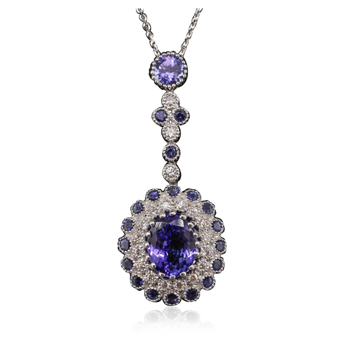 One electronically tested 14KT white gold ladies cast & assembled tanzanite and diamond pendant with chain. Condition is new, good workmanship. The pendant features a tanzanite and diamond floret completed by a tanzanite set bail. The pendant is supported by an eighteen inch length 14KT white gold designer style chain terminating in a spring ring clasp. Bright polish finish. Trademark is Orianne. Identified with markings of "14K". Containing: One prong set oval mixed cut natural tanzanite, measuring 10.30 x 7.80 x 4.70mm, approximate weight of 2.58ct., clarity is eye clean, type I, medium, very slightly grayish, bluish violet color, (GIA bV 5/3), cut is good. Transmitting light with no distortion, transparent. Graded in the setting. One prong set round mixed cut natural tanzanite, measuring 5.10 - 5.00 x 3.28 mm, approximate weight of 0.57ct., clarity is eye clean, type I, medium, very slightly grayish, violet color, (GIA V 5/3), cut is good. Transmitting light with no distortion, transparent. Graded in the setting. Nineteen prong set round brilliant cut natural tanzanites, measuring 2.00 - 1.80 x 1.24 mm, approximate total weight of 0.57ct., clarity is eye clean, type I, medium dark, very slightly grayish, violet color, (GIA V 6/3), cut is good. Transmitting light with no distortion, transparent. Color grade is an average for the group. Graded in the setting. Tanzanite is a very rare gemstone that is only found in the country of Tanzania. Originally discovered in 1967. Tiffany & Company, named the stone Tanzanite. It is found in the Usumburu Mountains that border the Umba Valley of northern Tanzania. Tanzanite occurs in gray, brown, violet, blue, reddish-purple, & green. The gem is interesting because of its exceptional pleochroism. Rotated in different directions a tanzanite will exhibit multiple changes of color. Tanzanite has a low tolerance to ultrasonic cleaning, and should not be cleaned using this method. Nineteen prong set round brilliant cut diamonds, measuring 2.00 - 1.40 x 1.02mm (depth est.) approximate. Total Weight of 19 Stones = 0.59ct. Graded in the setting. Clarity: SI-1 to I-1. Color: G - I. Total Weight of Colored Stones 3.72ct. Total Weight of Diamonds 0.59ct. Total Weight of Pendant With Chain 6.70 grams. AIG Appraised at $8,840.00.