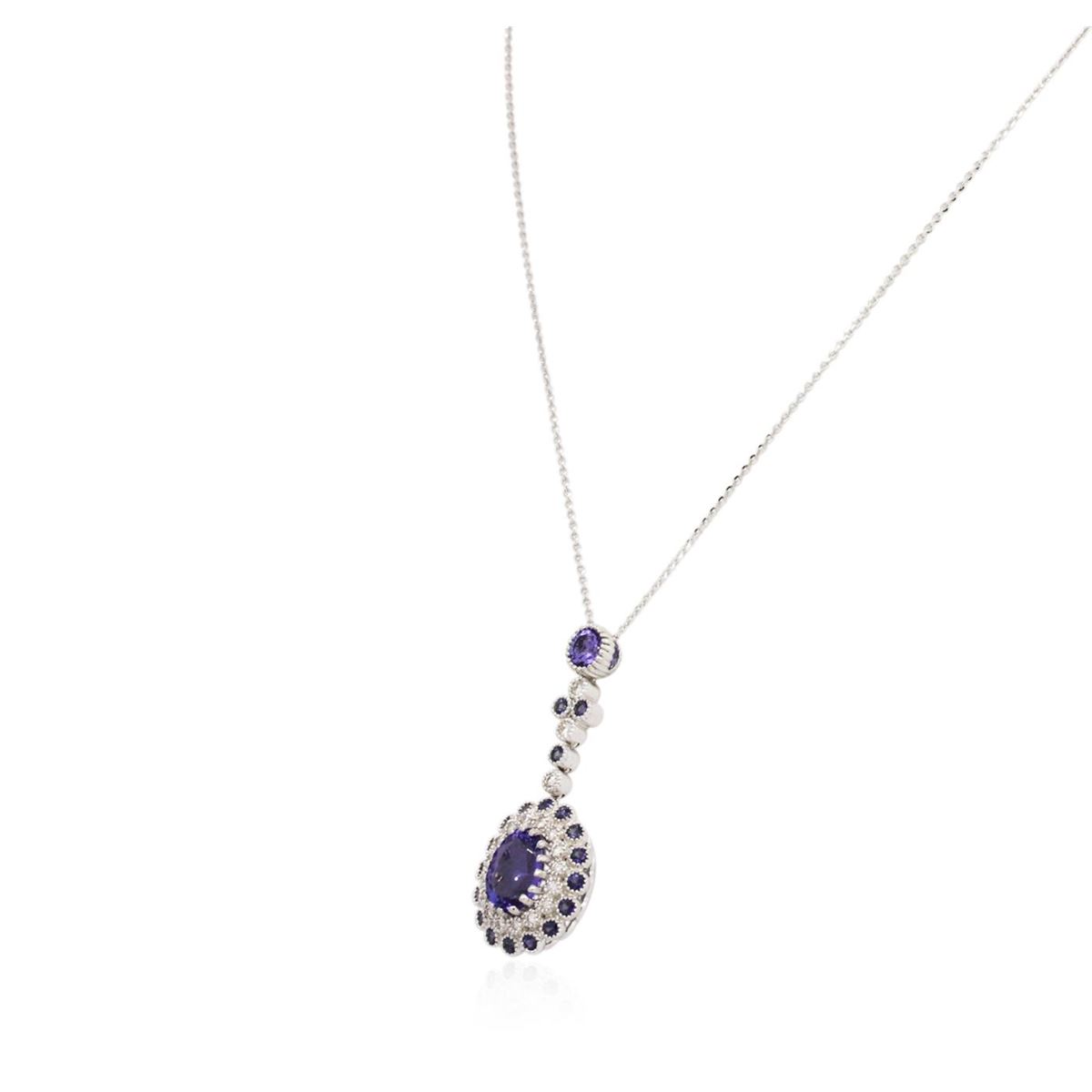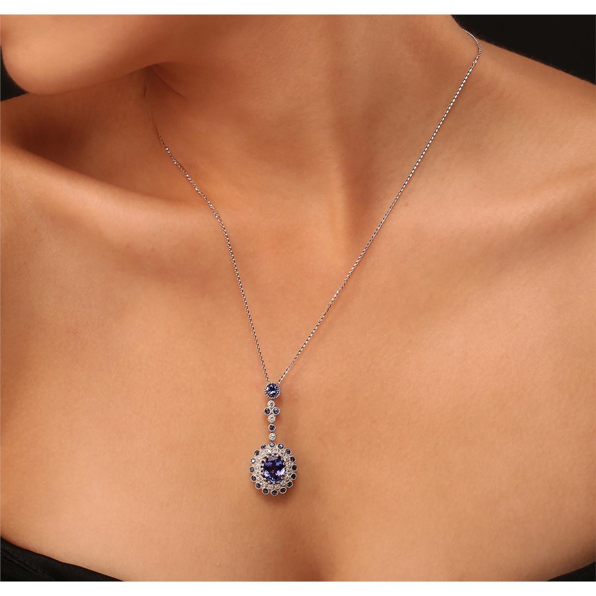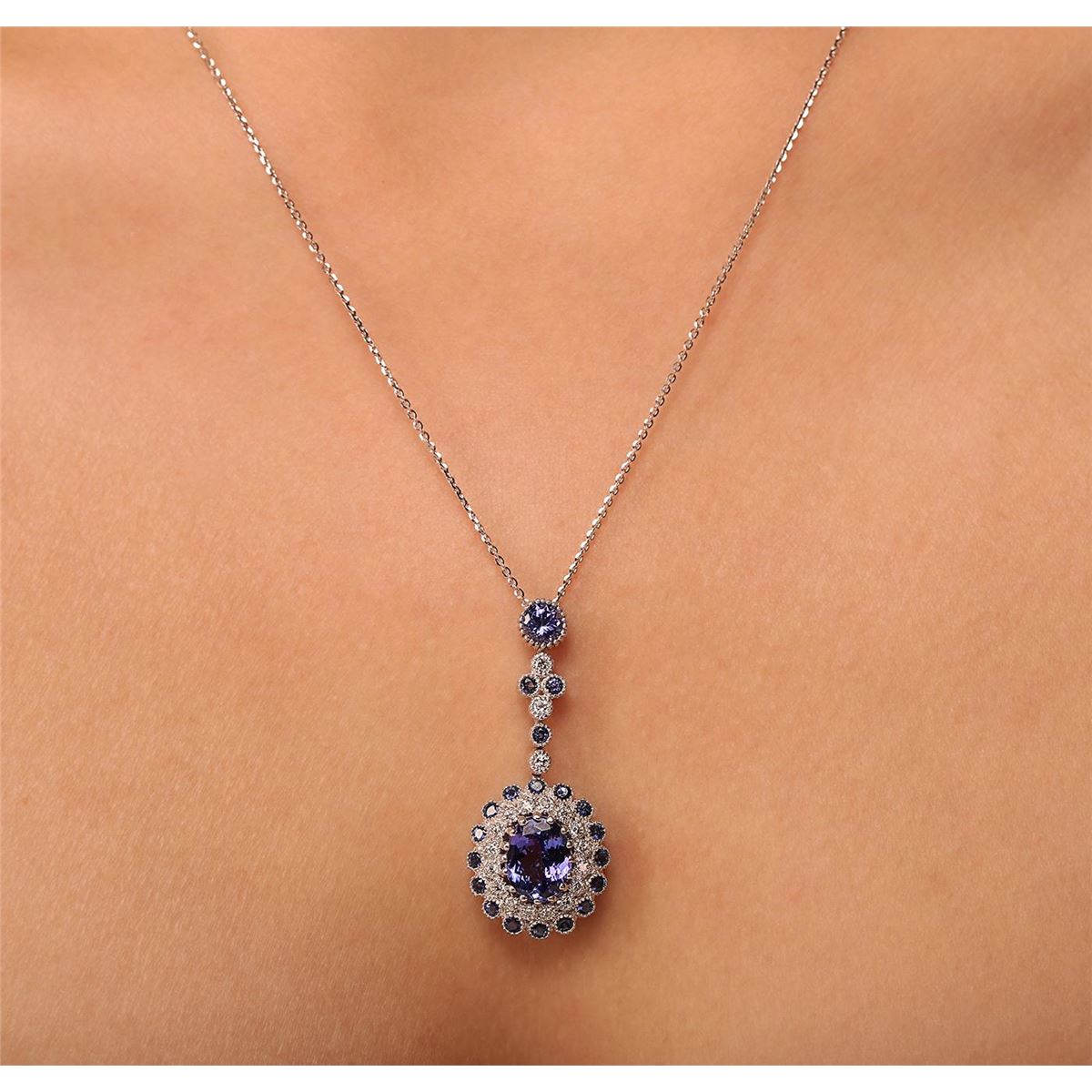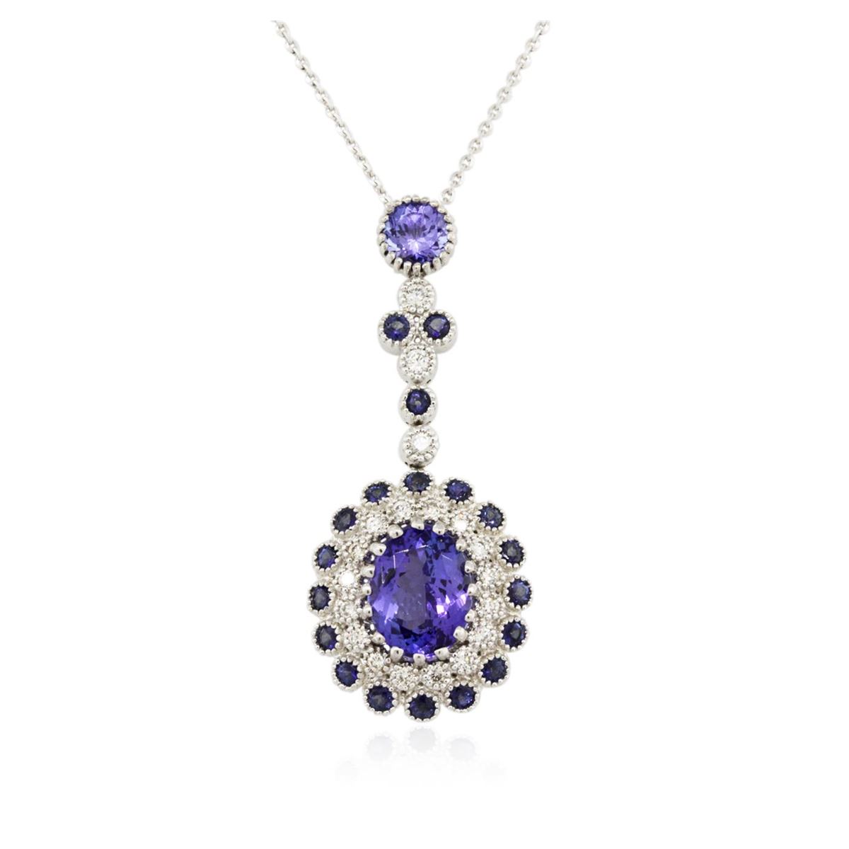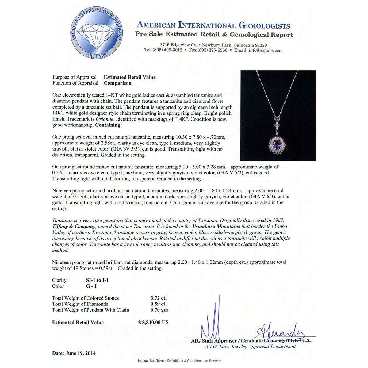 One electronically tested 14KT white gold ladies cast & assembled tanzanite and diamond pendant with chain. Condition is new, good workmanship. The pendant features a tanzanite and diamond floret completed by a tanzanite set bail. The pendant is supported by an eighteen inch length 14KT white gold designer style chain terminating in a spring ring clasp. Bright polish finish. Trademark is Orianne. Identified with markings of "14K". Containing: One prong set oval mixed cut natural tanzanite, measuring 10.30 x 7.80 x 4.70mm, approximate weight of 2.58ct., clarity is eye clean, type I, medium, very slightly grayish, bluish violet color, (GIA bV 5/3), cut is good. Transmitting light with no distortion, transparent. Graded in the setting. One prong set round mixed cut natural tanzanite, measuring 5.10 - 5.00 x 3.28 mm, approximate weight of 0.57ct., clarity is eye clean, type I, medium, very slightly grayish, violet color, (GIA V 5/3), cut is good. Transmitting light with no distortion, transparent. Graded in the setting. Nineteen prong set round brilliant cut natural tanzanites, measuring 2.00 - 1.80 x 1.24 mm, approximate total weight of 0.57ct., clarity is eye clean, type I, medium dark, very slightly grayish, violet color, (GIA V 6/3), cut is good. Transmitting light with no distortion, transparent. Color grade is an average for the group. Graded in the setting. Tanzanite is a very rare gemstone that is only found in the country of Tanzania. Originally discovered in 1967. Tiffany & Company, named the stone Tanzanite. It is found in the Usumburu Mountains that border the Umba Valley of northern Tanzania. Tanzanite occurs in gray, brown, violet, blue, reddish-purple, & green. The gem is interesting because of its exceptional pleochroism. Rotated in different directions a tanzanite will exhibit multiple changes of color. Tanzanite has a low tolerance to ultrasonic cleaning, and should not be cleaned using this method. Nineteen prong set round brilliant cut diamonds, measuring 2.00 - 1.40 x 1.02mm (depth est.) approximate. Total Weight of 19 Stones = 0.59ct. Graded in the setting. Clarity: SI-1 to I-1. Color: G - I. Total Weight of Colored Stones 3.72ct. Total Weight of Diamonds 0.59ct. Total Weight of Pendant With Chain 6.70 grams. AIG Appraised at $8,840.00.