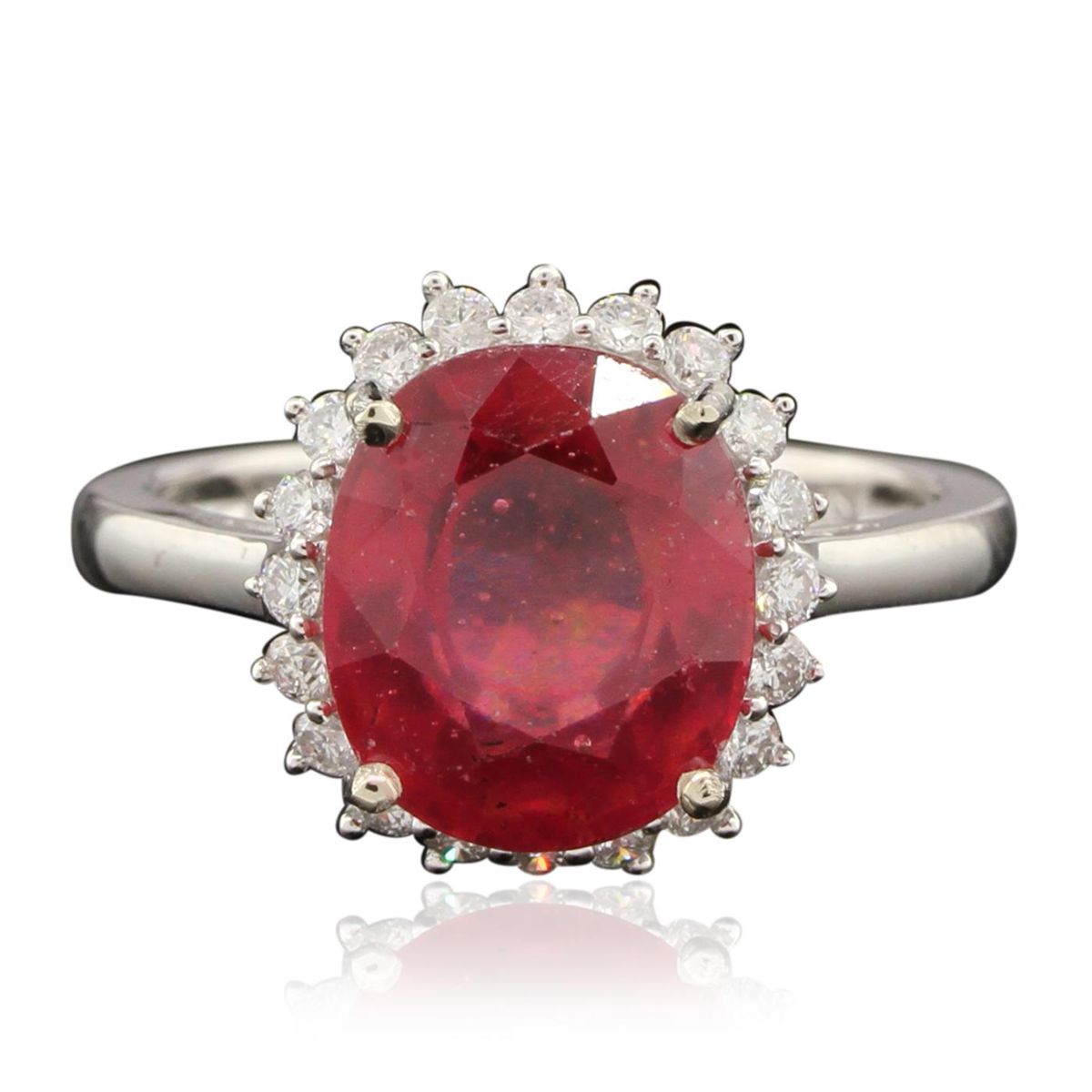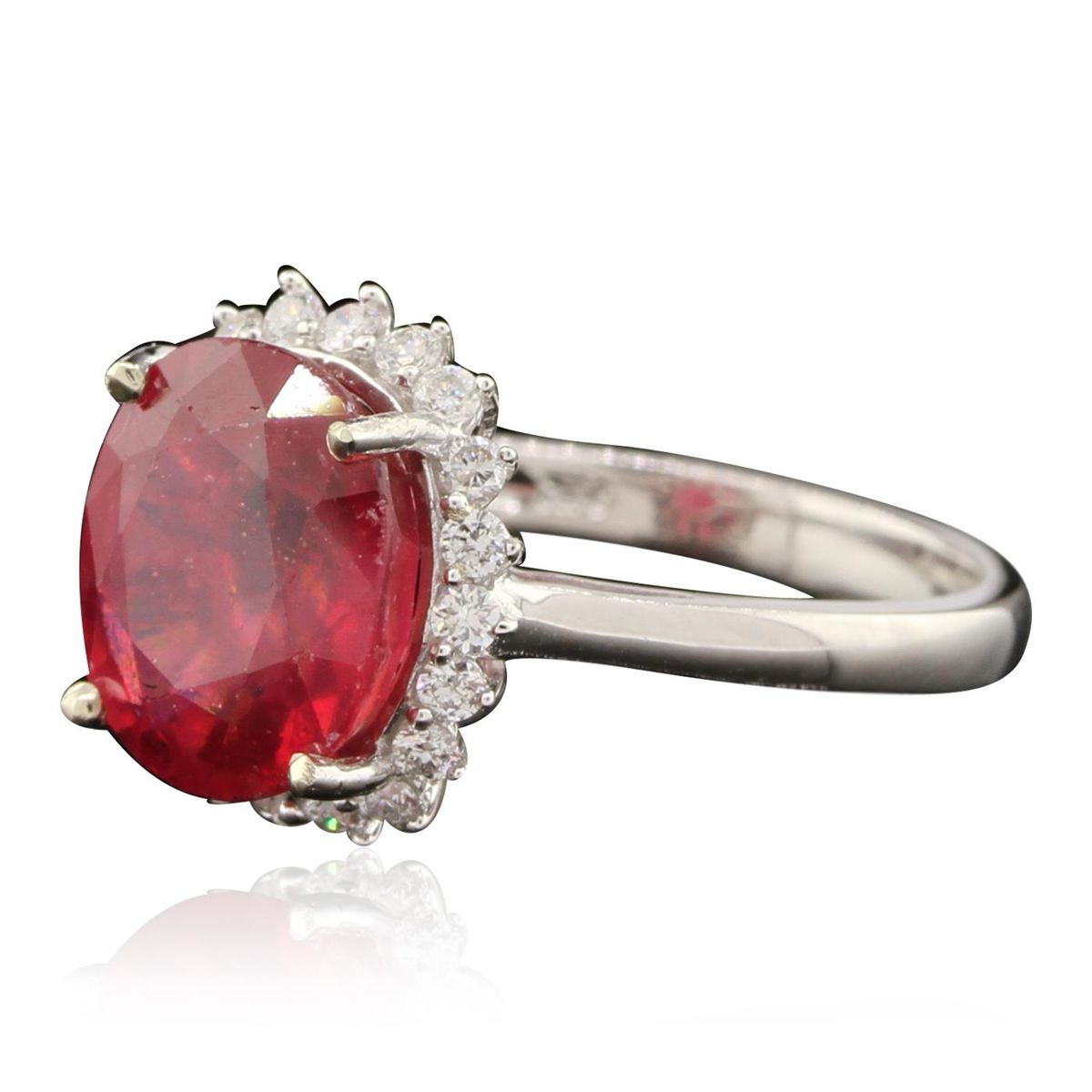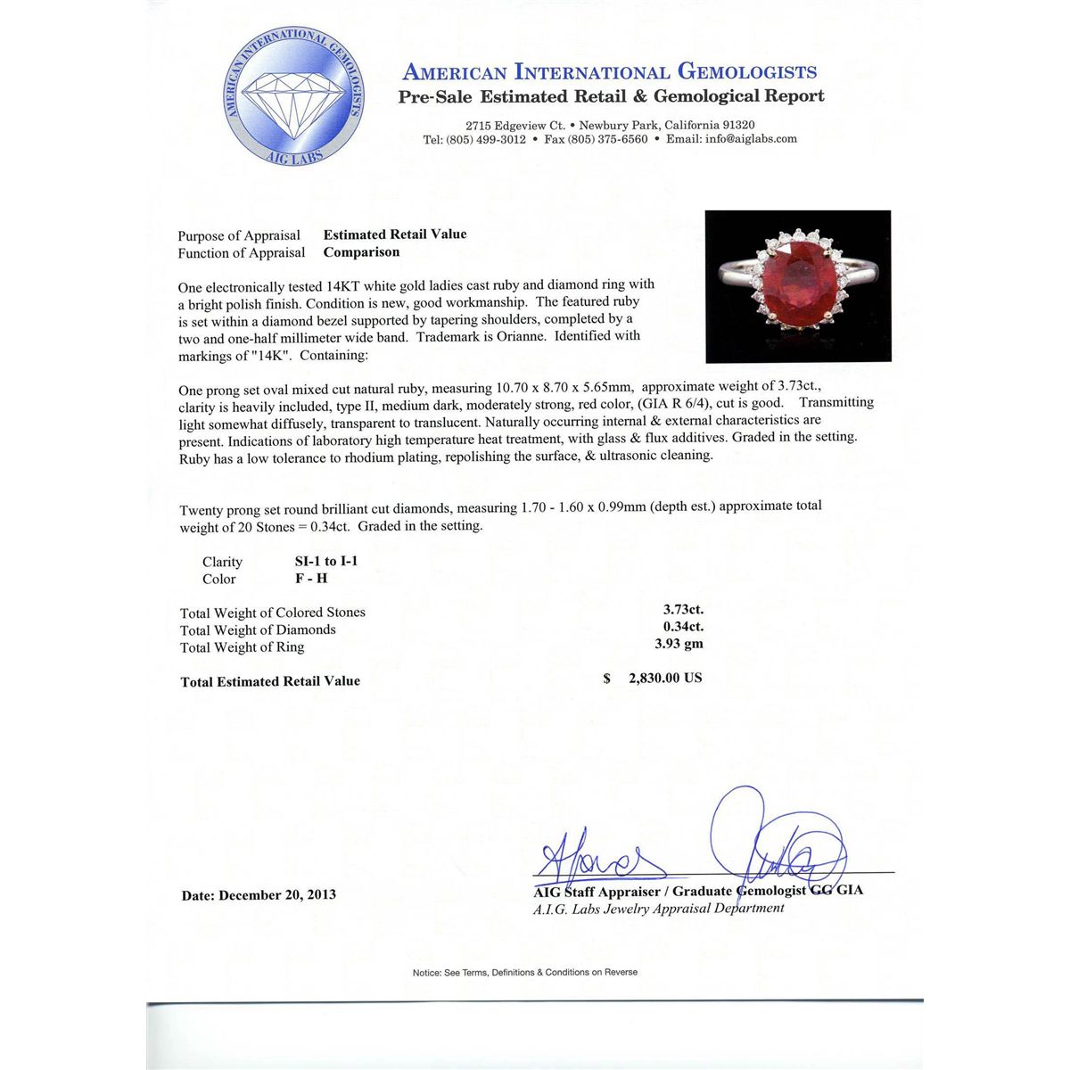 14KT white gold 3.73ct Ruby and Diamond Ring A6567. One electronically tested 14KT white gold ladies cast ruby and diamond ring with a bright polish finish. The featured ruby is set within a diamond bezel supported by tapering shoulders, completed by a two and one-half millimeter wide band. Trademark is Orianne. Identified with markings of "14K". Condition is new, good workmanship. Containing: One prong set oval mixed cut natural ruby, measuring 10.70 x 8.70 x 5.65mm, approximate weight of 3.73ct., clarity is heavily included, type II, medium dark, moderately strong, red color, (GIA R 6/4), cut is good. Transmitting light somewhat diffusely, transparent to translucent. Naturally occurring internal & external characteristics are present. Indications of laboratory high temperature heat treatment, with glass & flux additives. Graded in the setting. Ruby has a low tolerance to rhodium plating, repolishing the surface, & ultrasonic cleaning.Twenty prong set round brilliant cut diamonds, measuring 1.70 - 1.60 x 0.99mm (depth est.) approximate. Total Weight of 20 Stones = 0.34ct. Graded in the setting. Clarity: SI-1 to I-1. Color: F - H. Total Weight of Colored Stones 3.73ct. Total Weight of Diamonds 0.34ct. AIG Appraised at $2,830.00.